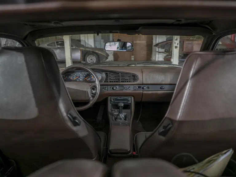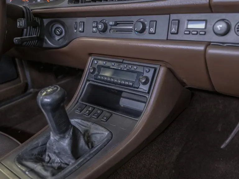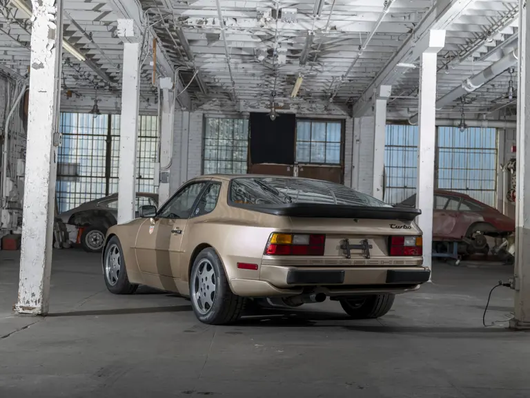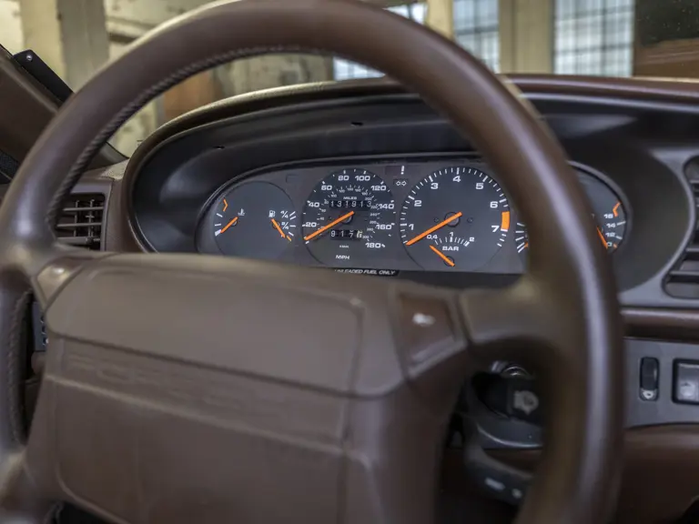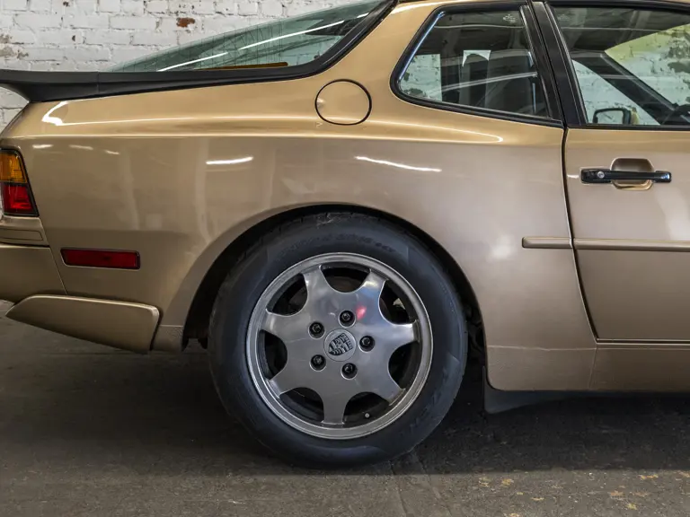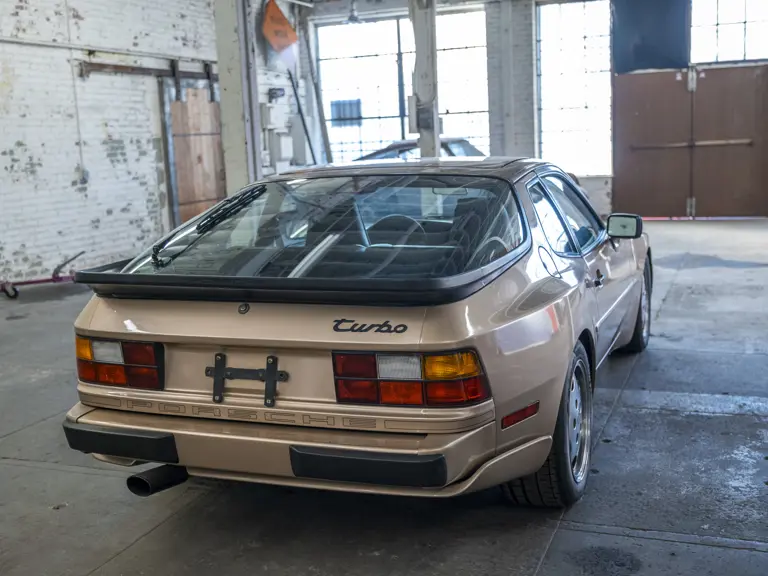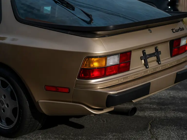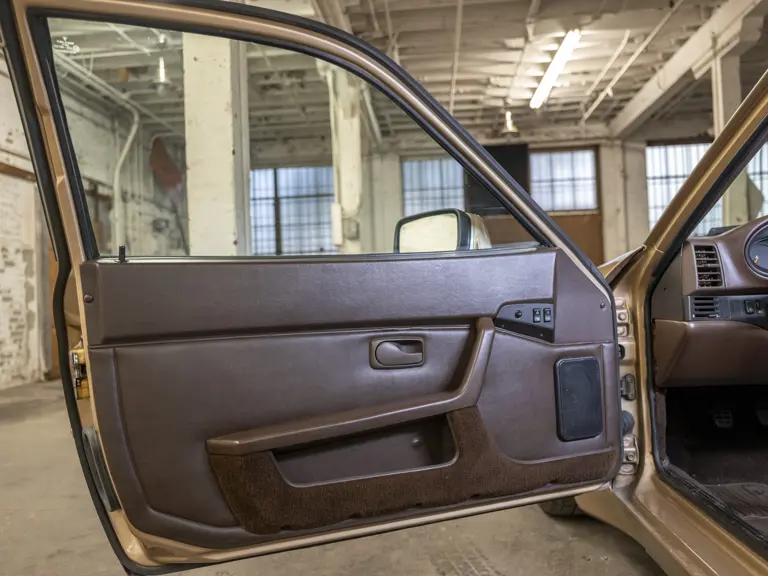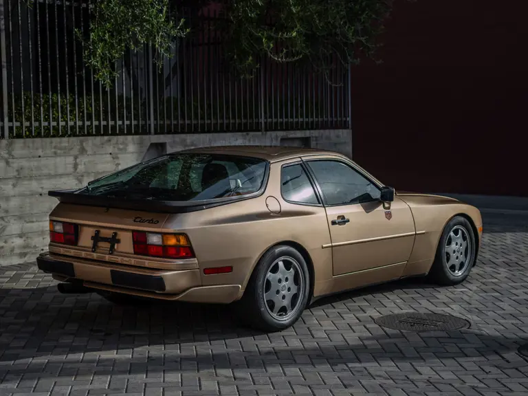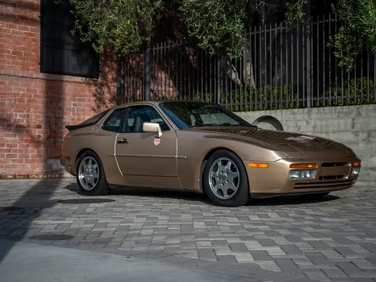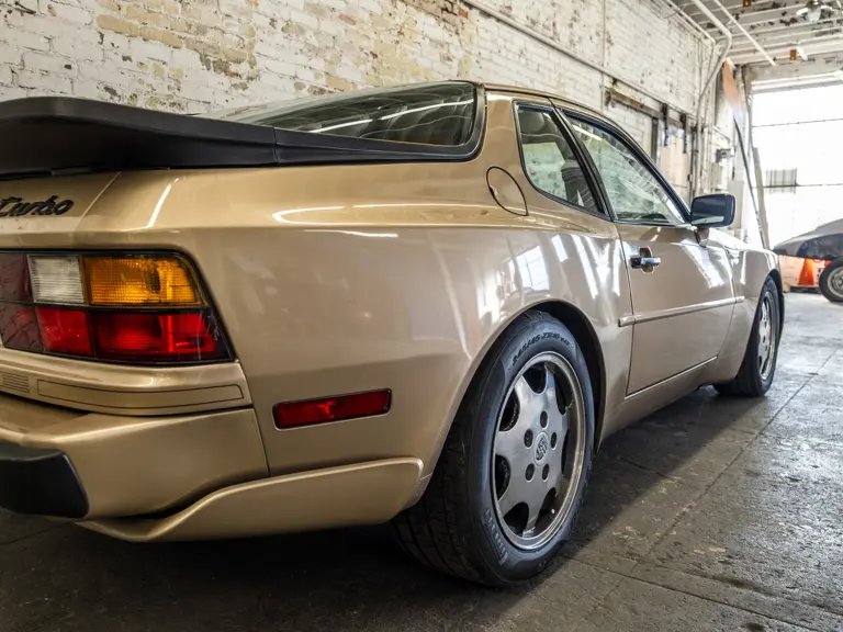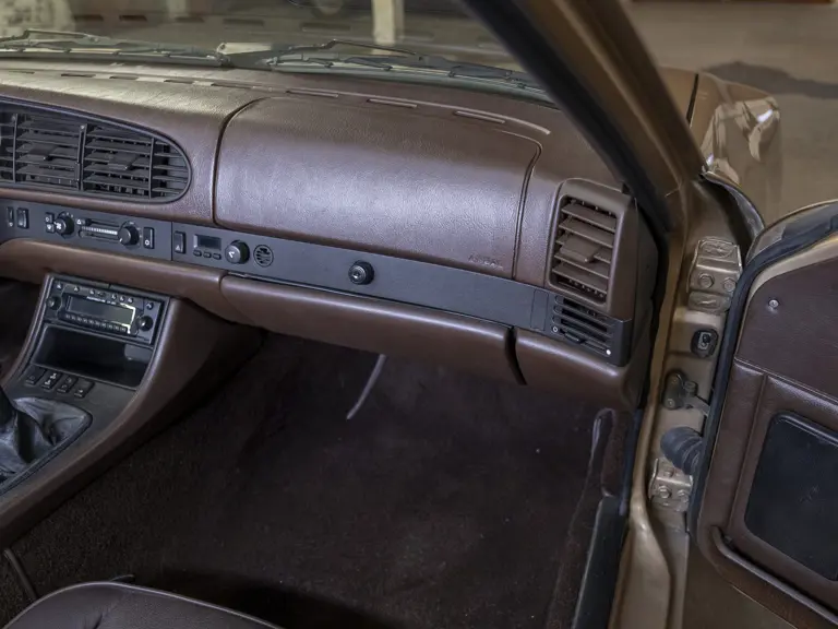 Reported by Magnus Walker to be a long-term California car, this 944 Turbo is finished in Almond Beige Metallic over brown partial leather trim. Equipped with a five-speed manual transaxle, sliding sunroof, and cruise control, its odometer read 131,913 miles at the time of cataloguing.