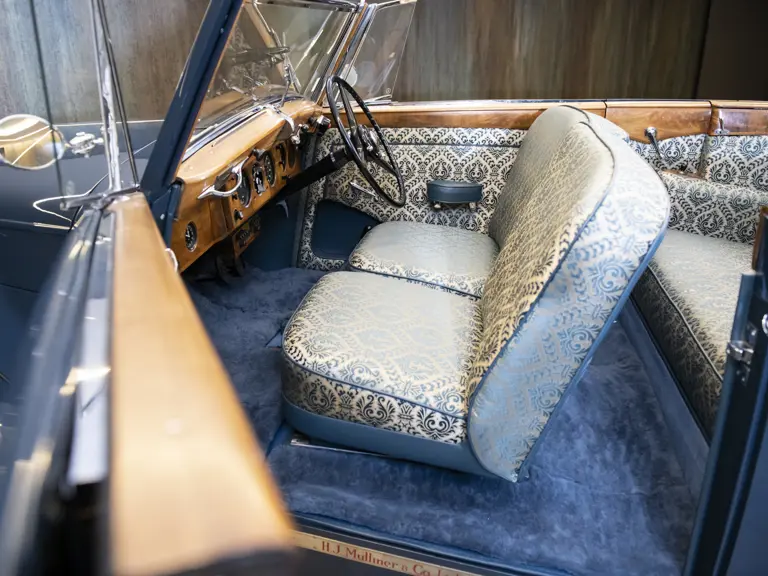 Detailed build specifications indicate that the Maharaja’s Bentley was to be supplied as a Drophead Coupé with concealed hood, the latter folding under a cleverly designed rear platform that closed nearly flush with the body, creating a smooth and dashing appearance. Fewer than a dozen Mark VIs were delivered with this coachwork, but suffice to say, none looked quite like this one. Virtually every feature of the car was bespoke, as noted in the highly detailed build records, the Maharaja requesting a closed and lockable glove box, an opening windscreen for ventilation, and a floor heater, among other special touches. Two front seats were fitted in this right-hand drive Bentley, each individually adjustable but designed so as to permit the occasional carriage of three people riding abreast. The armrests fitted to the doors could be folded upwards, revealing humidor compartments for cigars.