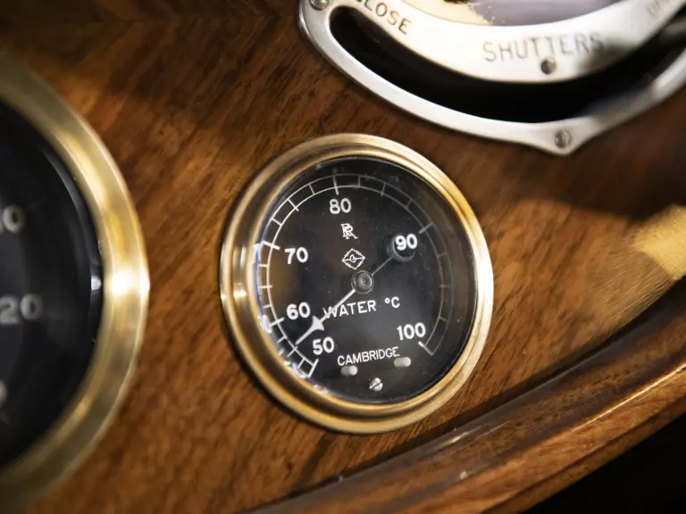 Rolls-Royce build documents, copies of which are on file, note that the right-hand drive car was supplied with full nickel fittings, a luggage rack, speaking tube, interior electric lights, polished instrument panel, and a division glass. The Lucas headlamps were equipped with Barker’s patented dipping system, allowing them to be lowered so as not to blind oncoming traffic. Full Triplex glass was provided all around, including to the division glass that overlooked a removable occasional seat.