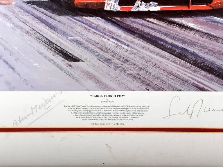 A limited edition print, numbered 127/500. Signed by Arturo Mezario and Sandro Munari, who drove the Ferrari 312 PB in the 1972 Targa Florio.