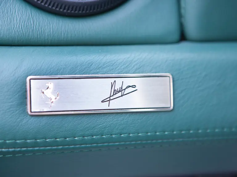 Présentée dans une combinaison de teintes inhabituelles, Argento Nürburgring avec sellerie en cuir vert, cette 456 M GTA est accompagnée de son nécessaire à outils et de ses manuels et pochette d'origine. Ayant bénéficié d'une révision récente, avec des travaux qui ont inclus le remplacement de la courroie de distribution, des filtres, des bougies et de la batterie, ainsi qu'une vérification électrique (facture disponible), il s'agit d'un bel exemplaire de la Ferrari 2+2 la plus prestigieuse, la plus puissante et la plus rapide de son époque.