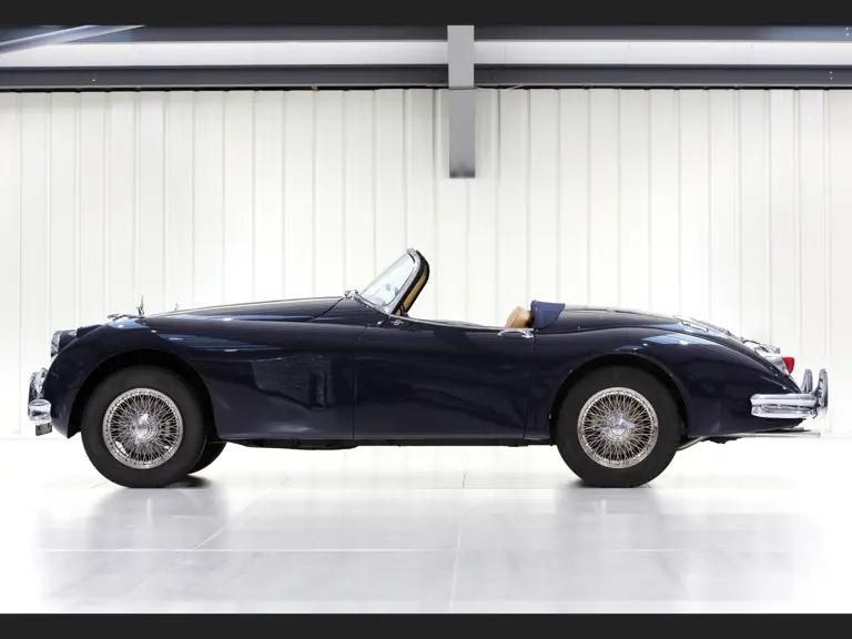 This fabulous example left the Browns Lane factory in March 1959 finished in Carmen Red with a matching red leather interior and fawn soft top, fitted with manual overdrive. It was destined for Frank Cavey’s dealership in Dublin and sold new the following month. Cavey had a close working relationship with Sir William Lyons assembling cars in Ireland—his factory’s XK120 achieved 3rd at the 1951 Monte Carlo rally. The first owner was J Goodman of Dundalk. Today the car retains its original engine and bodywork and has been restored to a gorgeous colour scheme of dark blue over beige leather. Presented in wonderful condition, it would surely be a thrill to drive and enjoy.