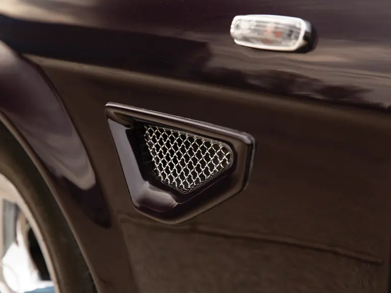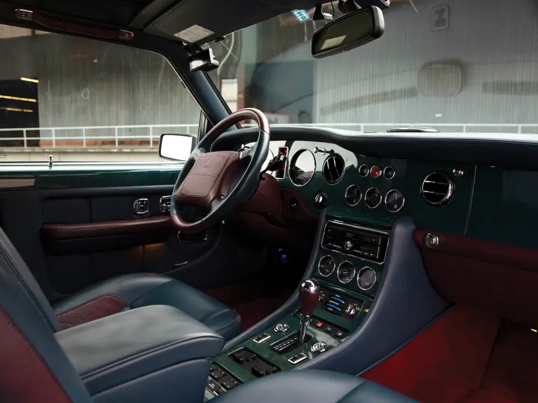 Chaque Bentley Turbo RT Mulliner était construite sur commande spéciale, et cet exemplaire à empattement long est probablement l'une des voitures les plus attrayantes qui soient sorties de Crewe. Presque chaque caractéristique est extraite du catalogue des commandes spéciales, comme sa peinture noir Black Garnet, son intérieur bi-ton bleu Royal Blue et Wildberry avec garnissages en bois bleu et ses tablettes de pique-nique escamotables. Sa personnalisation s'étend aux rétroviseurs extérieurs chromés, à la calandre assortie à la caisse et aux B ailés brodés sur les appuie-têtes. Cette voiture bénéficie aussi du kit de carrosserie RT Mulliner, des pare-chocs aérodynamiques protubérants, des prises d'air, des passages de roues élargis et des roues plus grandes, des 18 pouces.