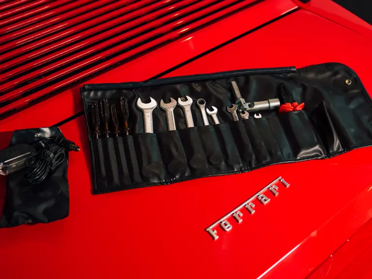 Presented in the classic Ferrari colour combination of Rosso Corsa over Nero leather seats, the stylish looks of this example are completed by a black soft-top hood. Its first owner is understood to have fitted different Ferrari wheels, and also lowered the car. In the ownership of Monsieur Petitjean since 1989, the Ferrari was used regularly by its consignor in the south of France until 2000, at which point it was put on static display in his collection, so will require mechanical recommissioning before returning to road use. The odometer reads 33,308 km at the time of cataloguing. The car is presented with a Ferrari user manual and service book in a leather pouch, together with its jack and tool roll.