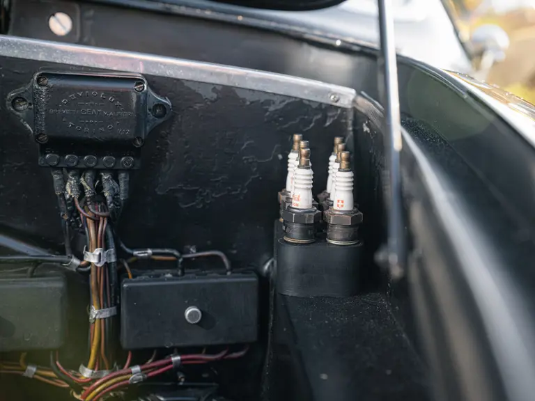 This Ferrari 195 Inter, chassis 0105S, was one of 11 examples bodied by Carrozzeria Ghia, and neared completion in late 1950. As per copies of the Foglio Montaggio, on 22 November the engine had undergone testing, and a week later the gearbox was subject to the same procedure. Of note is the dated steering box cover—numbered 110—which matches the build sheet and bears the date 11 November 1950. On 28 December, the chassis was marked for completion and by the end of the month the factory certificate of origin was issued.