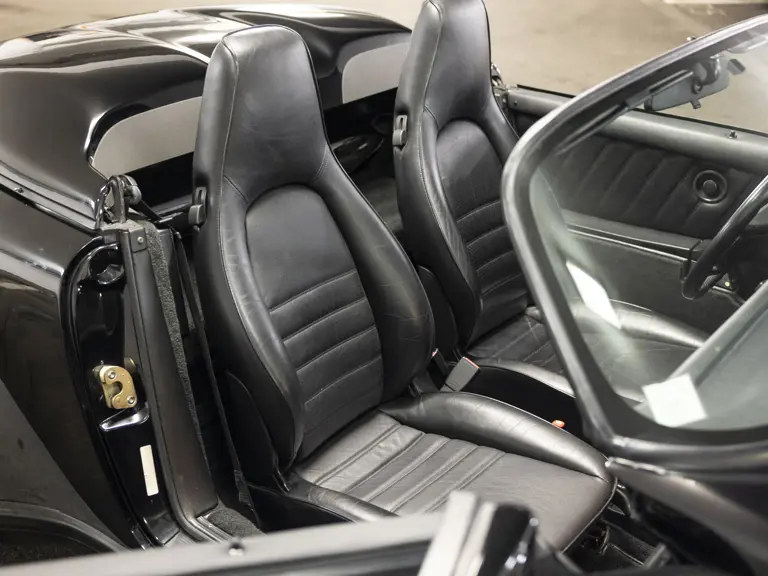 The example offered here was completed by the Stuttgart factory on 19 June 1989, finished in Black over a Black leatherette interior, and sent to the United States. It remained there until June 2007, according to the CARFAX report available to view in its history file, when the 911 returned to its native Germany. It was registered for the road later the following year. Headlights, indicators, and rear bumpers were converted to European specification and the car was also fitted with a metric odometer. The Speedster is offered for sale with its manuals, a jack, spare wheel, and toolkit.