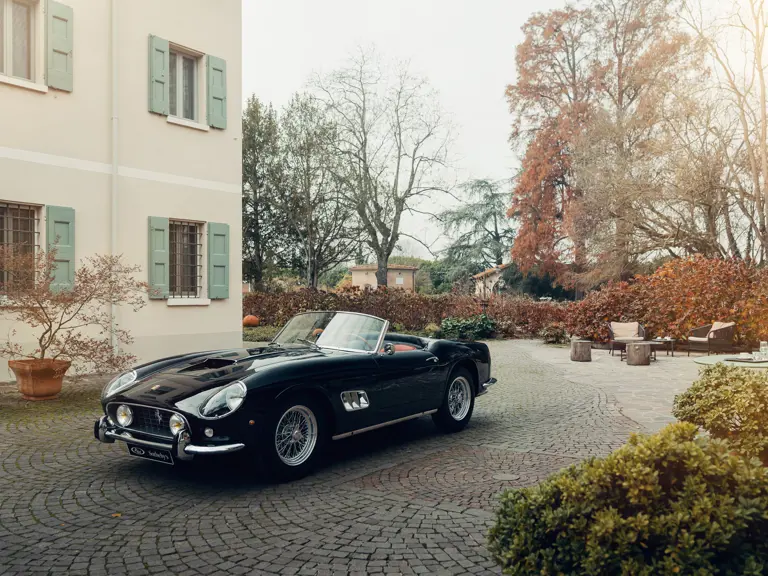 Proposée à la vente après 30 années passées chez un propriétaire méticuleux et dotée d’équipements d’origine très prisés, cette California Spider à empattement court est une pièce extraordinaire. Selon les recherches combinées du spécialiste de la marque Marcel Massini et de l’historien Ferrari français Cyrille Jaquinot, le numéro de châssis 1915 GT correspond à la troisième California Spider à empattement court ayant été produite. Elle est aussi l’un des 39 exemplaires équipés des superbes phares escamotables. Comme le confirment les fiches de production et le Ferrari Classiche « Red Book », le châssis 1915 GT fut assemblé en septembre 1960 et livré au concessionnaire officiel de la marque, Franco Britannic Autos à Levallois-Perret, en France.