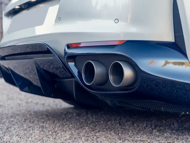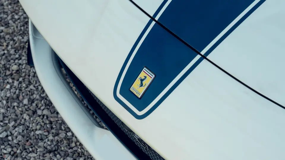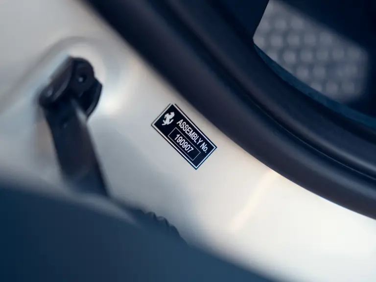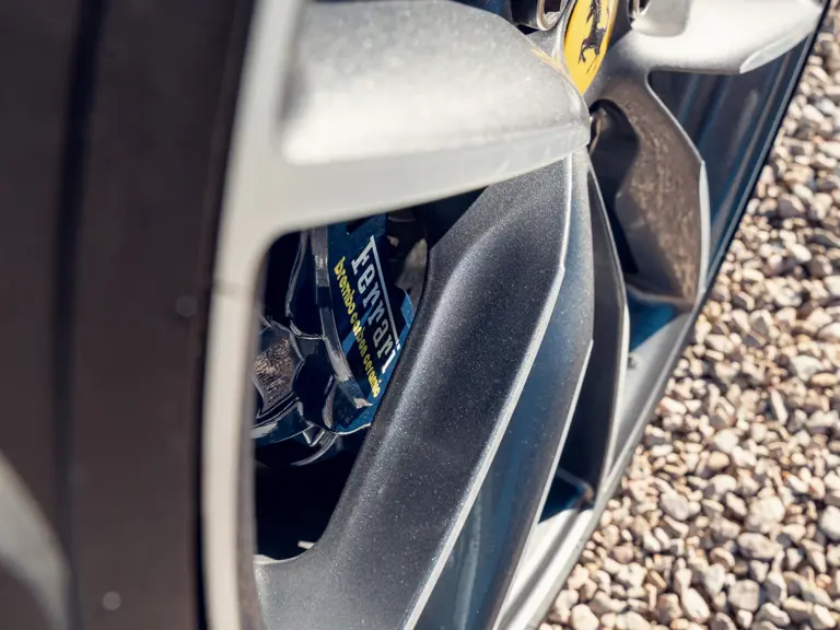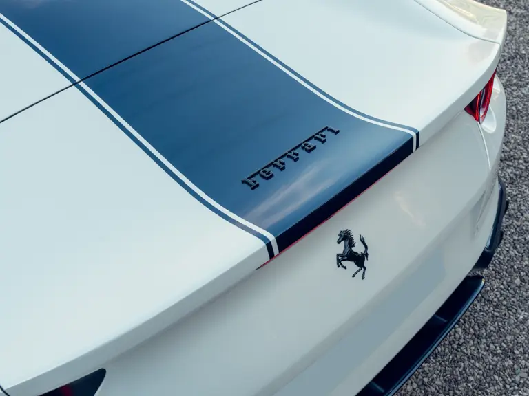 The interior is primarily trimmed in Blu Medio Alcantara and features a Glossy Blu finish for the carbon fibre driver zone and centre tunnel. The steering wheel and shift paddles are then accented by Bianco Italia “dreamline” borders. Extending the two-tone theme, the stitching, centre stripe on the large-size seats, and even the housings for the F1 controls are white. Furthermore, desirable equipment includes Apple CarPlay, adaptive headlights, a suspension lift system, Ferrari’s passenger display screen and 360-degree Surround View cameras, plus a high-power hi-fi system.