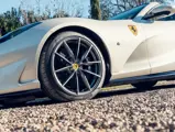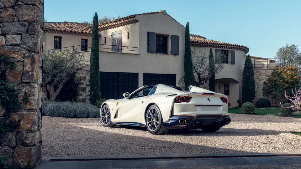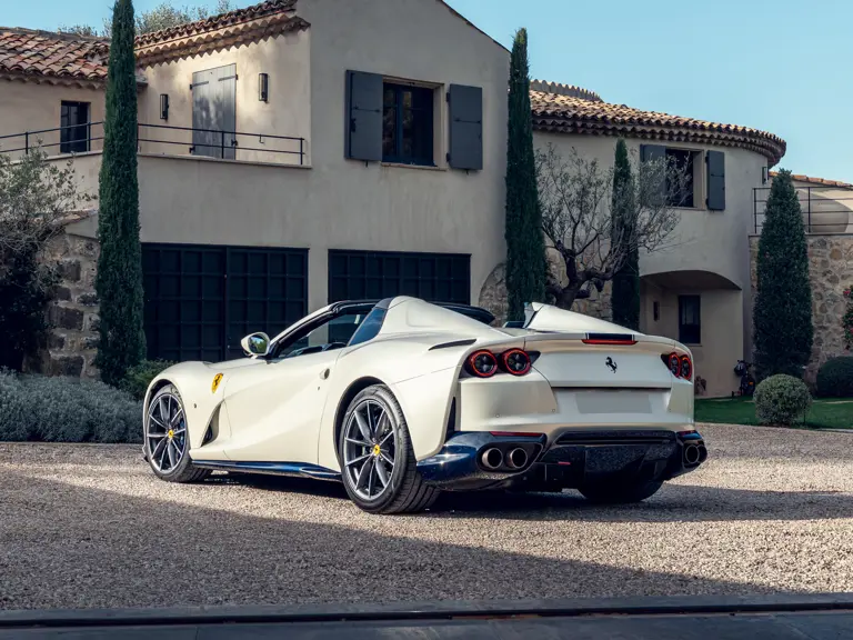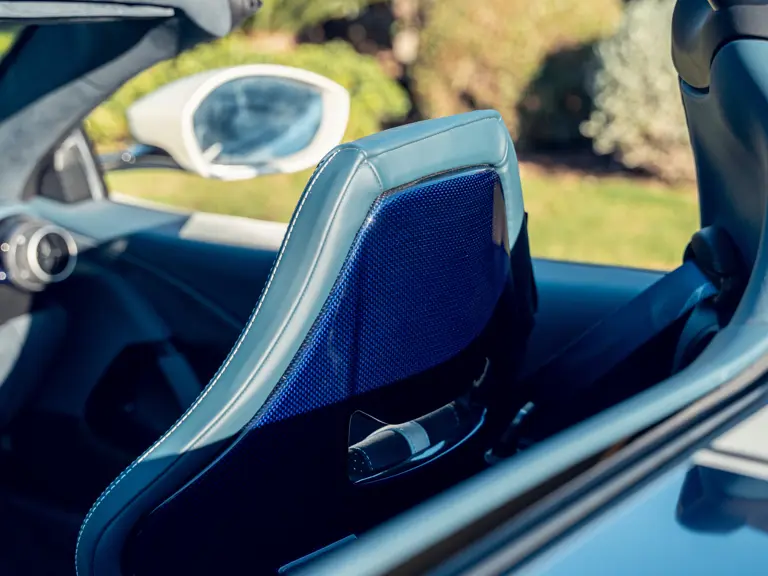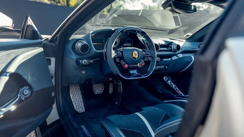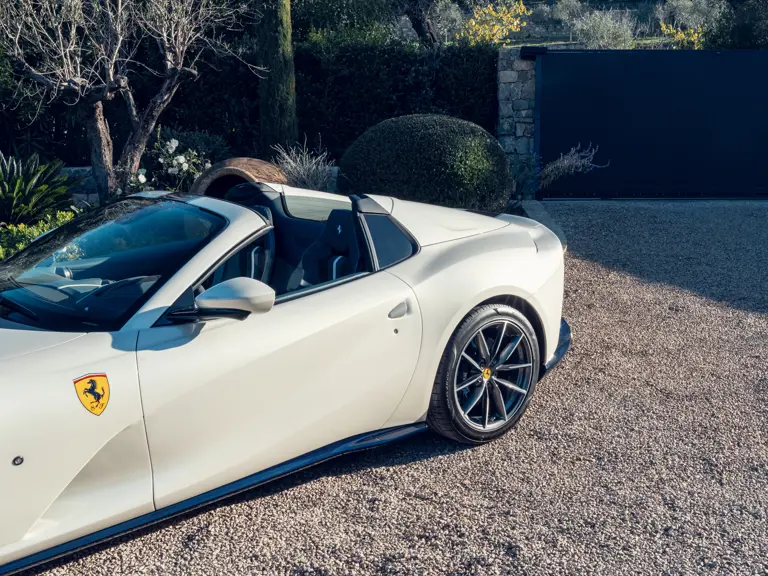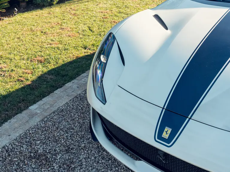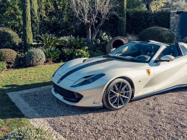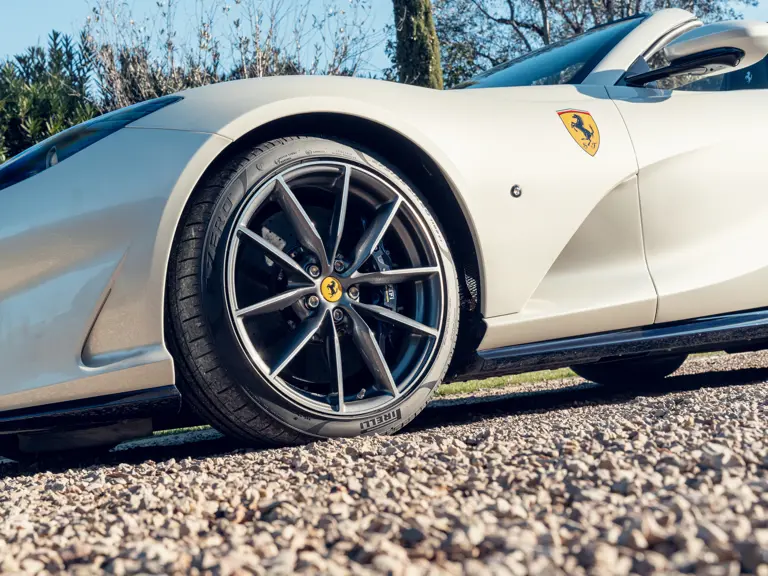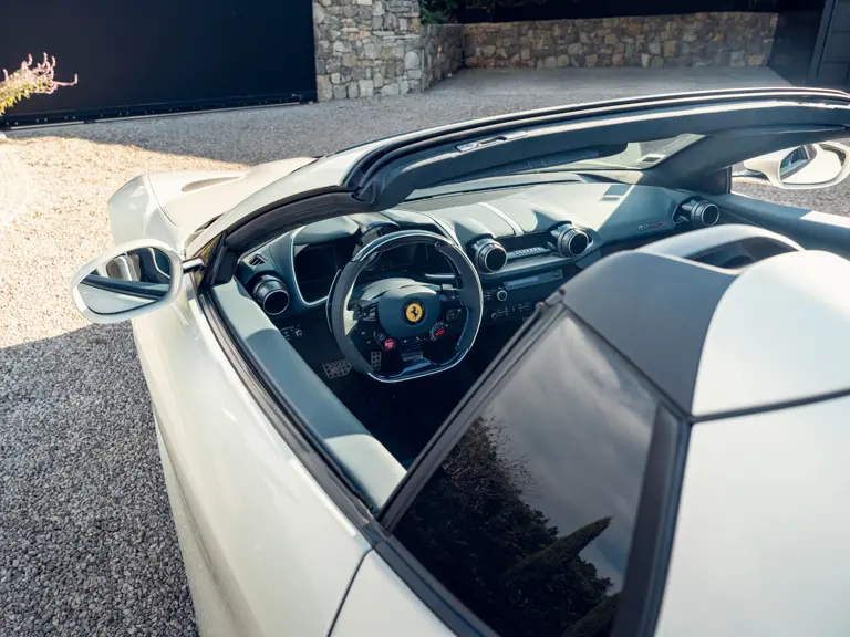 The Extra Range Bianco Italia paint of this Ferrari 812 GTS is beautifully complemented by the tinted Blu Medio carbon fibre for the front splitter, side sills, and rear diffuser. Similarly, the 20-inch forged wheels sit over blue-painted brake callipers. Such a special, lesser-spotted, and contrasting colour combination runs throughout this convertible V-12 grand tourer.