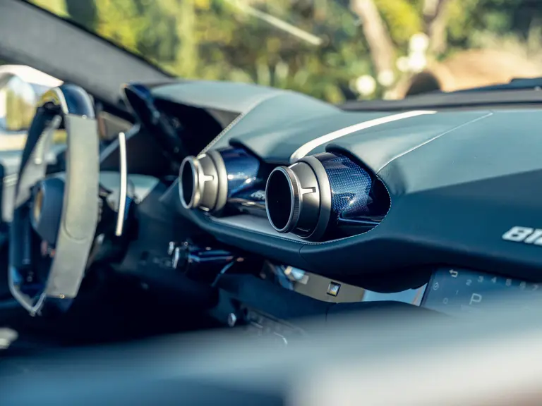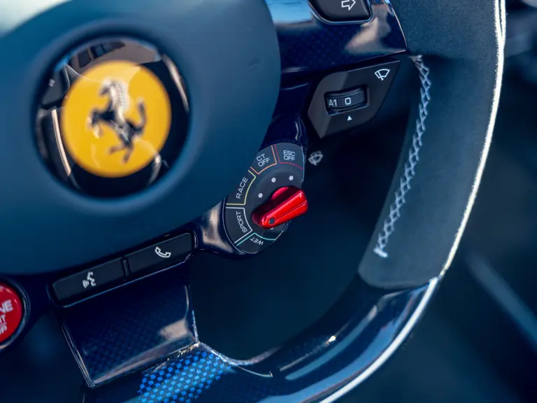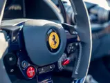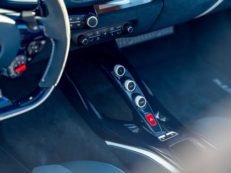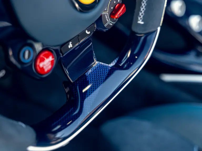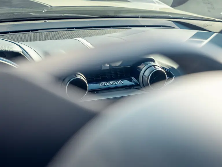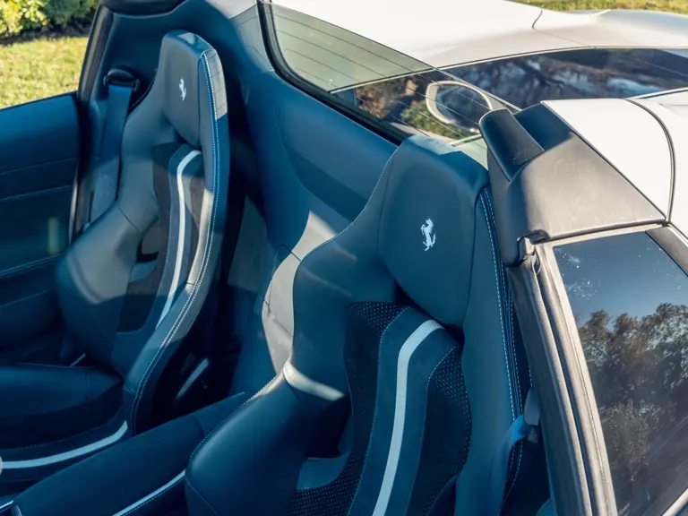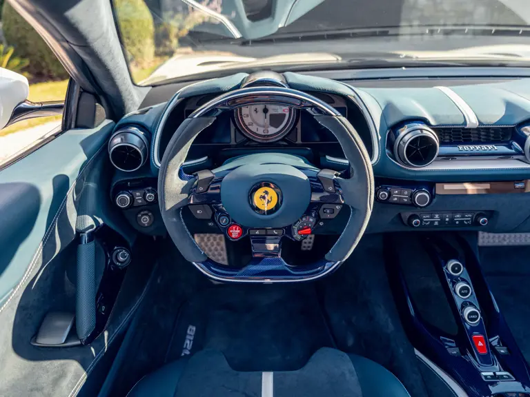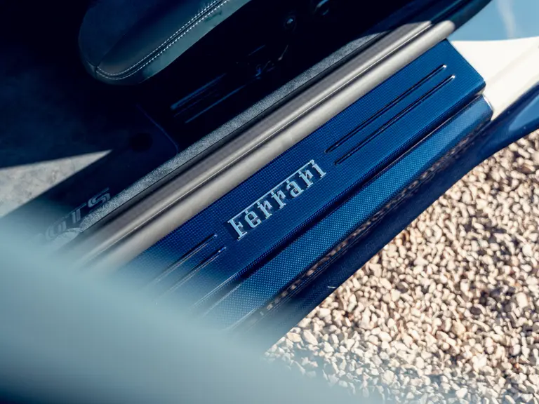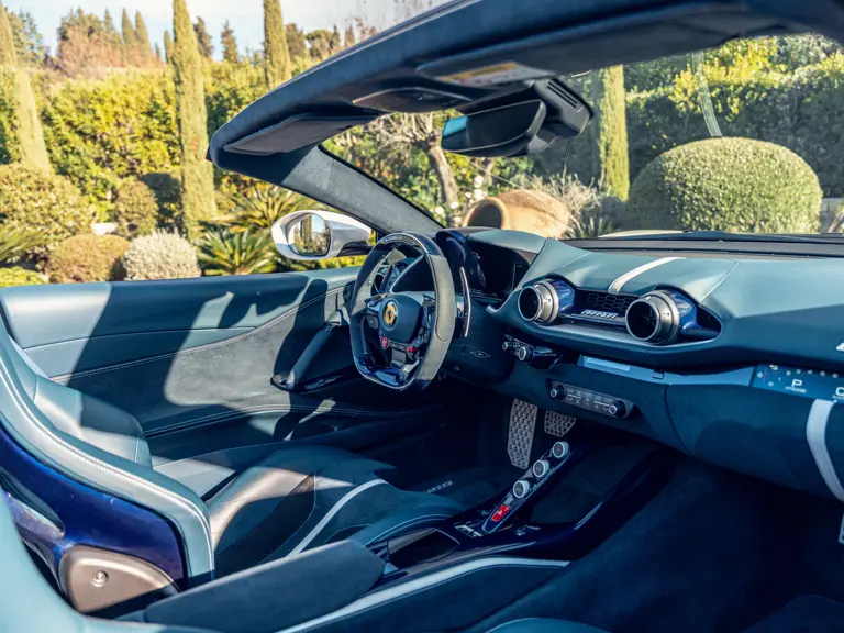 L'intérieur est habillé d'Alcantara Blu Medio et affiche une finition bleu brillant pour la fibre de carbone de la zone conducteur et de la console centrale. Le volant et les palettes de boîte de vitesses sont soulignées par une bordure Bianco Italia. Pour poursuivre ce thème bicolore, les coutures et la partie centrale des sièges de grande taille, de même que le réceptacle des commandes F1, sont blancs. De plus, la voiture est dotée de désirables équipements incluant le système Apple CarPlay, des phares adaptatifs, un dispositif de levage de suspension, un écran Ferrari pour le passager, des caméras "Surround View" à 360°, ainsi qu'un système hi-fi de grande puissance.