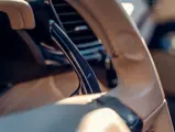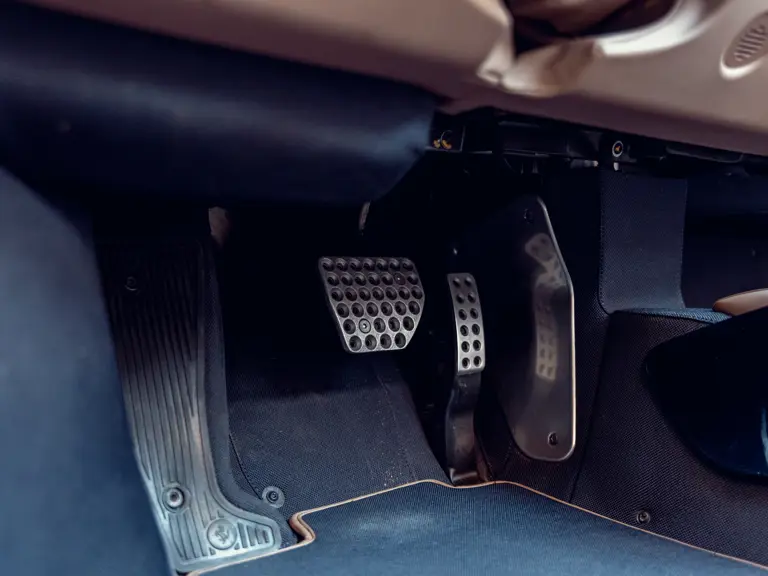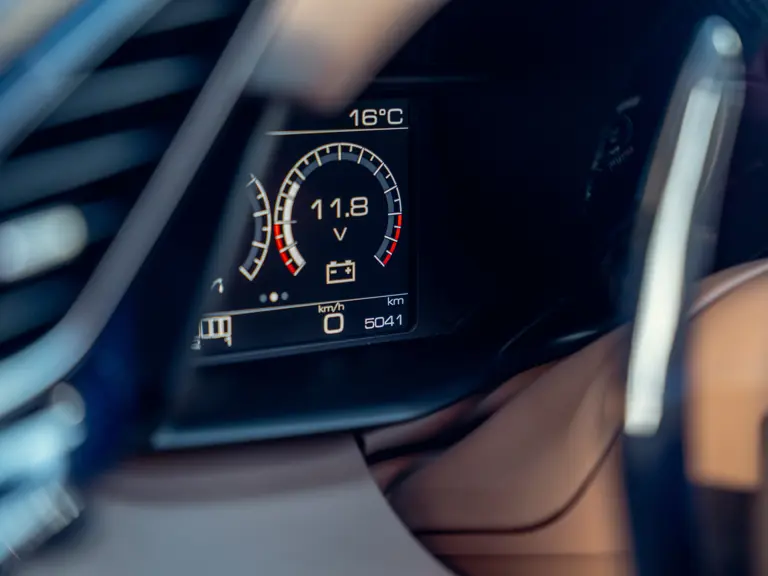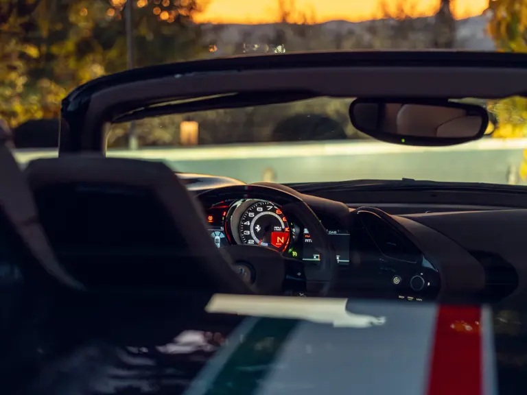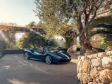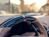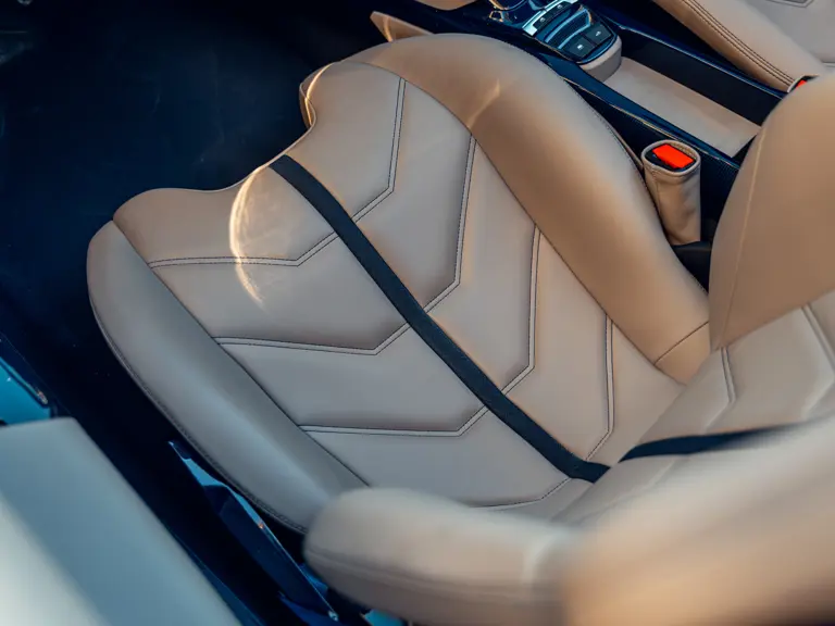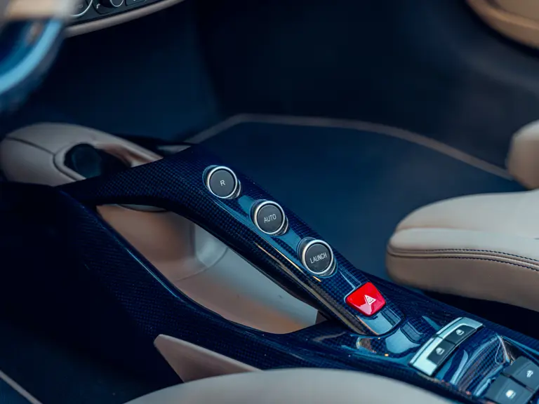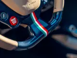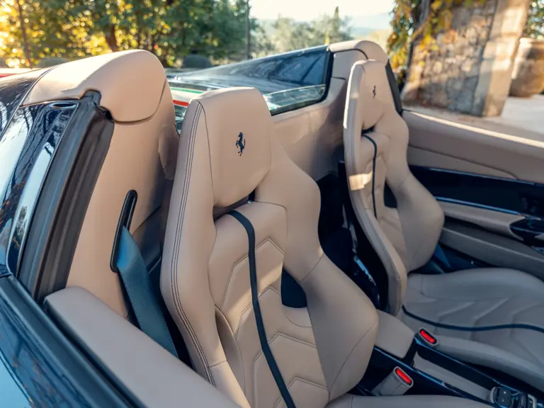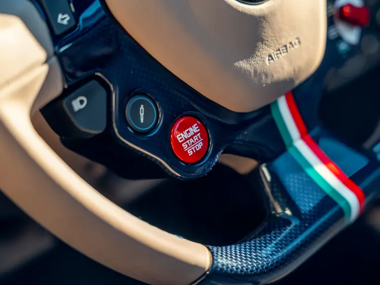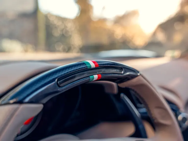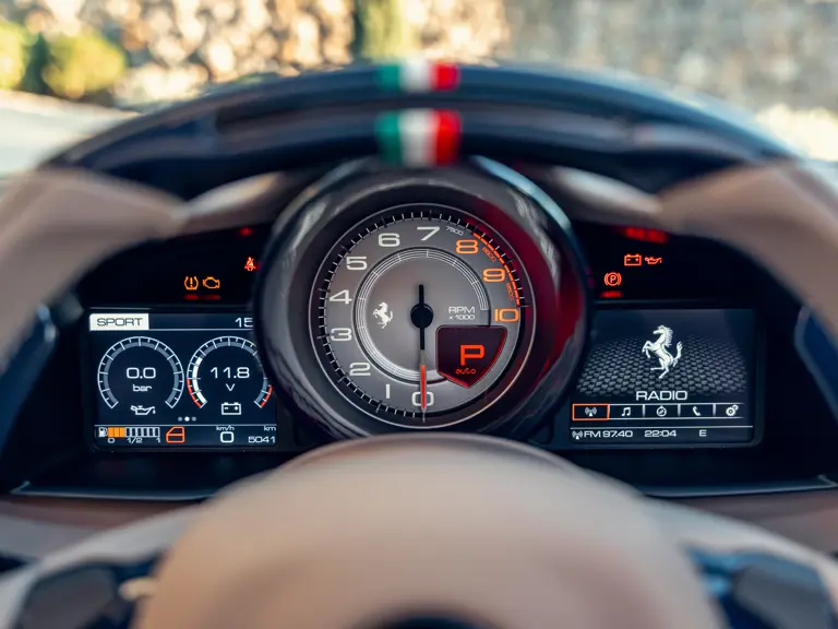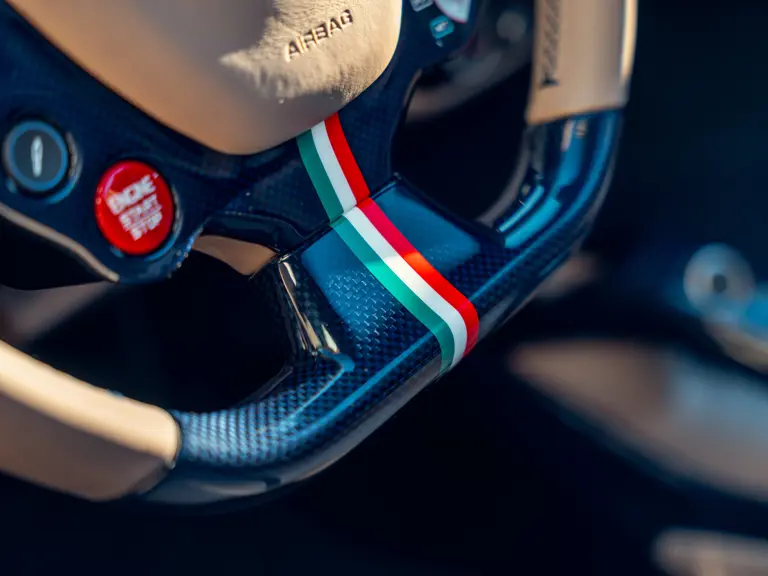 L'intérieur est lui aussi configuré avec recherche, comme en témoigne sa sellerie en cuir Tortora. Les sièges compétition de grande taille affichent une bande centrale Blu Scuro assortie aux moquettes, le volant et la console centrale étant en fibre de carbone bleu brillant. On peut également noter les seuils de portes en carbone et l'insigne du Cheval Cabré brodé sur les appui-têtes avec couture Blu Medio. Un écran passager, un dispositif de levage de suspension, des capteurs de parking avant et arrière ainsi qu'un système hi-fi premium font partie de l'équipement.