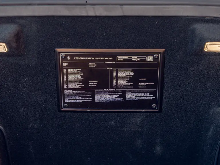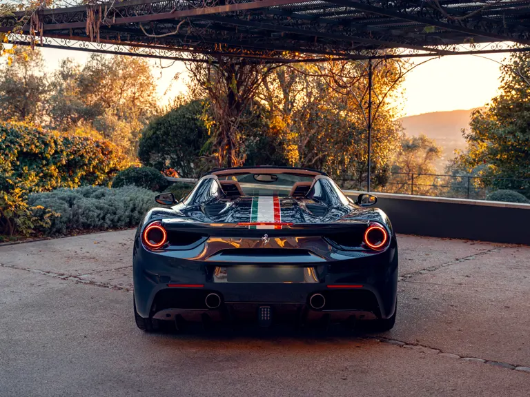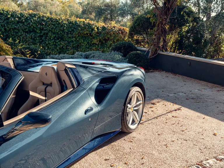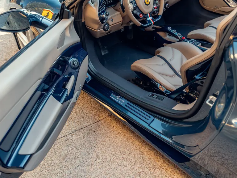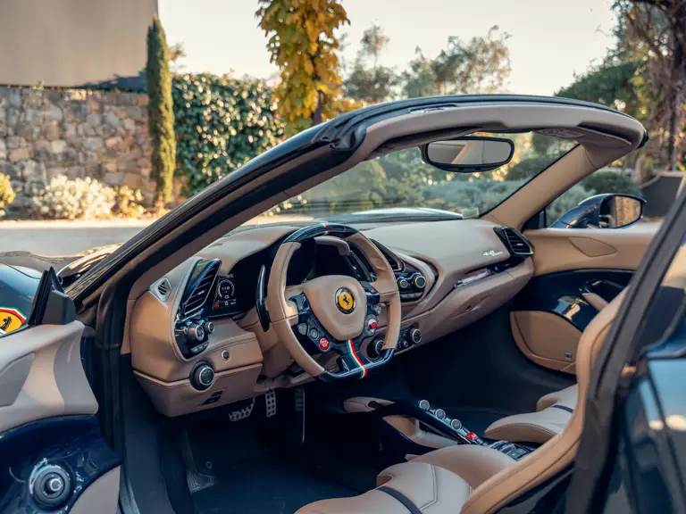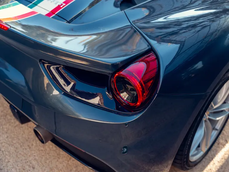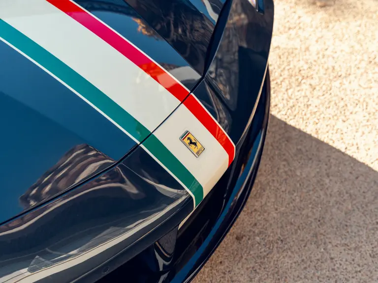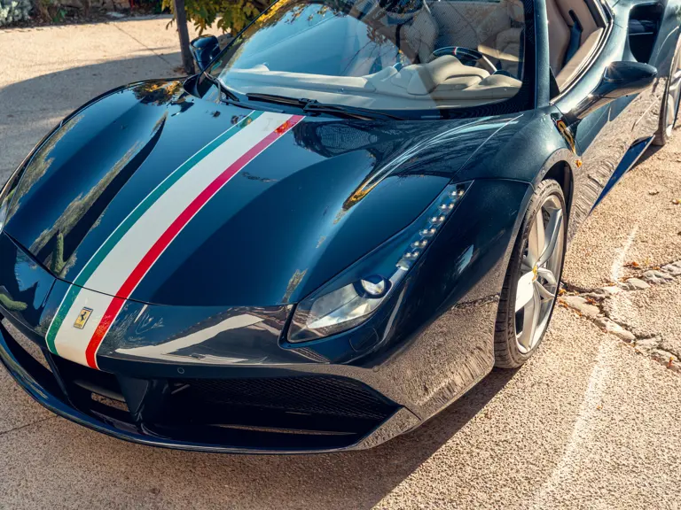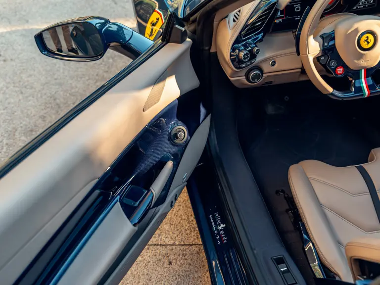 Généreusement personnalisée via le programme Ferrari Tailor Made, cette 488 Spider présente une peinture Blu Ahrabian Extra Range avec bande tricolore à bordure blanc Avus sur toute la longueur, une livrée inspirée par la 458 GTE du Championnat du Monde d'Endurance FIA. L'extérieur a été commandé avec des insignes Scuderia sur les ailes avant, des éléments en fibre de carbone bleu brillant, des jantes de 20 pouces deux-tons Argento Nürburgring et Grigio Corsa devant des étriers Alluminio, ainsi que des sorties d'échappement titane.