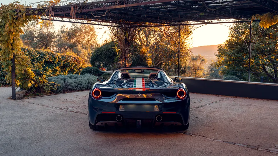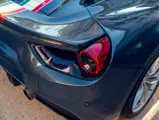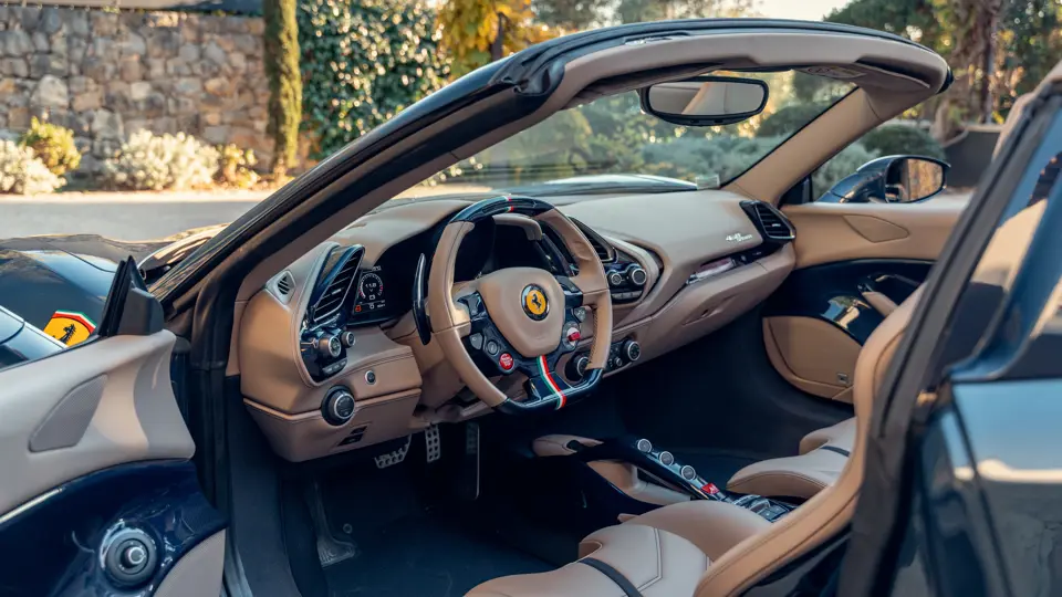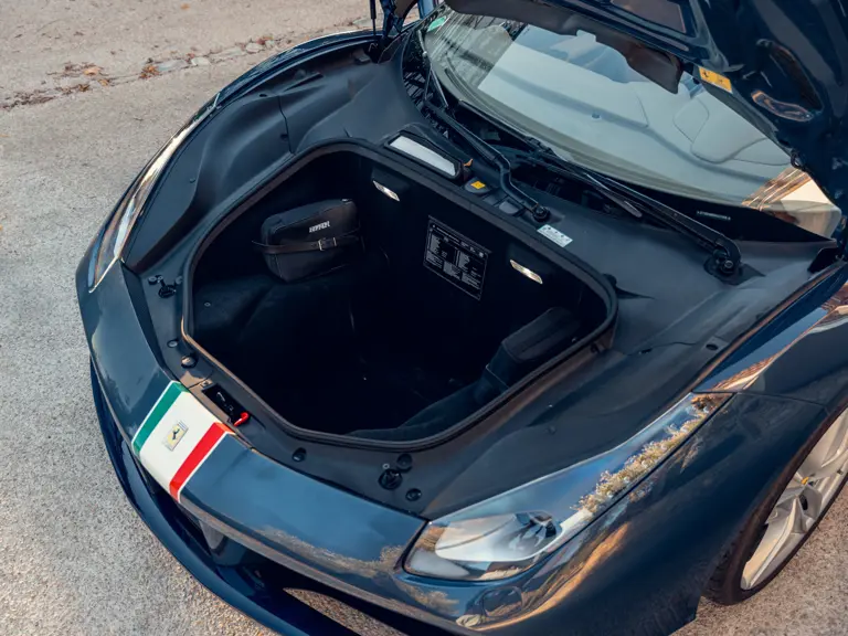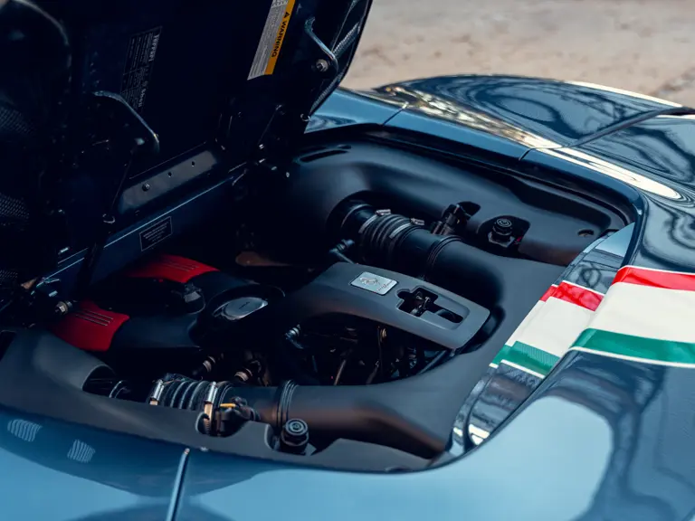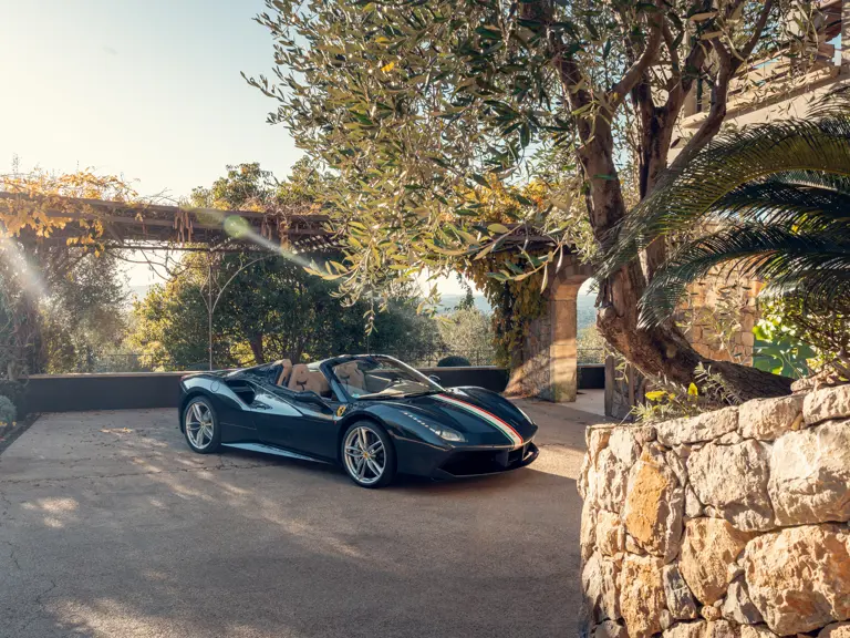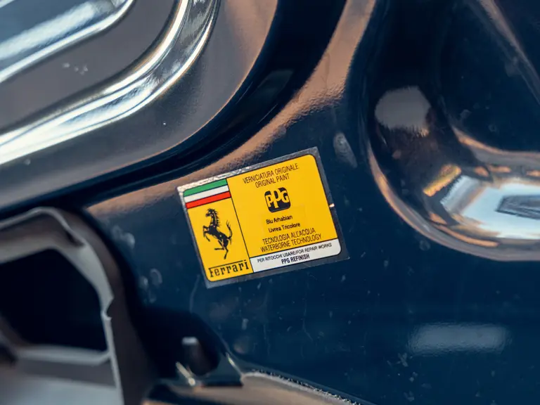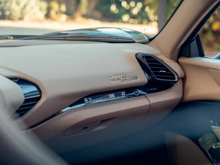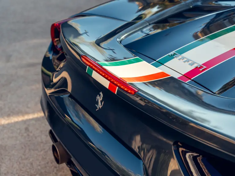 Généreusement personnalisée via le programme Ferrari Tailor Made, cette 488 Spider présente une peinture Blu Ahrabian Extra Range avec bande tricolore à bordure blanc Avus sur toute la longueur, une livrée inspirée par la 458 GTE du Championnat du Monde d'Endurance FIA. L'extérieur a été commandé avec des insignes Scuderia sur les ailes avant, des éléments en fibre de carbone bleu brillant, des jantes de 20 pouces deux-tons Argento Nürburgring et Grigio Corsa devant des étriers Alluminio, ainsi que des sorties d'échappement titane.
