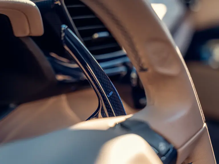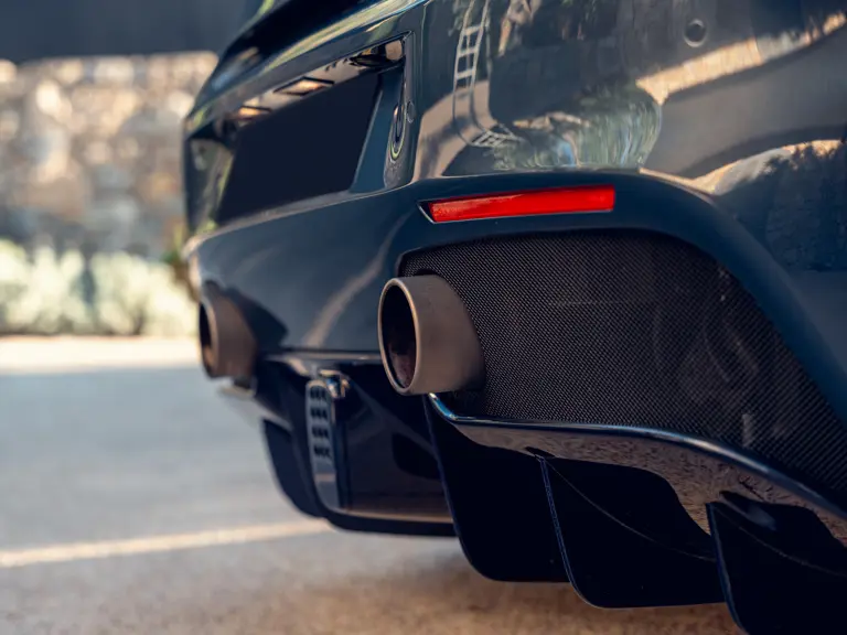 The interior is no less lavishly configured, predominantly upholstered with Tortora leather. The large-size racing seats are capped off by a Blu Scuro centre stripe to match the floormats, while the steering wheel and centre tunnel are finished in Glossy Blu carbon fibre. Additional flourishes include the carbon door sills and Cavallinos stitched into the headrest with Blu Medio thread. A passenger display screen, suspension lifter, front and rear parking sensors, plus premium hi-fi system are also equipped.