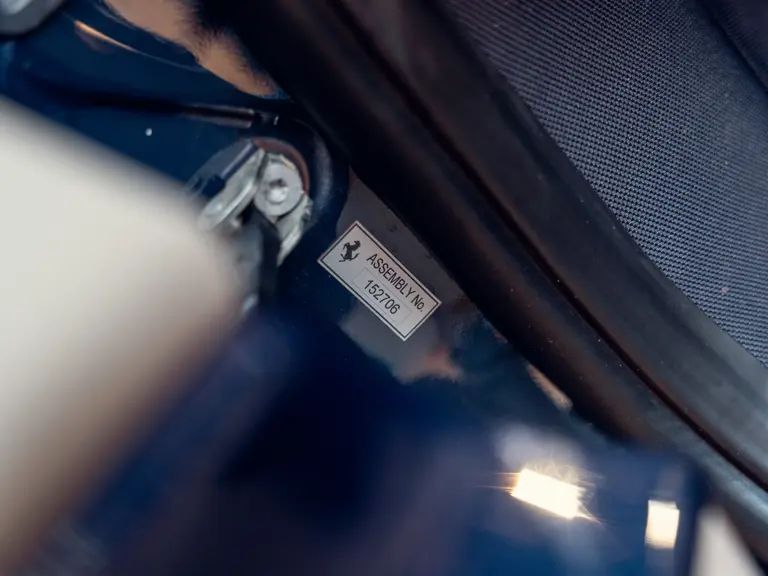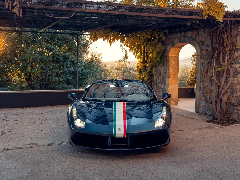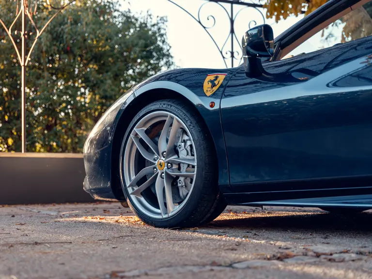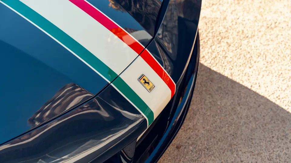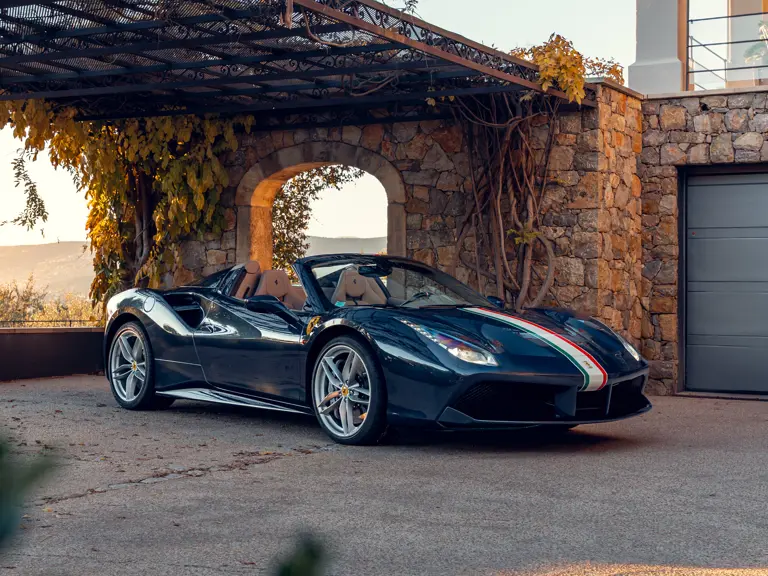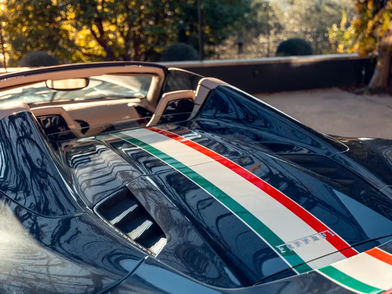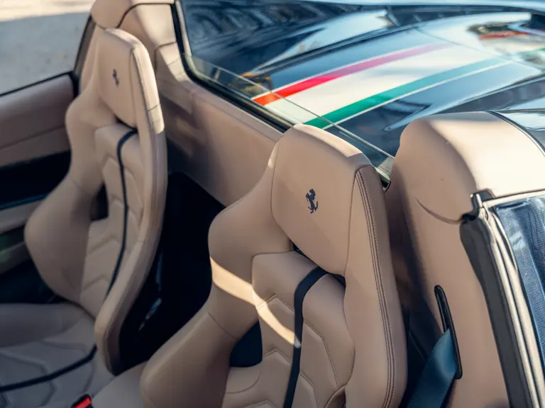 Heavily personalised via the Ferrari Tailor Made programme, this 488 Spider wears Extra Range Blu Ahrabian paint featuring a full-length Tricolour stripe with a Bianco Avus border—a livery inspired by the 458 GTE FIA World Endurance Championship race car. The exterior was further specified with Scuderia shields airbrushed onto the front wings, Glossy Blue carbon fibre elements, two-tone satin Argento Nurburgring and Grigio Corsa 20-inch wheels that sit over Alluminio brake callipers, plus titanium exhaust tips.