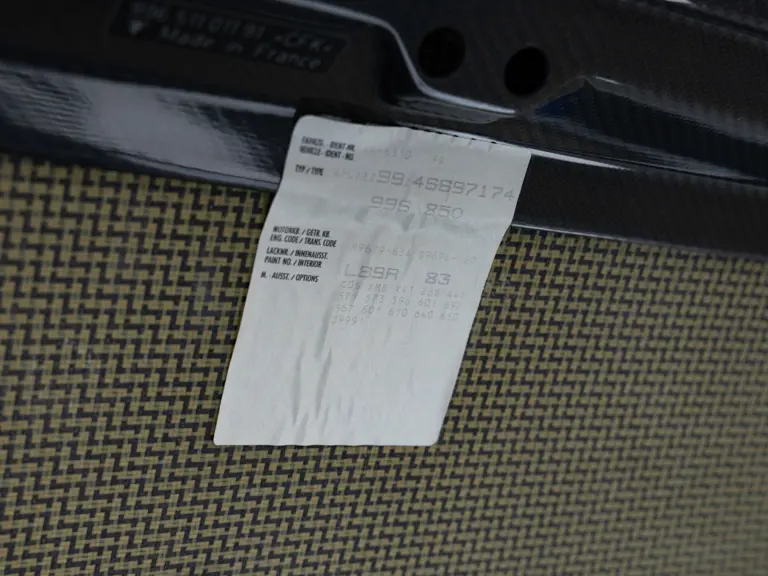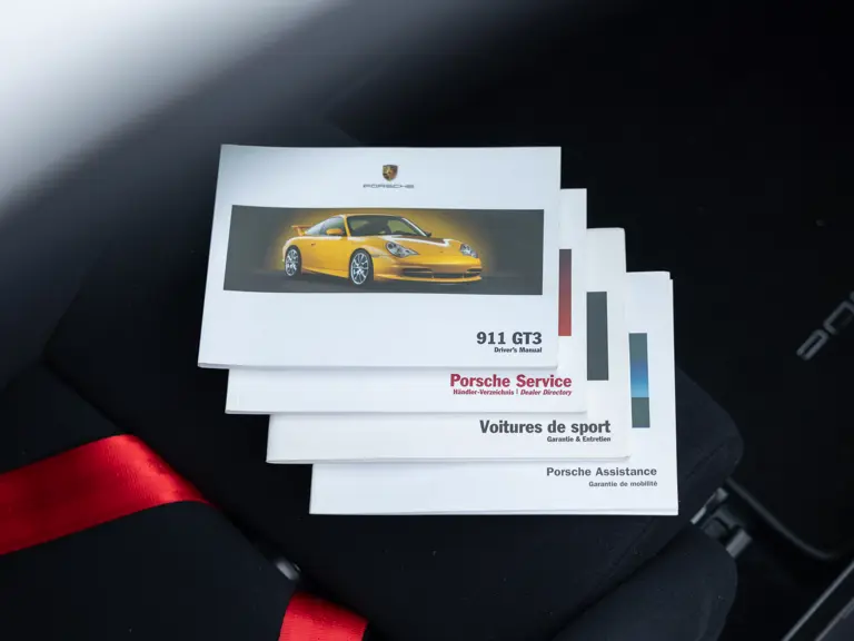 L'exemplaire que nous proposons a été livré neuf par l'intermédiaire du Centre Porsche de Monaco (Groupe Segond) à son premier propriétaire le 12 août 2004. Avec sa peinture caractéristique Carrera White, cette voiture comporte l'inscription latérale rouge rappelant l'appellation GT3 RS, complétée par des jantes de même couleur. Cette Porsche a été commandée avec plusieurs options comme l'air conditionné, des phares Bi-Xenon, un arceau-cage de couleur blanche, en plus de l'équipement standard de la GT3 RS. Elle est accompagnée d'une copie de sa facture d'achat d'origine, ainsi que de ses carnets et manuels fournis par l'usine dans une pochette Porsche. Le compteur affichait 9 100 km au moment de rédiger ce catalogue.