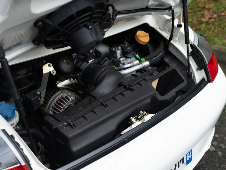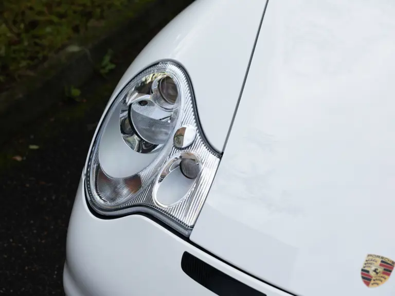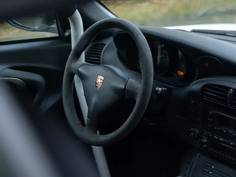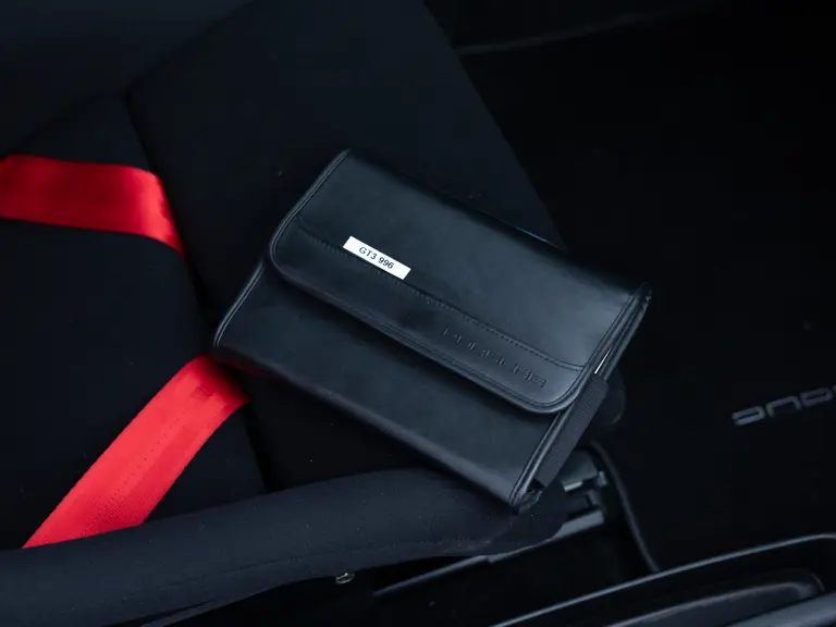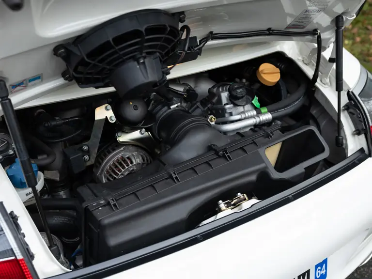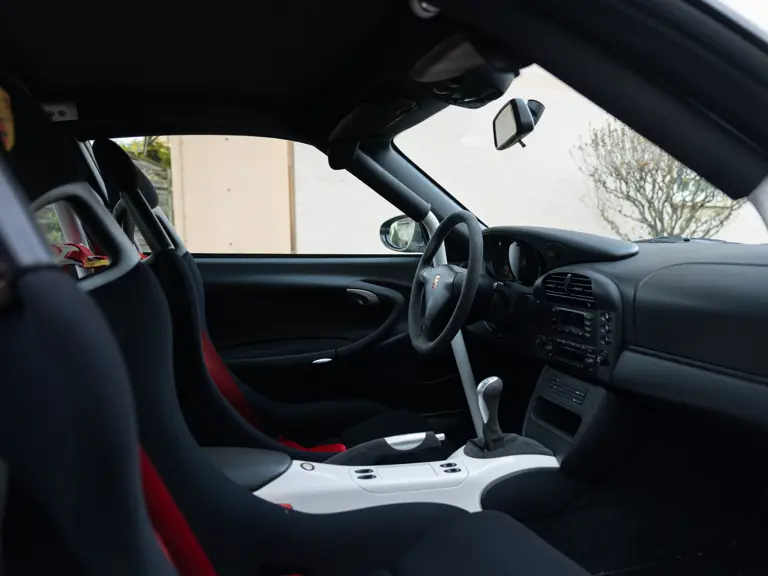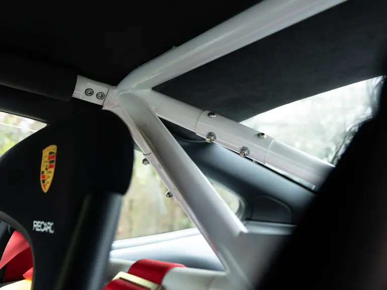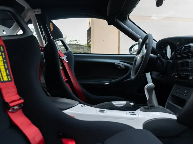 The example offered here was delivered new via the Monegasque car dealer, Porsche Groupe Segond, with handover to its first owner noted on 12 August 2004. Finished in the model’s signature shade of Carrera White, the car gained Red side script to show the GT3 RS model name complemented by colour-matching wheels. The Porsche was specified with optional extras including air conditioning, Bi-Xenon headlights, and its roll cage painted white, further to the standard equipment offered with the GT3 RS. The car is accompanied by a copy of its original purchase invoice, further to its factory-issued books and manuals in a Porsche folio. The odometer reads just 9,100 kilometres at the time of cataloguing.