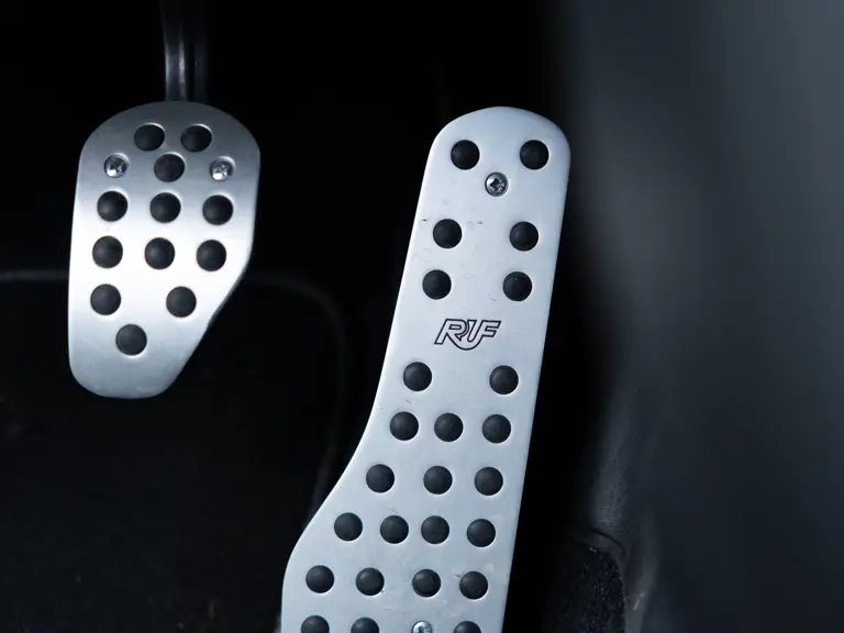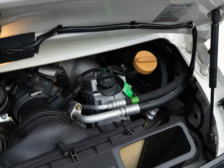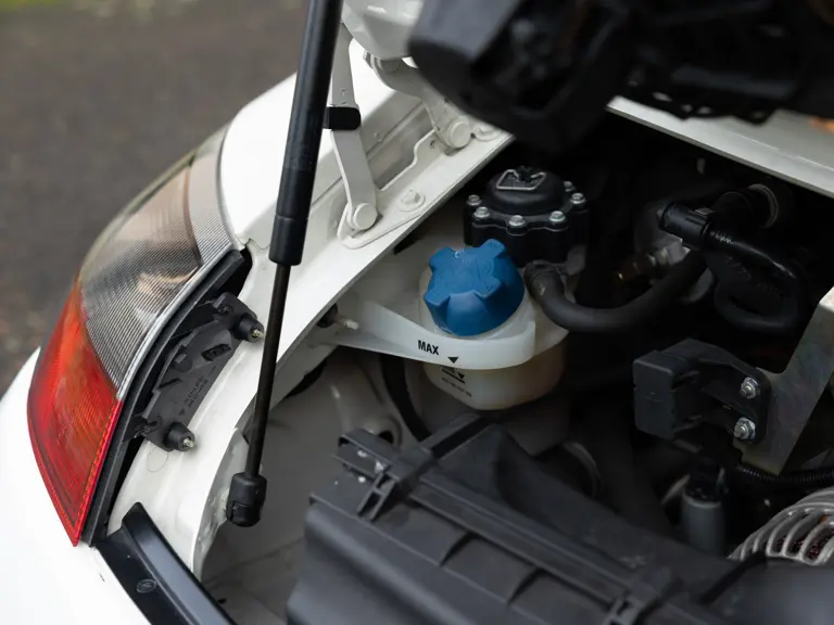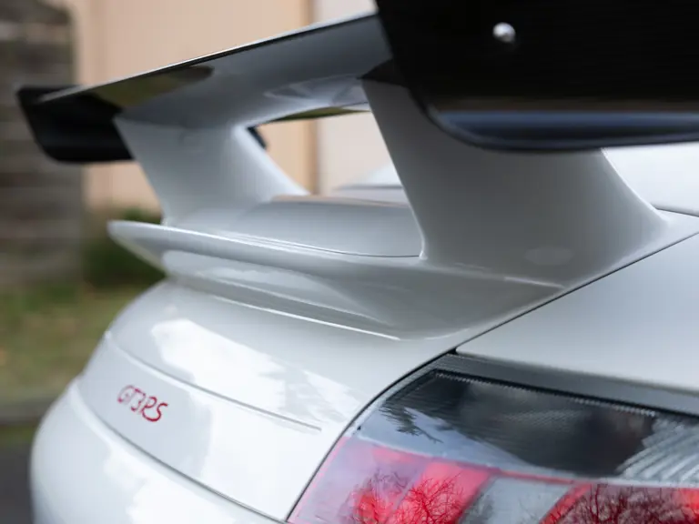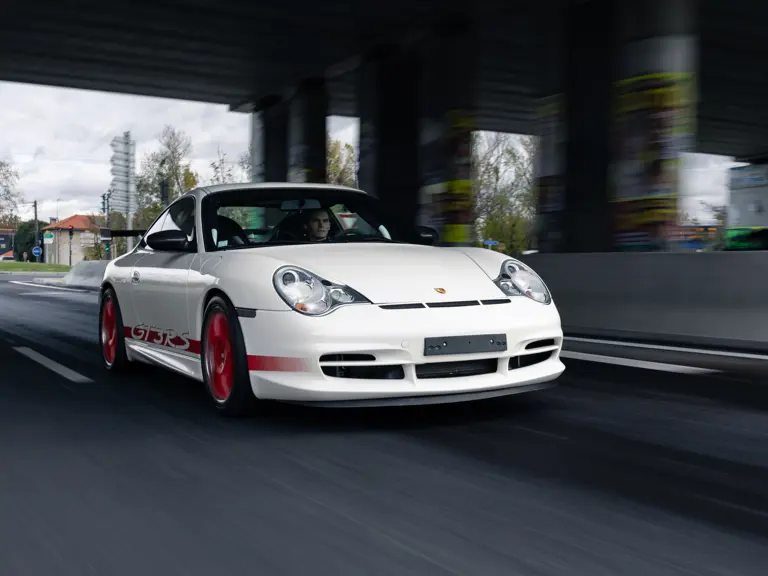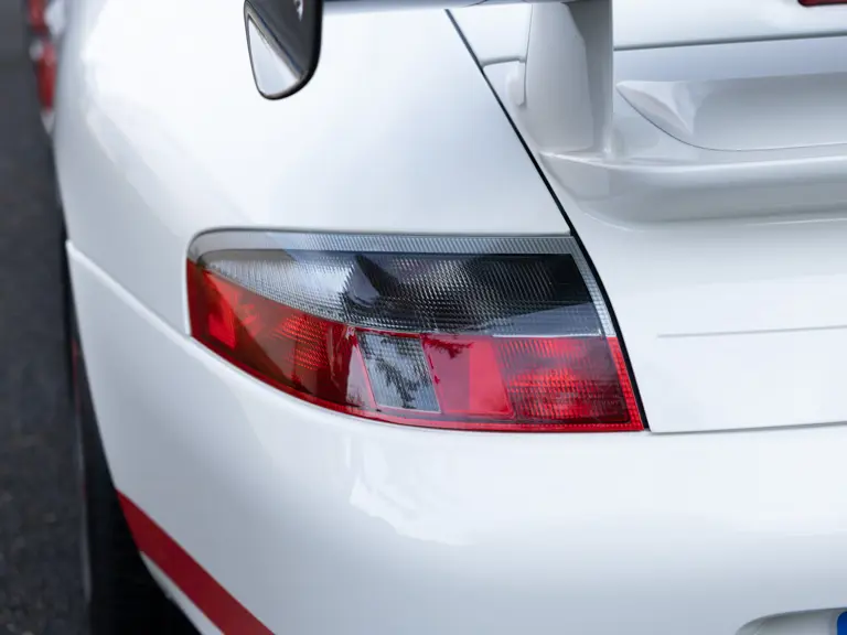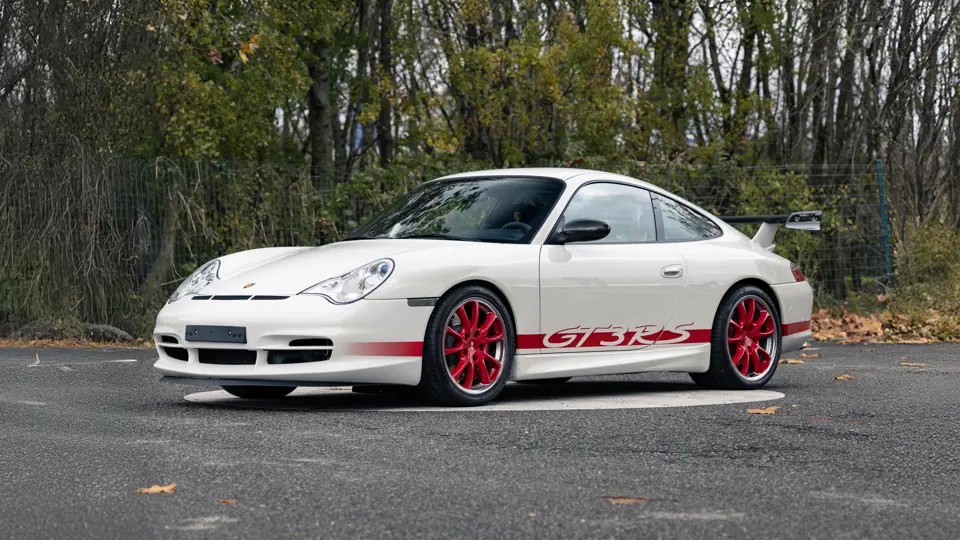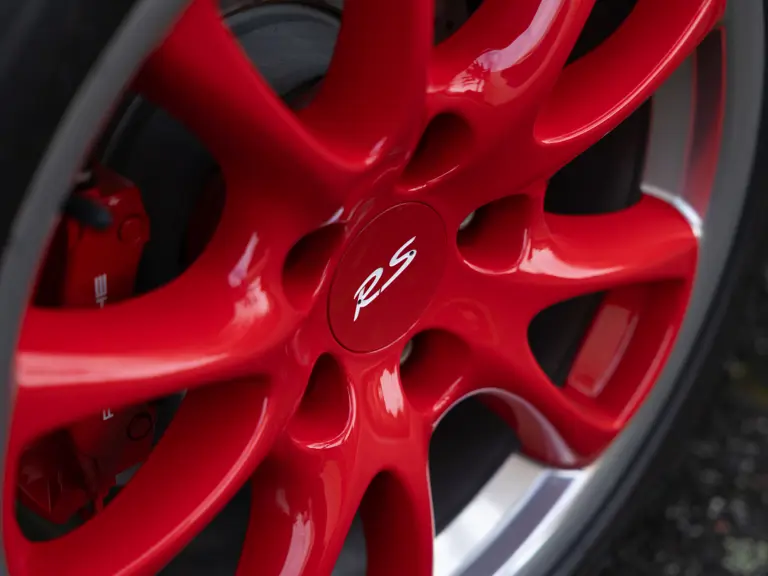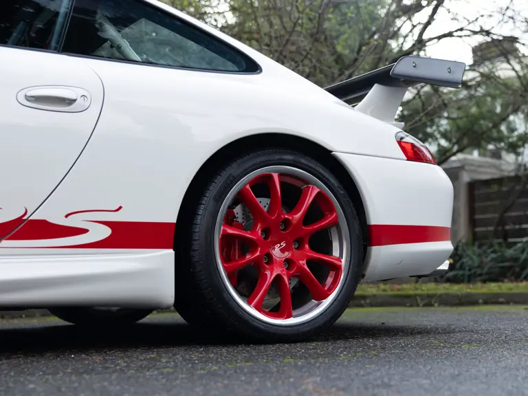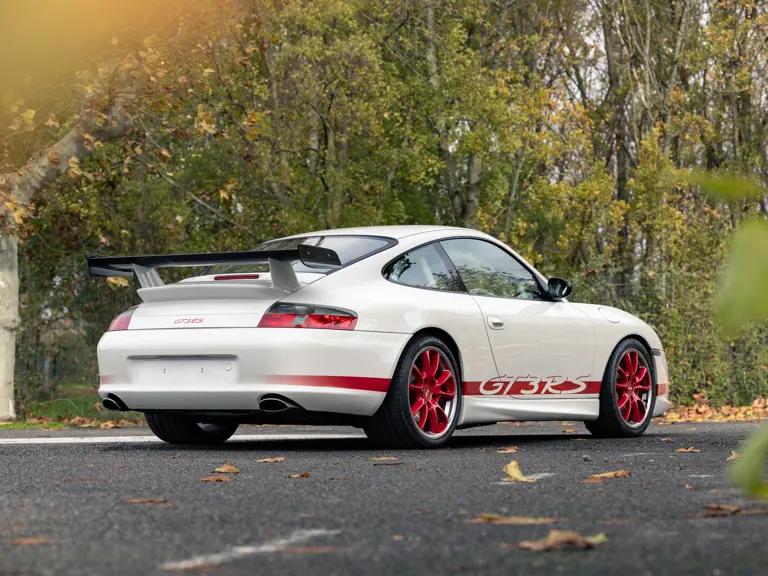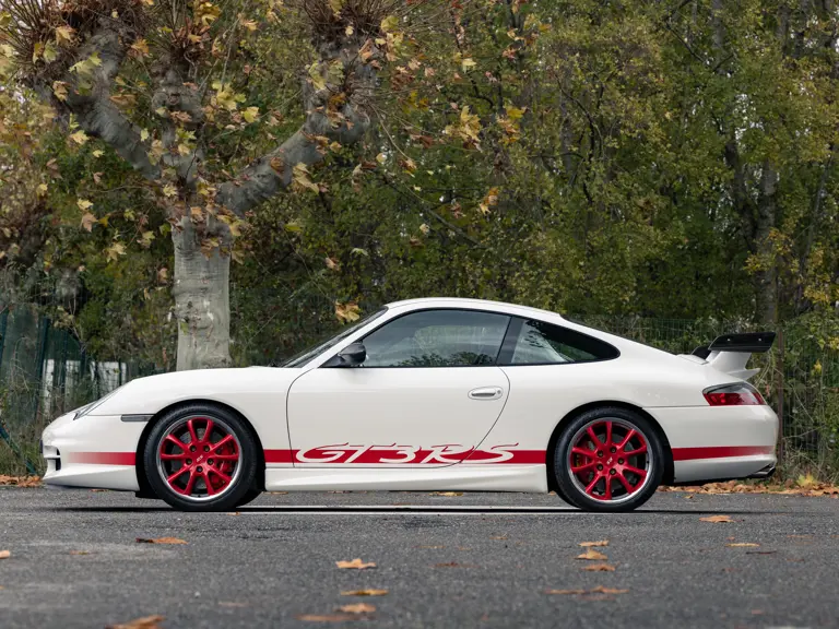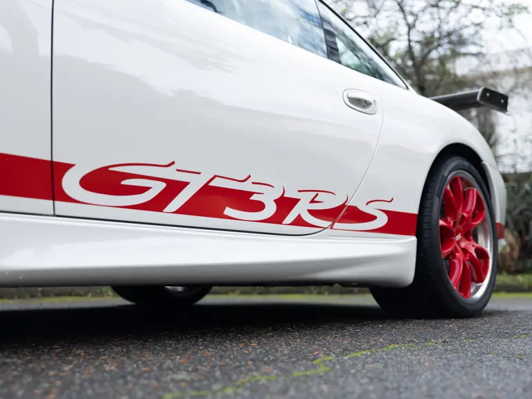 Produced from 2003 to 2004, the type-996 GT3 RS expanded on the performance credentials of the 996-generation GT3 by offering more power while its driving dynamics were further honed for the racetrack. The RS moniker itself pays homage to motorsport, an abbreviation of the German word Rennsport or “racing sport” in English. Offered solely in Carrera White, the model’s side decals and wheels (in either red or blue) gave a nod to the first road-going Porsche to carry the RS moniker: the 911 Carrera 2.7 RS.