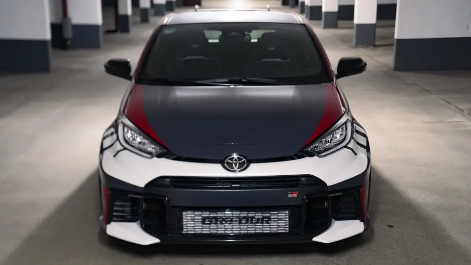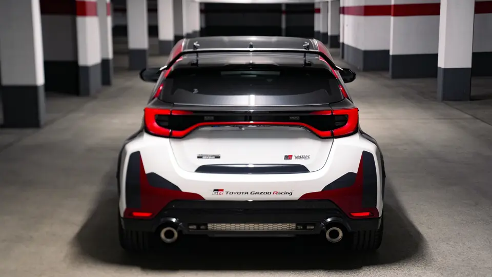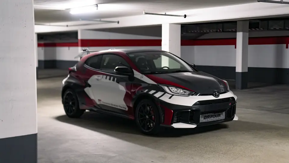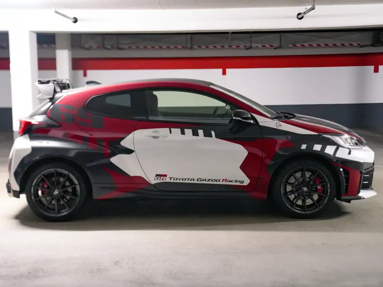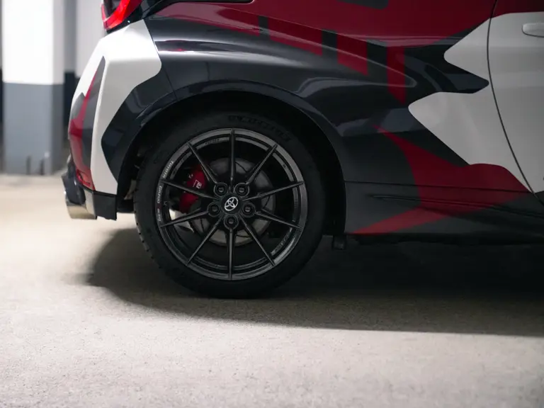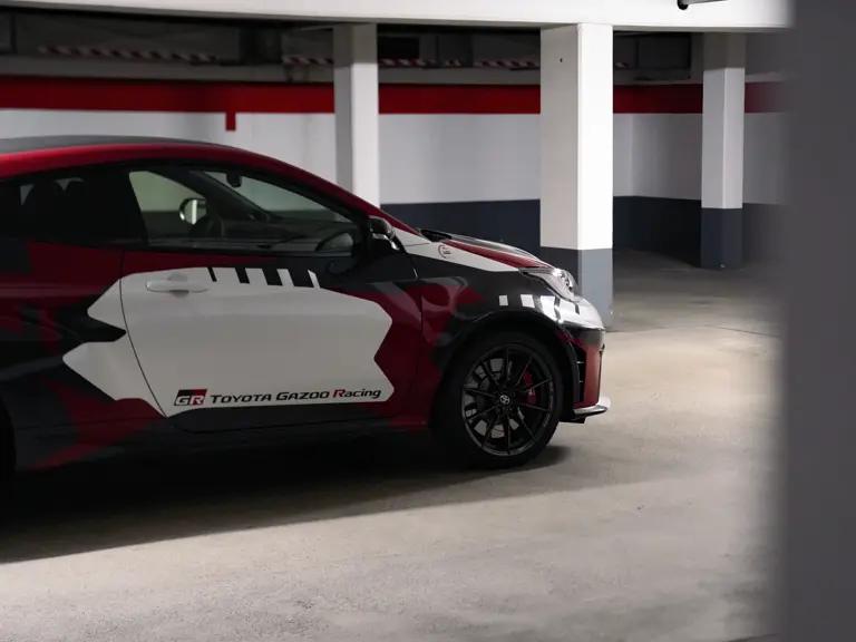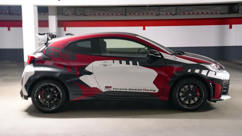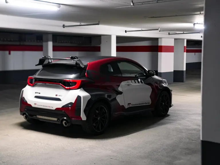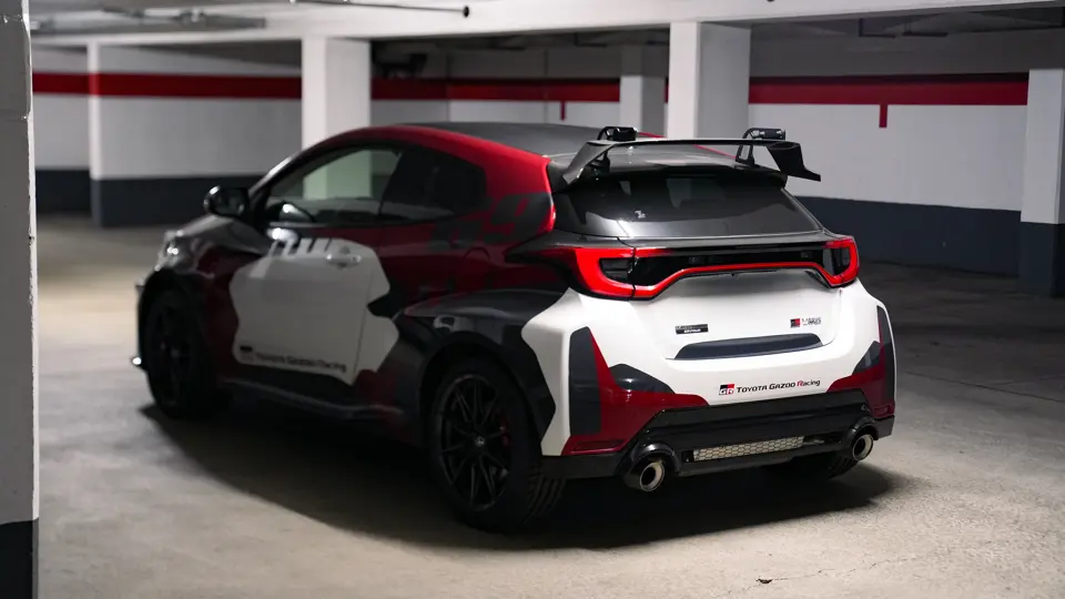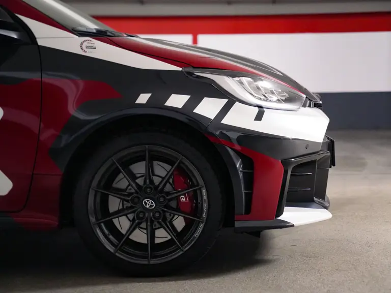 - Couleurs rouge, blanc et noir, avec des autocollants WRC rappelant la GR Yaris Rally 1