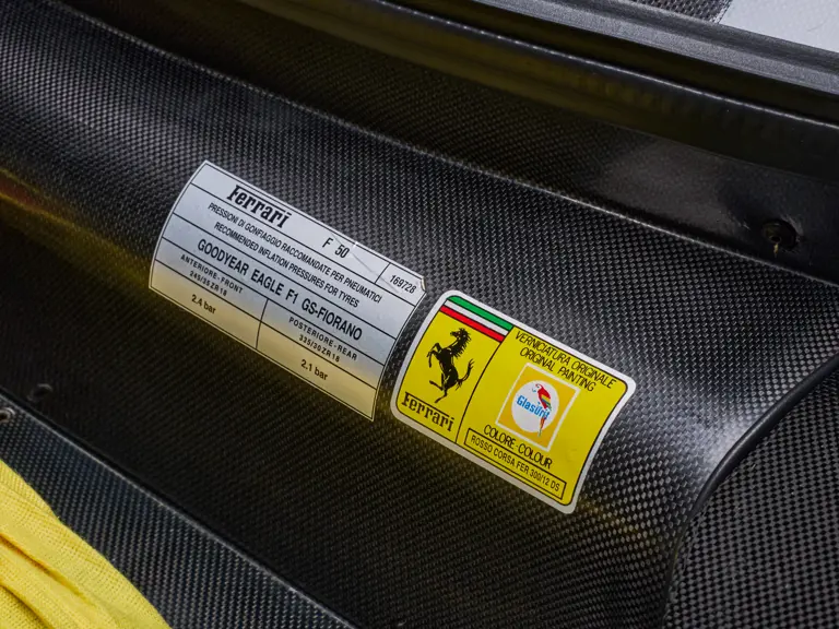 Idéale pour être exposée lors des rassemblements Ferrari ou de marques de prestige, cette F50 extrêmement authentique et peu utilisée bénéficie d'un statut véritablement exceptionnel par la présence de nombreux et rares accessoires, dont le panneau de toit avec sa caisse de transport, des arceaux de sécurité, un jeu de manuels d'utilisation, un jeu de bagages spéciaux pour la F50 et des chaussures Tod's Ferrari F50 de pilote (équipement F50 d'origine qui est rarement encore présent avec la voiture).