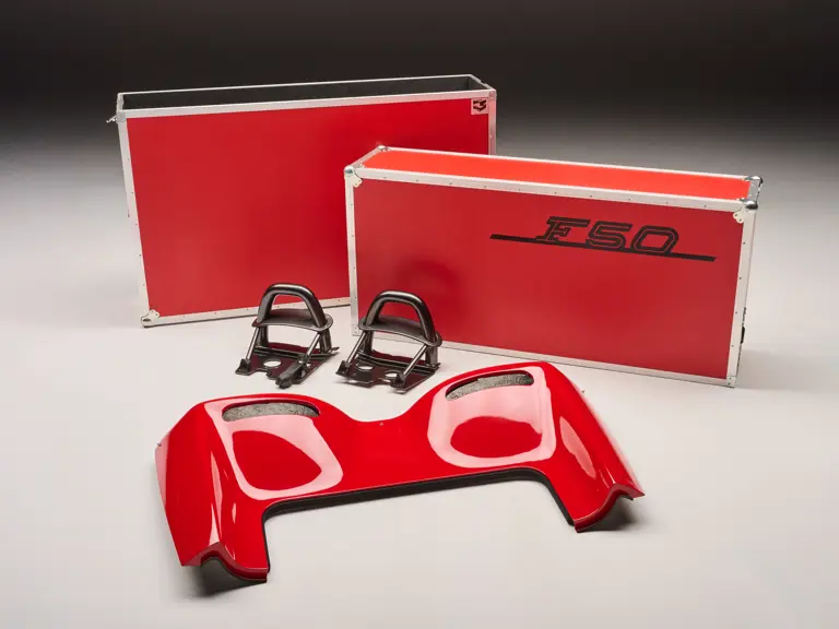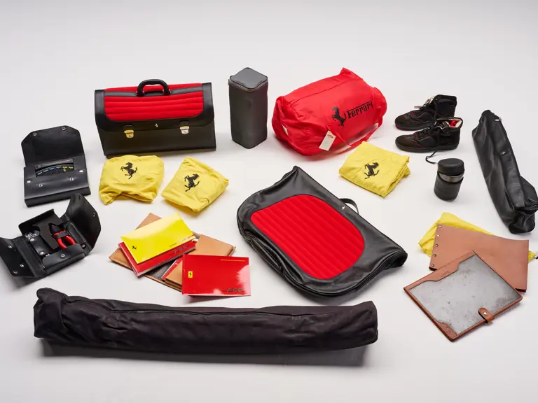 - Exemplaire exceptionnellement bien préservé et accompagné de rares accessoires dont le toit amovible et sa caisse de transport, les arceaux de sécurité, la trousse à outils, un jeu de bagages et des chaussures Tod's Ferrari F50 de pilote, d'une grande rareté