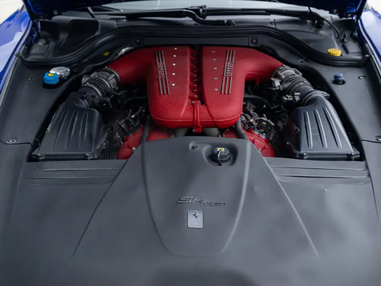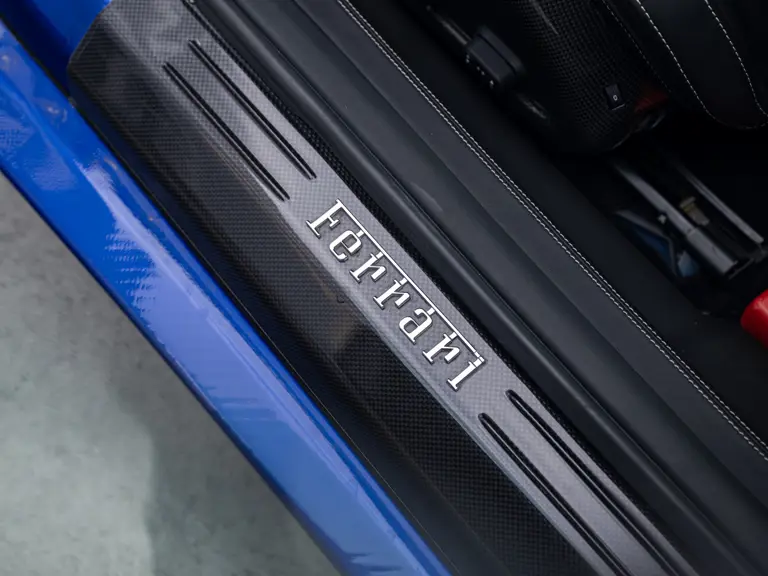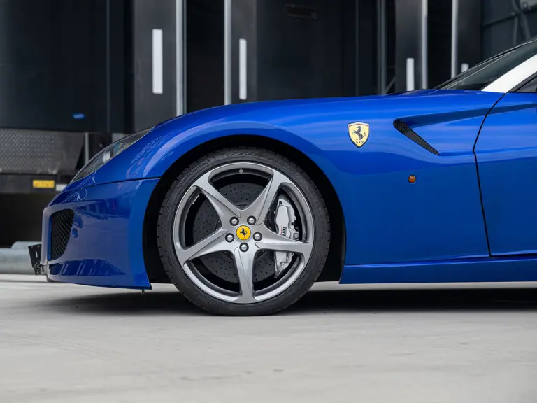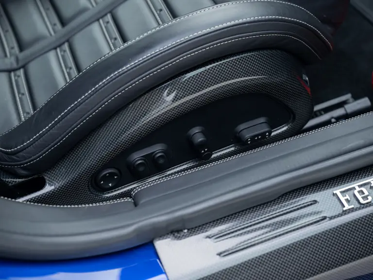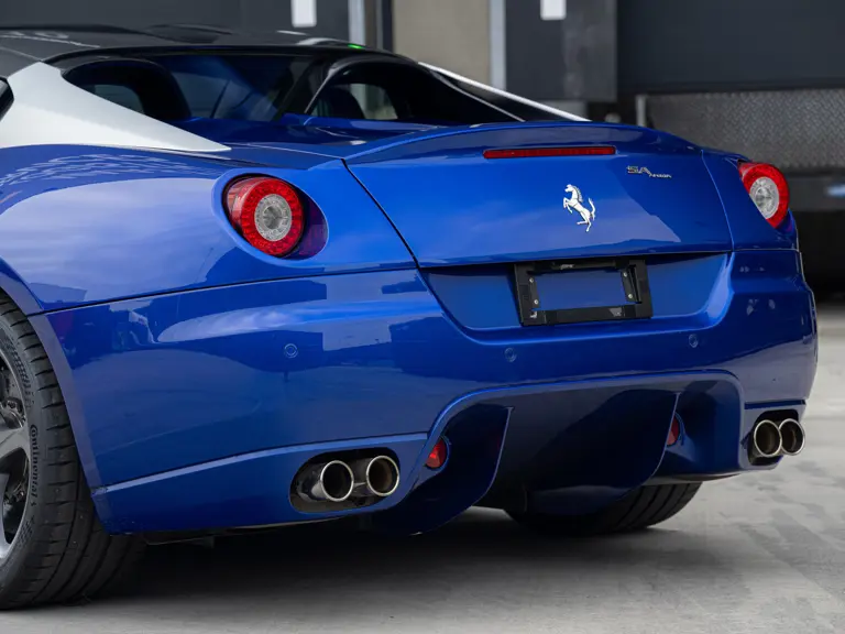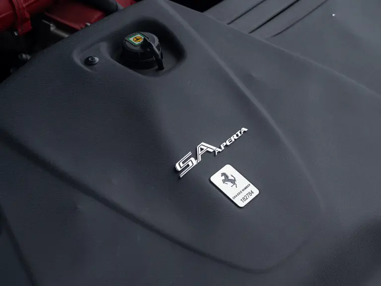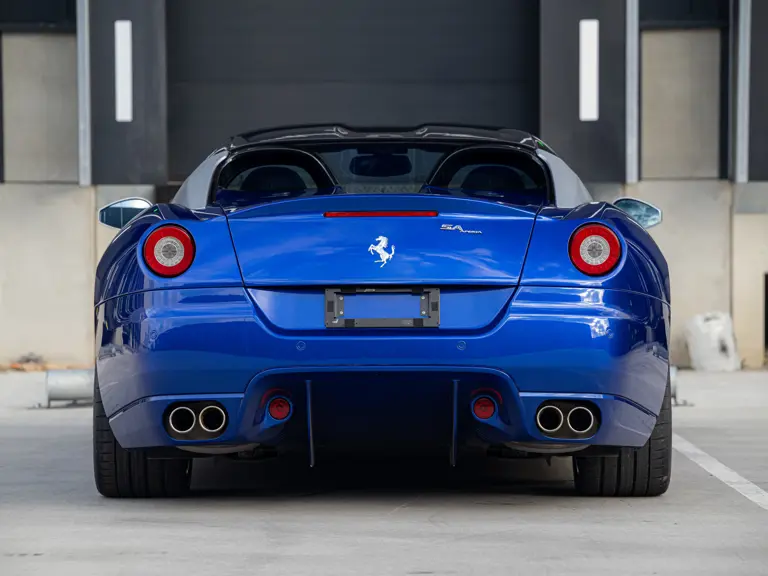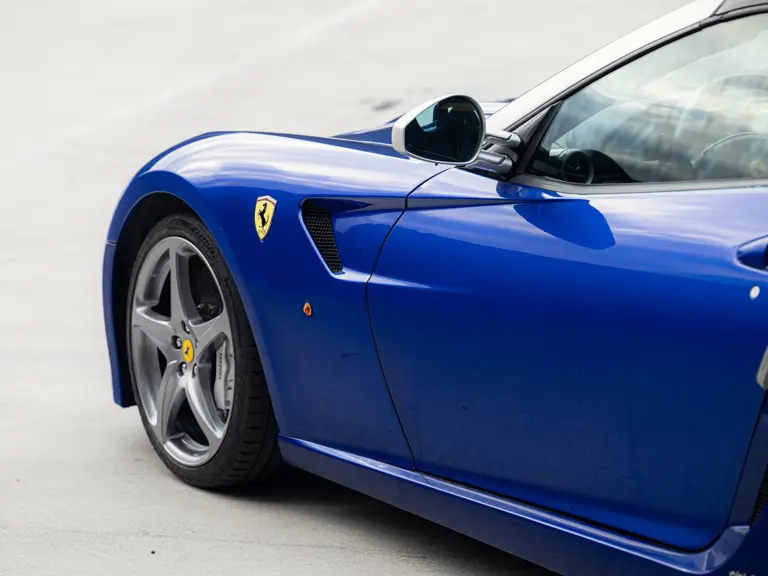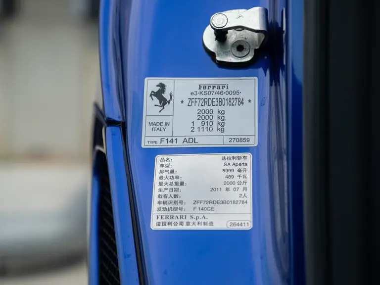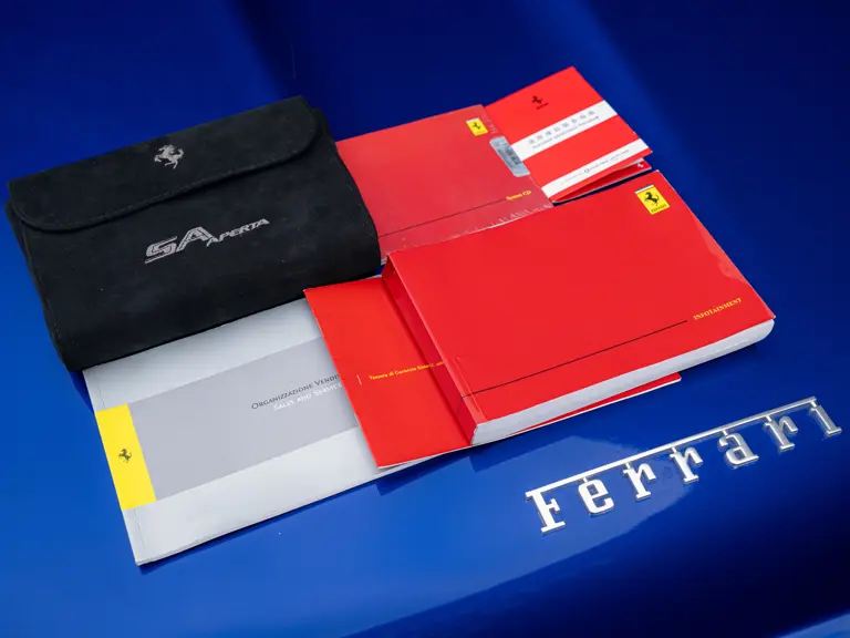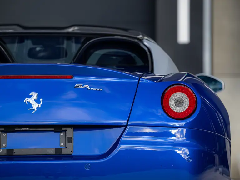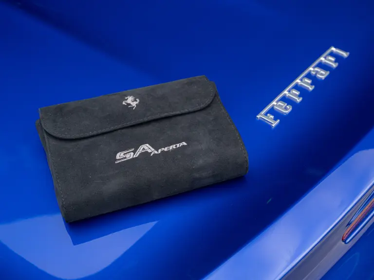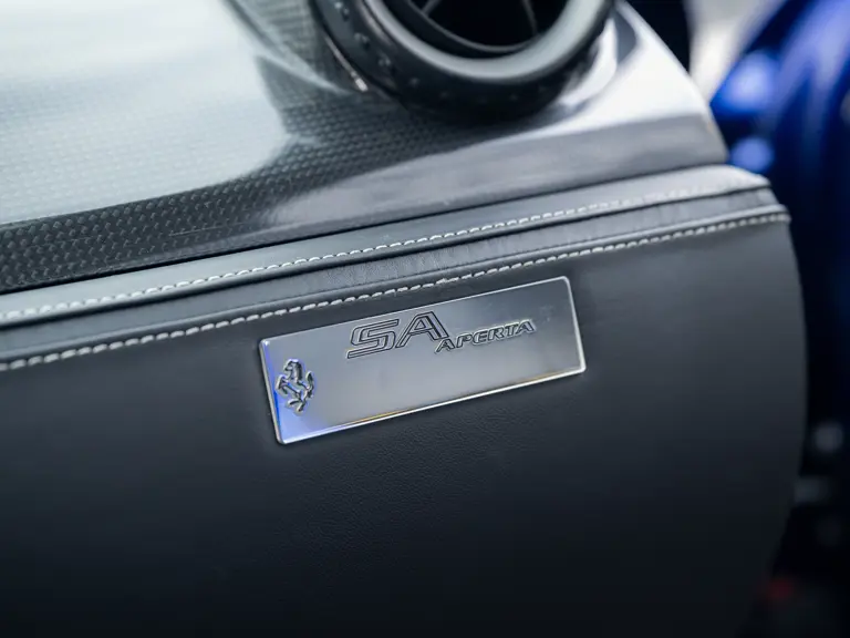 The example offered here is noted have been built in left-hand-drive form for the Chinese market. Here, it is believed to have had just three owners from new, and the odometer reads just 10,128 kilometres at the time of cataloguing. Finished by the Maranello factory in Extra Campionario—or special order—Blu Elettrico over a Nero leather interior, the SA Aperta was further specified with desirable optional extras including the extensive application of carbon fibre namely to the sill plate, door panels, centre console, and dashboard accents. Daytona-style seat upholstery finished in Nero is complemented by Grigio Chiaro interior stitching. The Ferrari is presented with the exclusive carbon fibre hard top roof, together with a colour-matching blue soft-top.