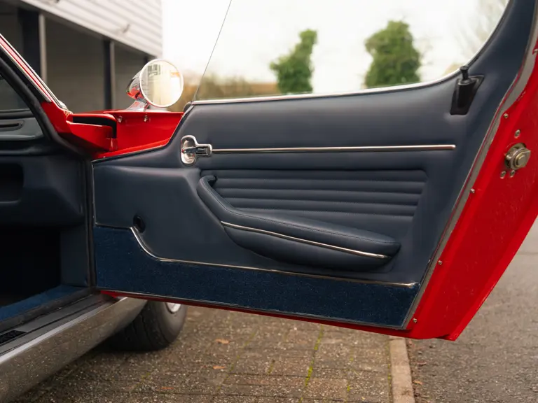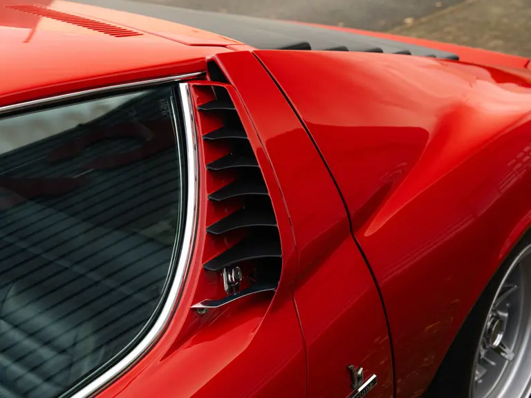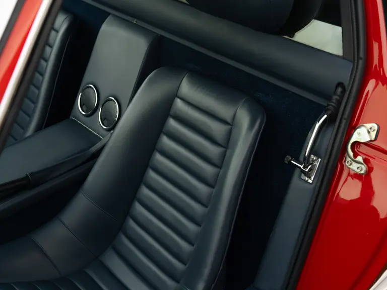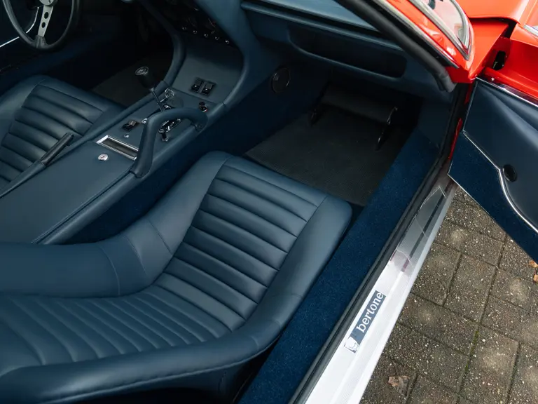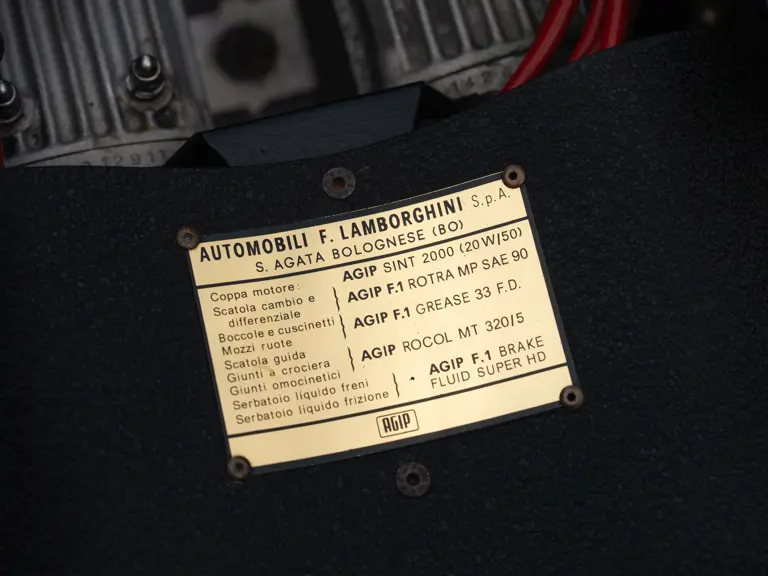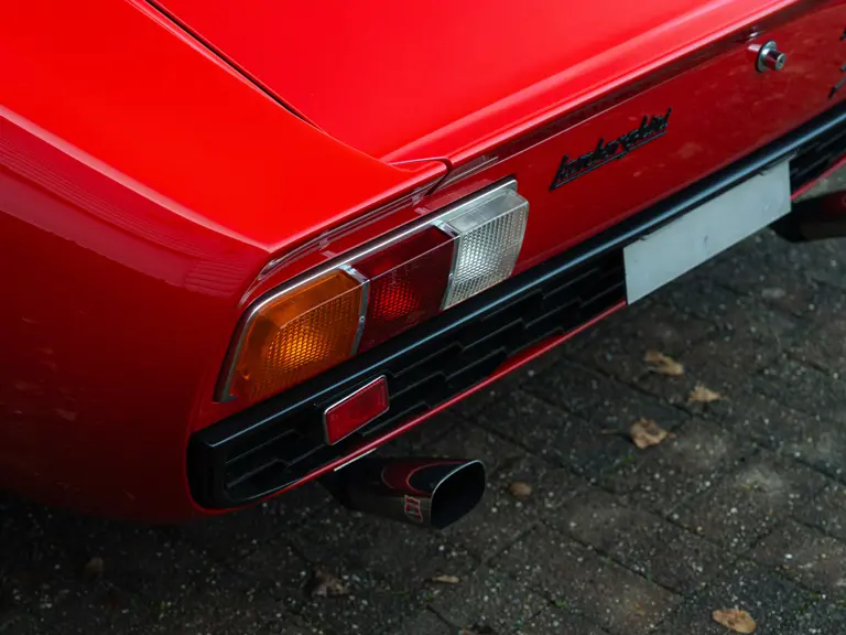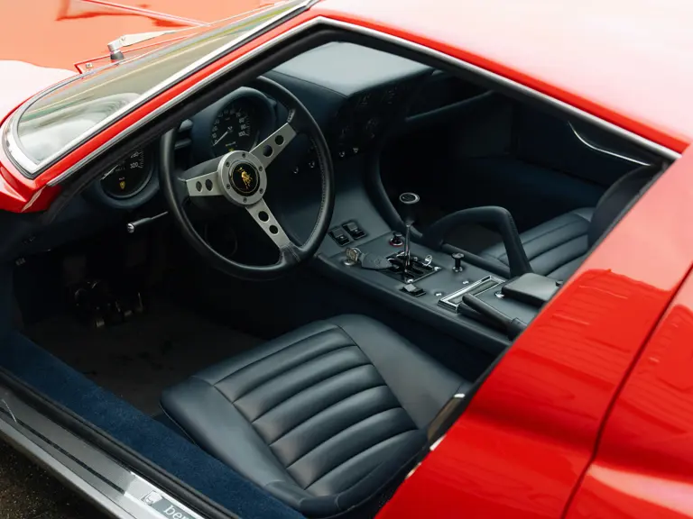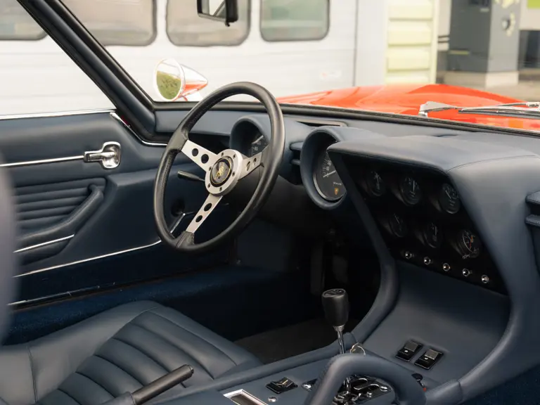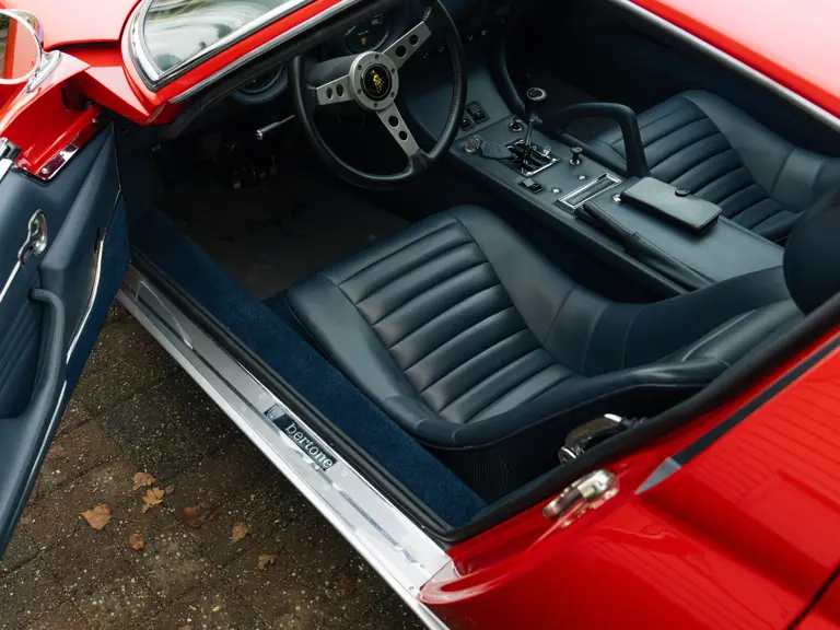 Its previous owner acquired the car in 2015 from the Dr Oetker collection and, after careful consideration, decided to embark upon a cosmetic restoration of the car to the June 1971 factory specification. The restoration of the body and paintwork was carried out by Carrosserie Battaglia-Bolognesi in Ferrara, who took the bodywork back to bare metal once again, removing the Jota elements and installing original retractable headlights, before repainting the car in Rosso Corsa. The interior was retrimmed in dark blue by Auto Interni and the mechanical elements, including the fitment of a non-Jota exhaust system, were given a thorough once over by marque specialist Top Motors, run by ex-Lamborghini foreman Orazio Salvioli and his son Luca.