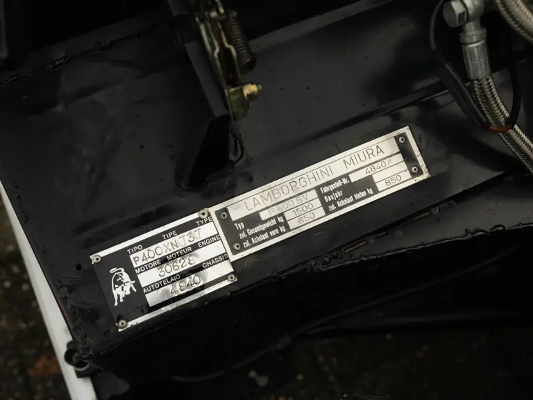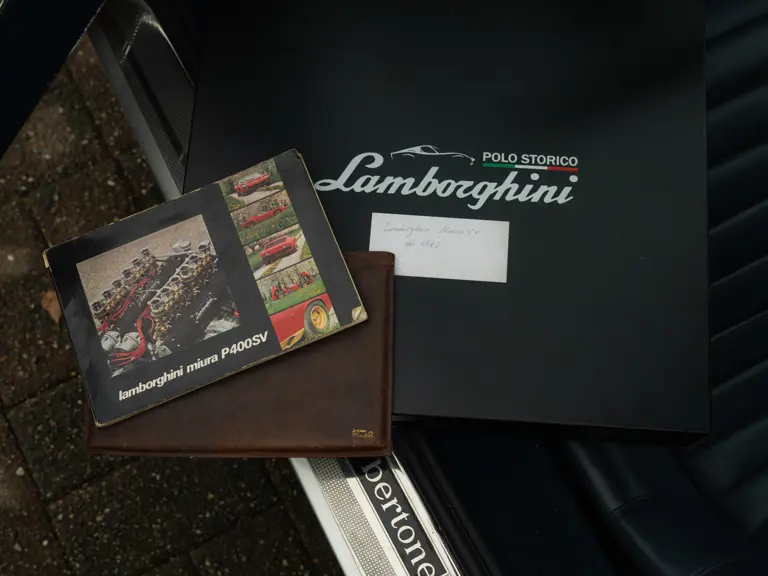 Completed in 2016, chassis 4840 was purchased by the consignor in 2021. Enjoyed since, this Miura SV presents wonderfully and benefits from a major service carried out by Mythic Motors in April 2024. Certified by Lamborghini Polo Storico, it retains its matching-numbers V-12 engine and is accompanied by the certification documents. Furthermore, the car is offered with a Lamborghini leather folio, owner’s manual, tool kit, and the old German Fahrzeugbrief, which details the previous owners back to 1972.