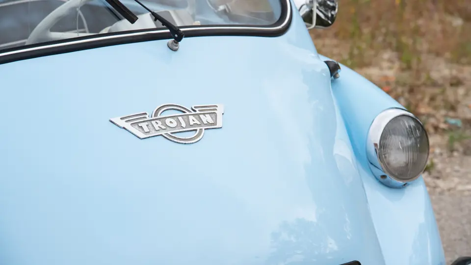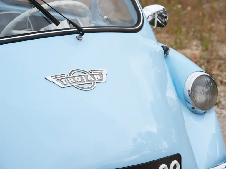 Este Trojan 200 é uma versão rara, de condução à esquerda e instrumentação com escala métrica, aparentemente destinado à exportação para a Europa. Apresentado em azul claro sobre couro preto, é um microcarro interessante e raramente visto.
