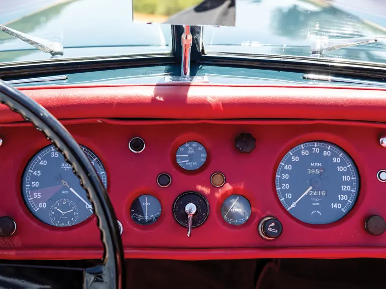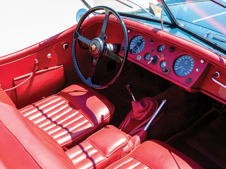 Differentiated from its C-Type-head-equipped brethren by the ‘A’ in its chassis number, this Jaguar XK 140 SE boasts the crankshaft dampener, wire wheels, dual exhaust, twin fog lamps, and windshield washers as delivered by the factory in the SE (or ‘M’ for North American specification) package. Presently, it sports an attractive blue-over-red colour scheme from an older restoration and is an ideal driver-quality car.