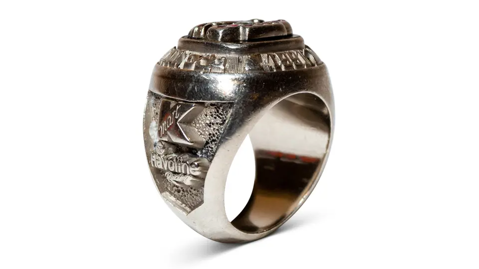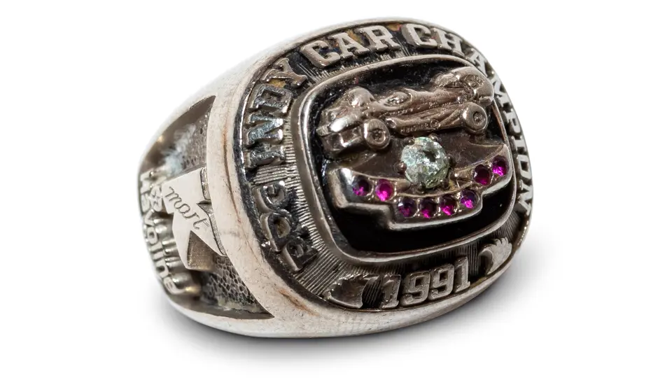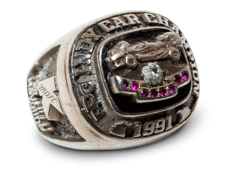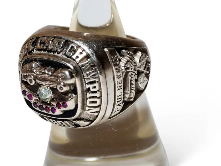 Featuring an Indy car above a diamond and eight purple stones, inscribed to Paul Newman and featuring Newman Haas Racing and Lola logos