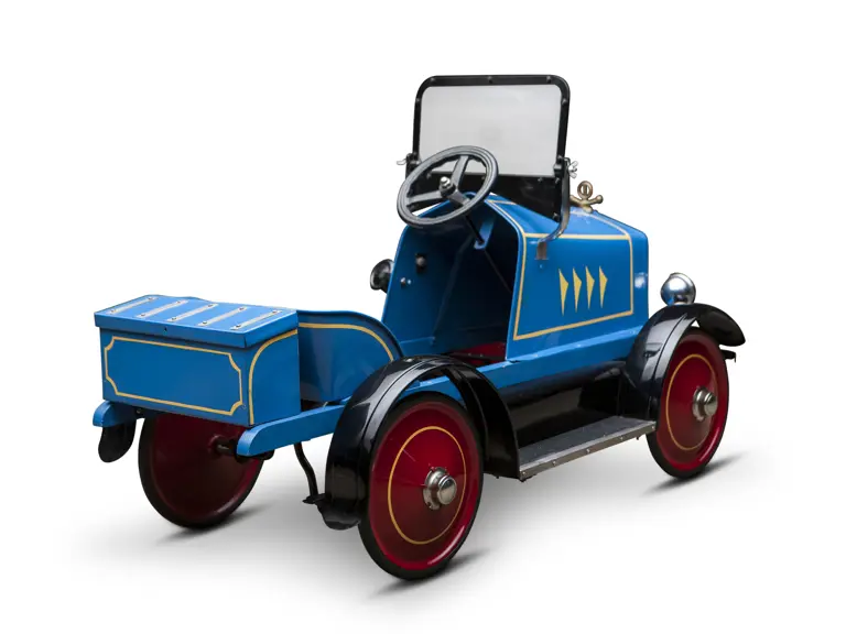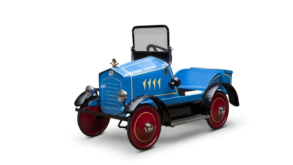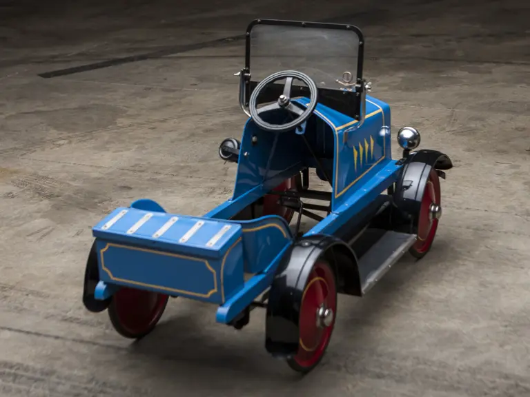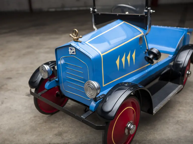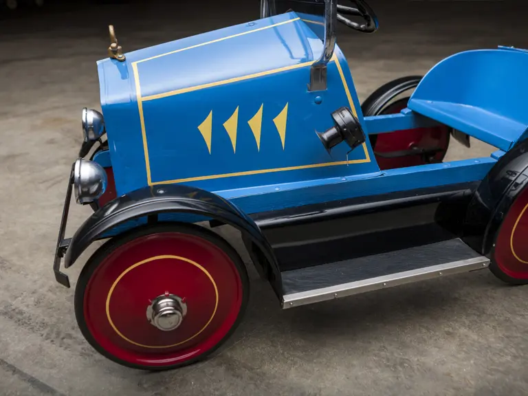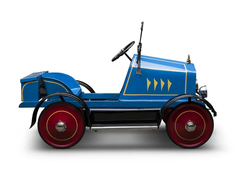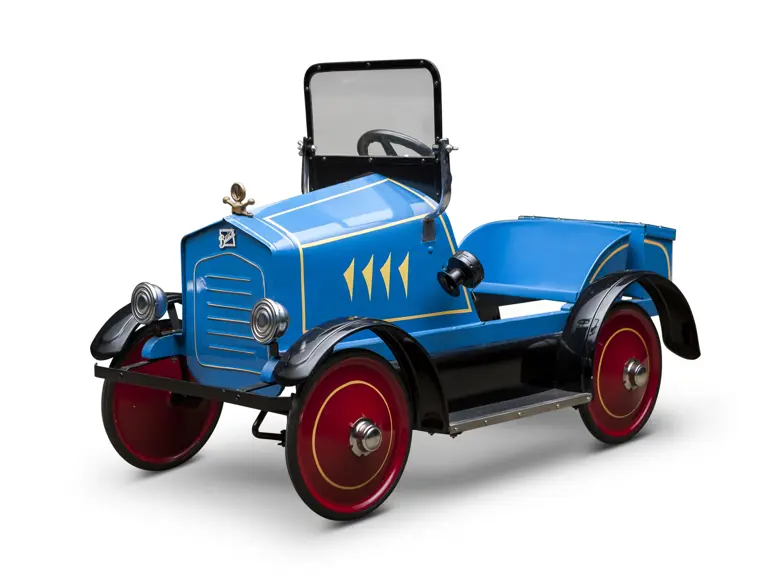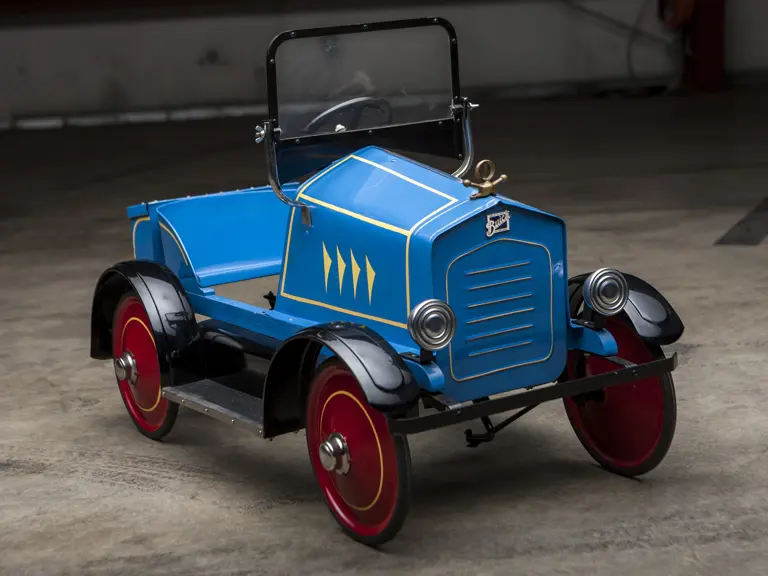 The Uhlen Carriage Company of Rochester, New York, produced this Buick-style pedal car in 1927. Composed of a wood frame wrapped in sheet metal, it also has a suspension system for a smooth ride.