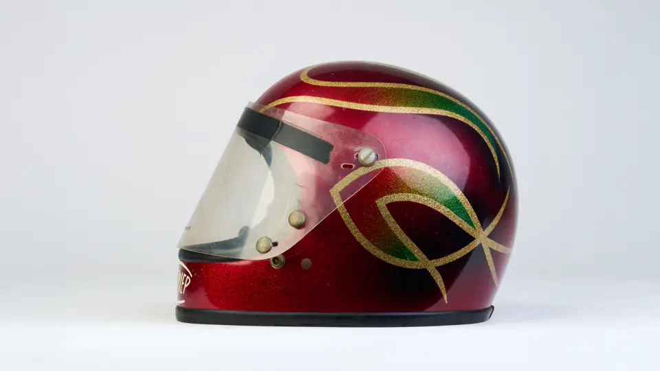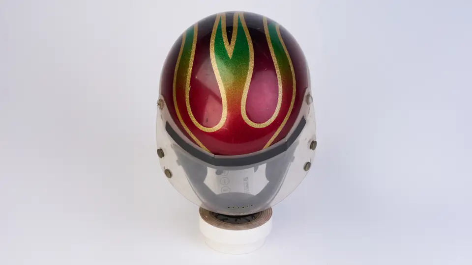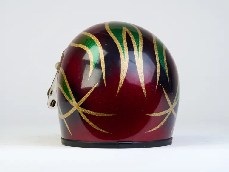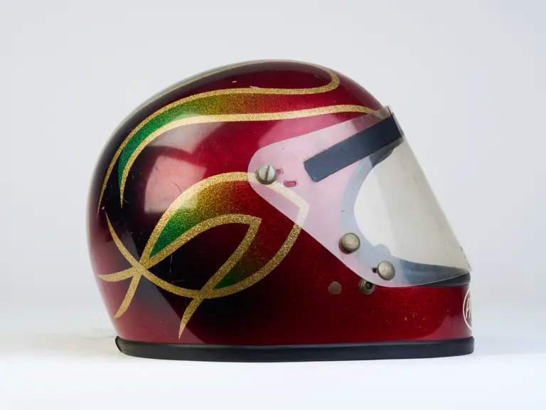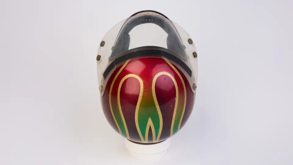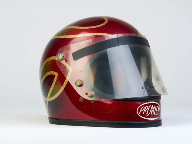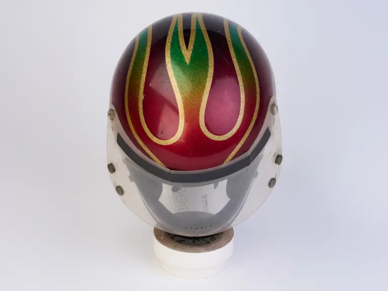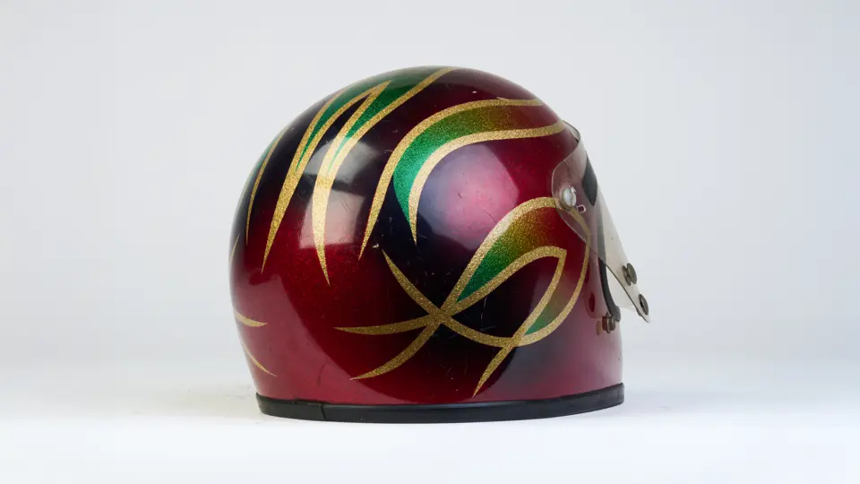 A go-karting helmet worn by Nigel Mansell in his early racing days.