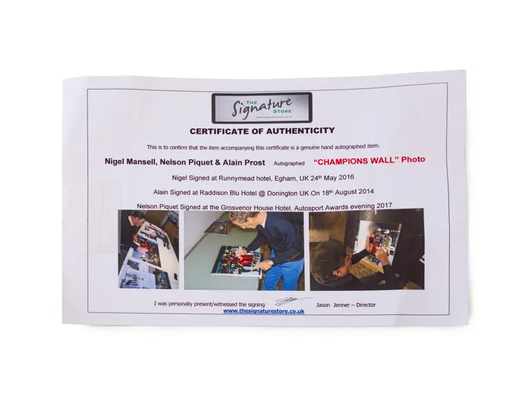 Accompanied by a Certificate of Authenticity. Signed by Nigel Mansel, Nelson Piquet and Alain Prost.
