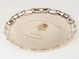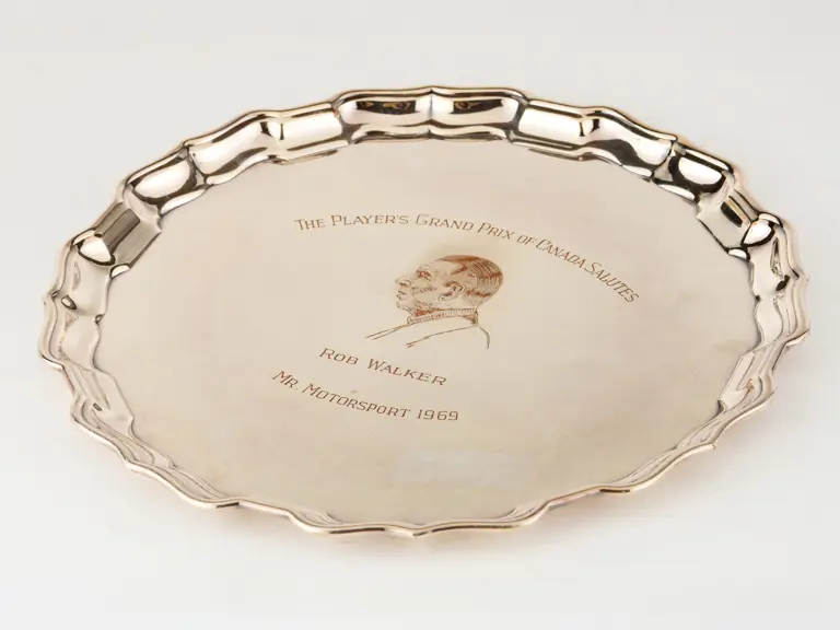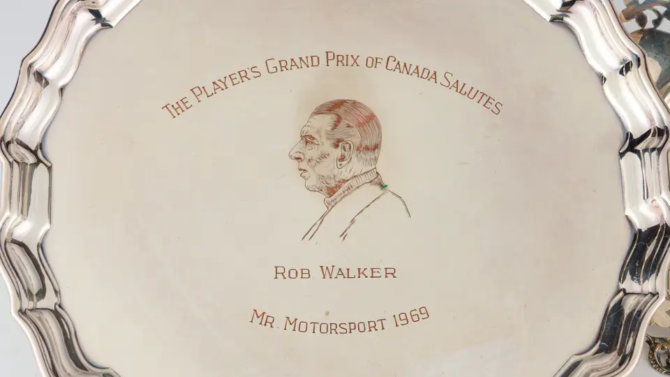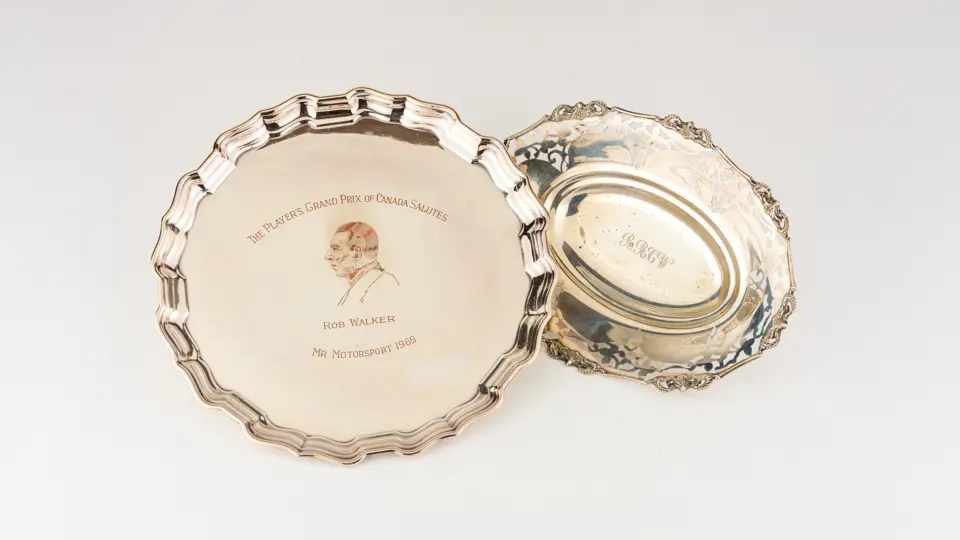 Includes an electroplated silver salver from the 1969 Canadian Grand Prix and an engraved stirling silver salver with Rob Walker's initials.