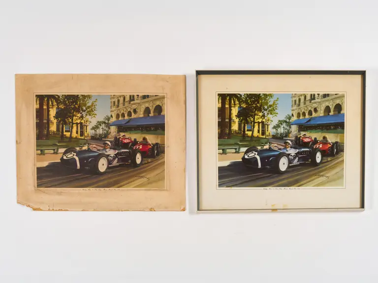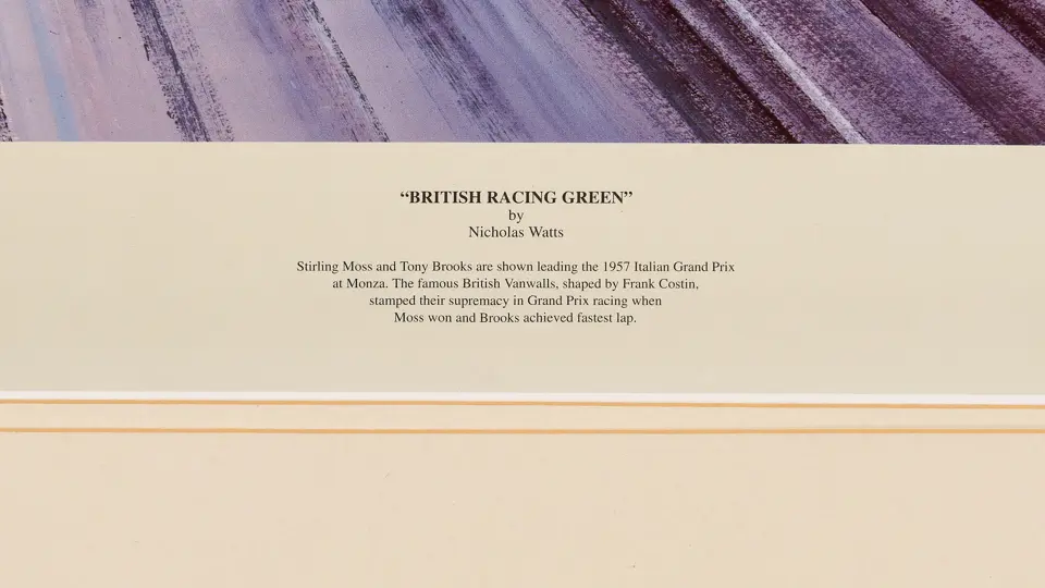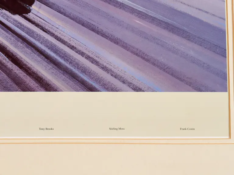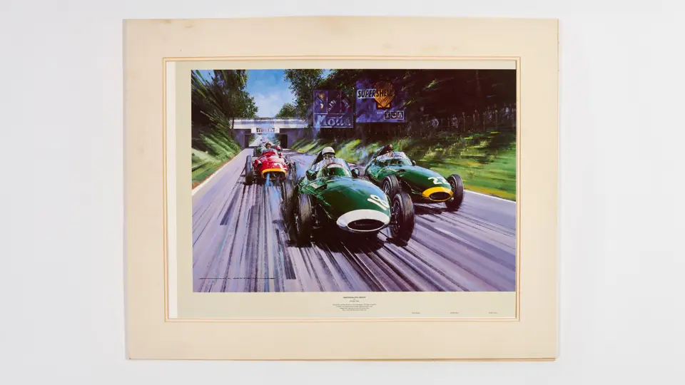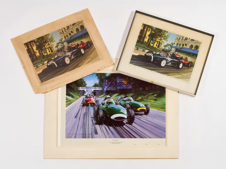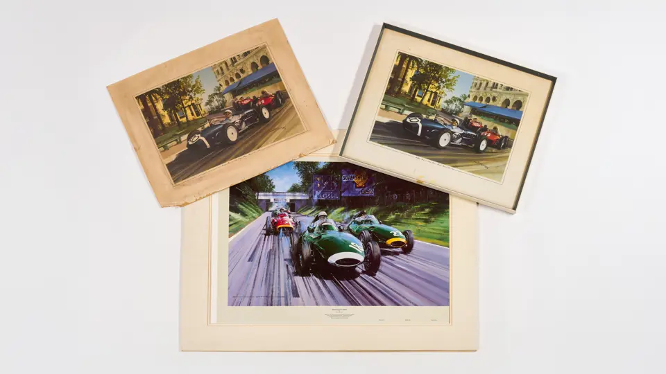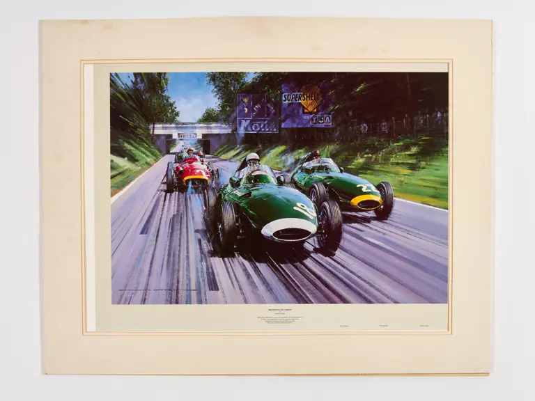 This lot contains two prints. The first depicts the 1961 Monaco Grand Prix with Stirling Moss in his 1.5-litre Lotus 18. The second is by Nicholas Watts and depicts Stirling Moss and Tony Brooks in their Vanwalls at the 1957 Italian Grand Prix.