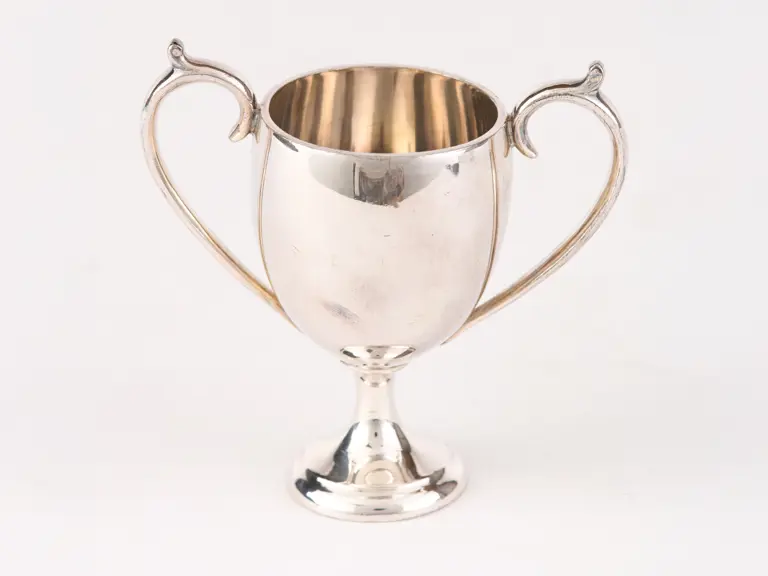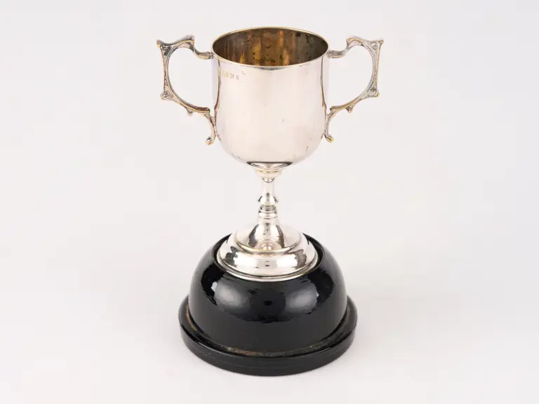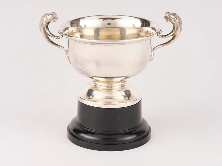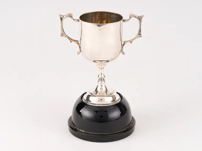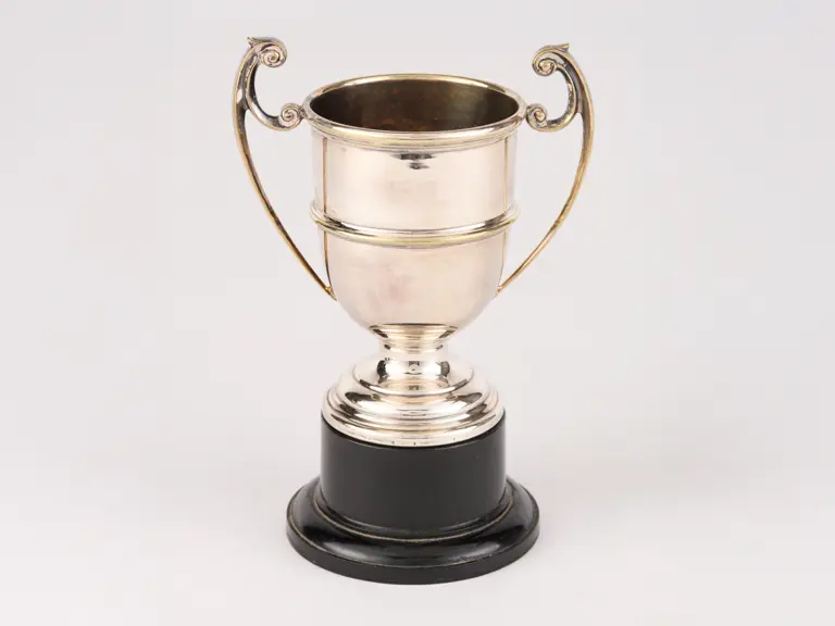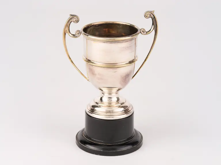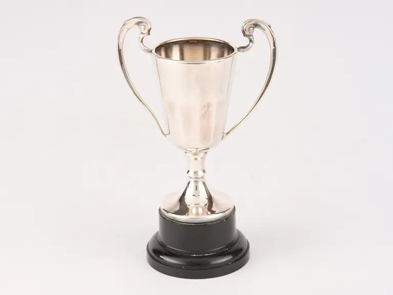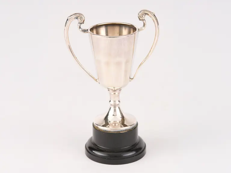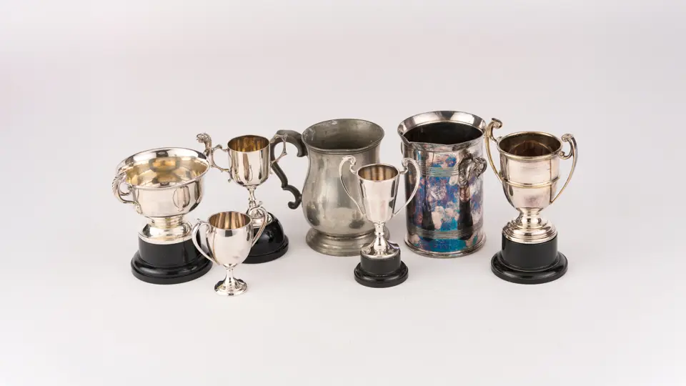 Eight assorted blank trophies, with four stamped as being electroplated nickel silver. Likely won by Rob at various regional speed trials but never engraved.