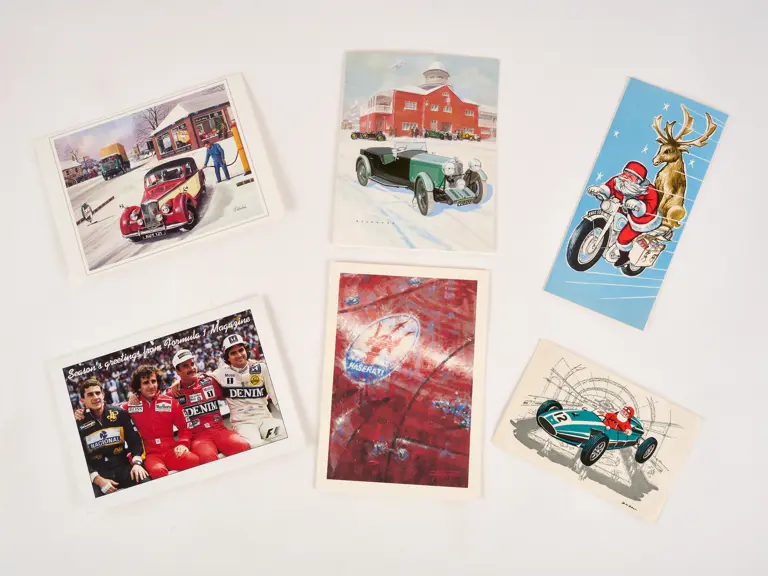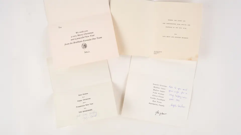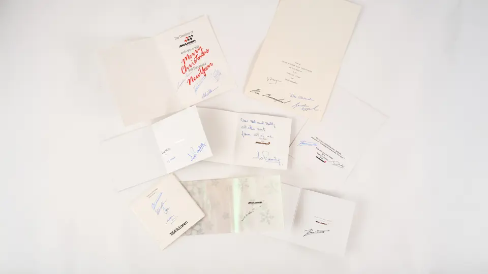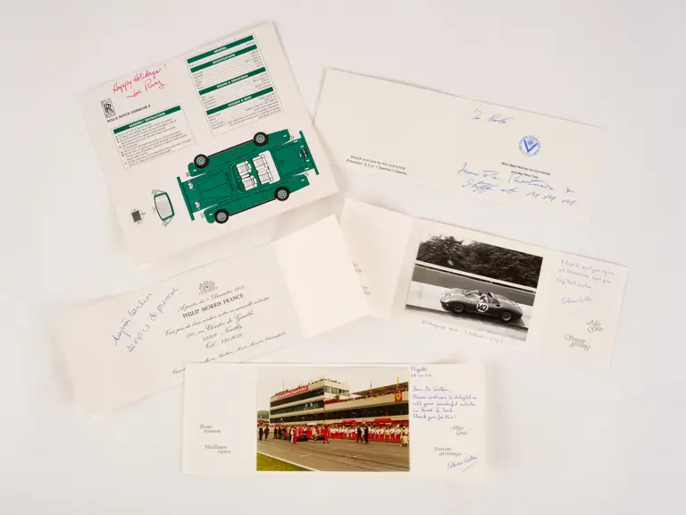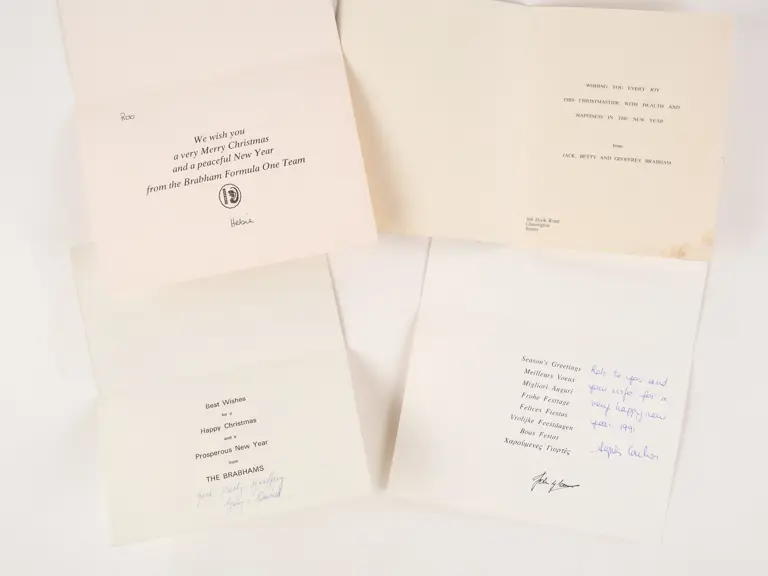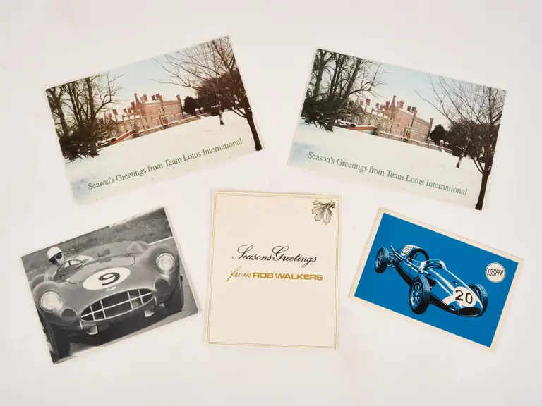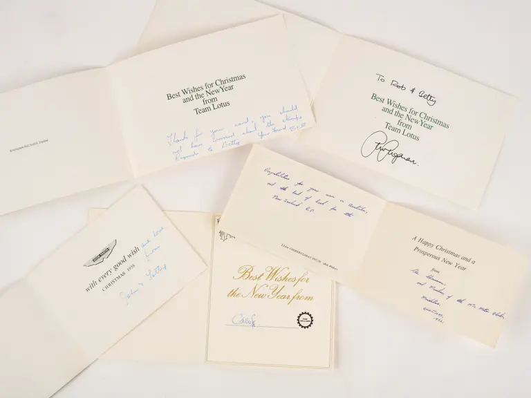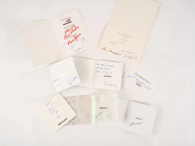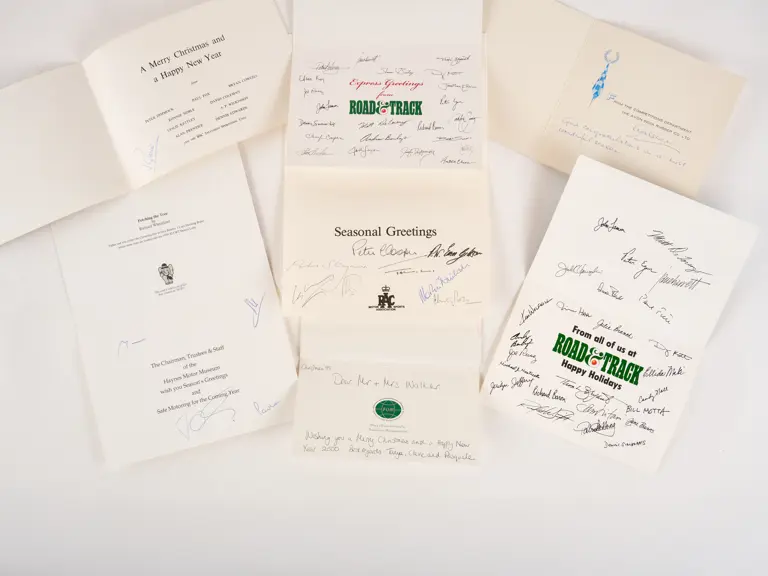This lot includes Christmas Cards from multiple years and are signed by the following: Stirling and Susie Moss, John Surtees, Gerhard Berger, Ron Dennis,Herbie Blash, Jo Ramirez, Teddy Mayer, Tyler Alexander, Gordon Coppuck, Tony Gaze, Dan Gurney, Gordon Murray, Bernie Ecclestone and many more.