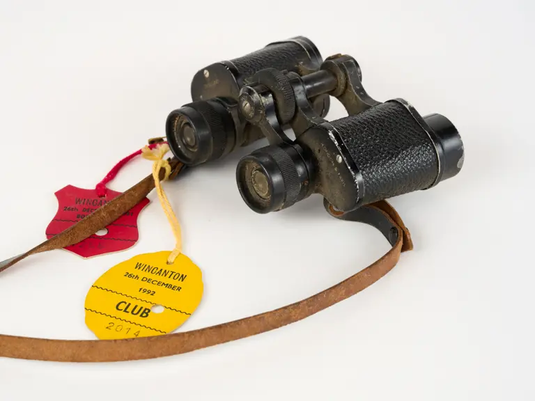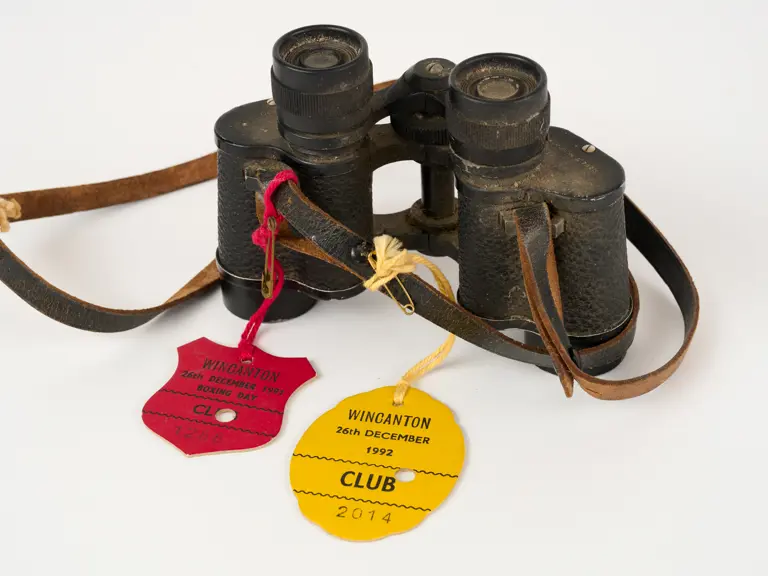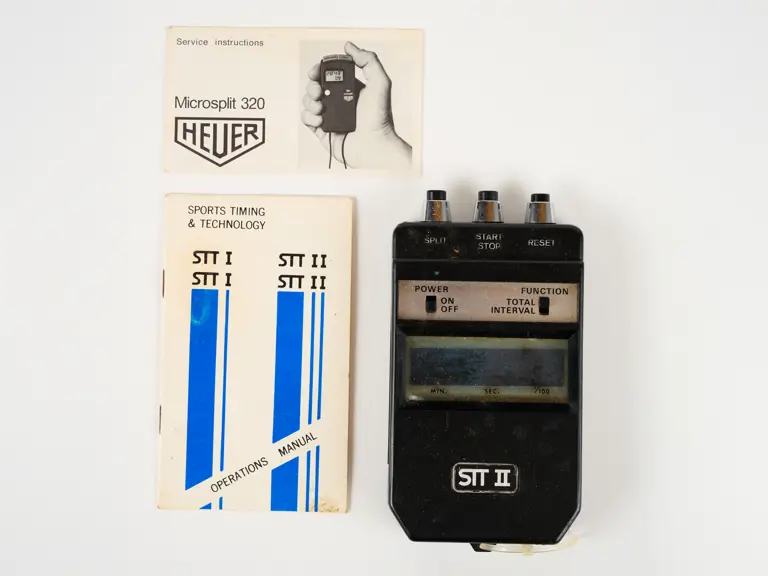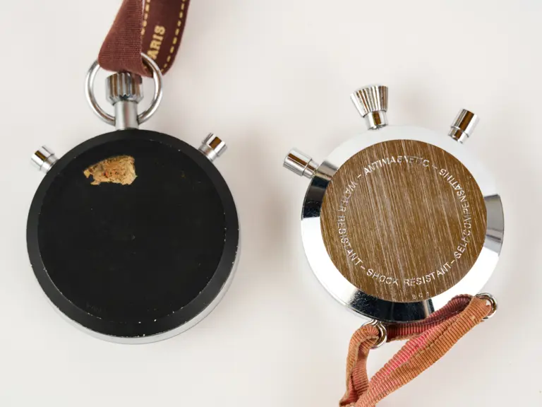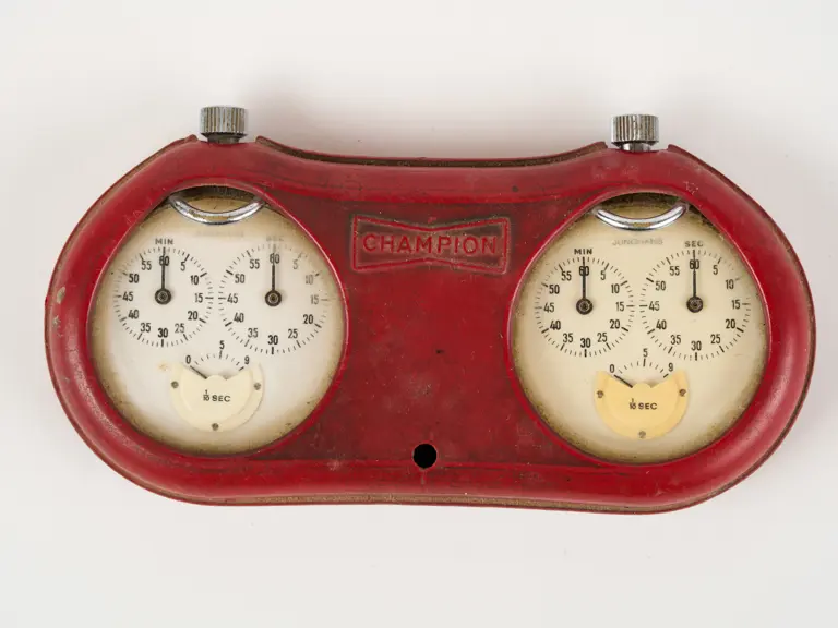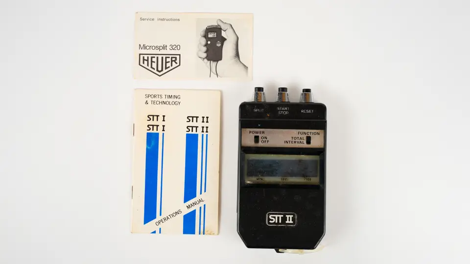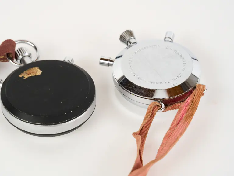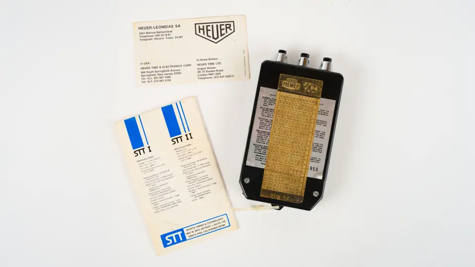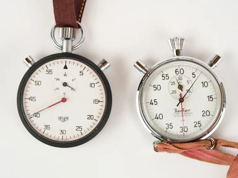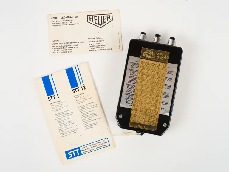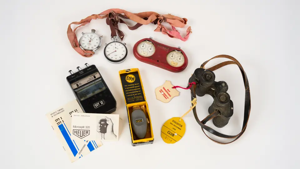 This lot includes five stop watches manufactured by Heuer, Hanhart and Champion. It also includes a lap counter and a pair of binoculars by Dolland.
