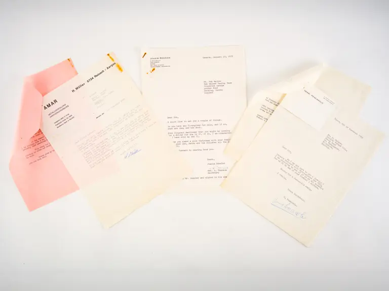This lot includes a variety of letters from Jo Bonnier, Brian Redman, Herbert Muller, Jacky Ickx, Henri Pescarolo. It also features letters regarding Siffert's 1968 British Grand Prix victory including Innes Ireland, Roy Salvadori and Raymond Mays.