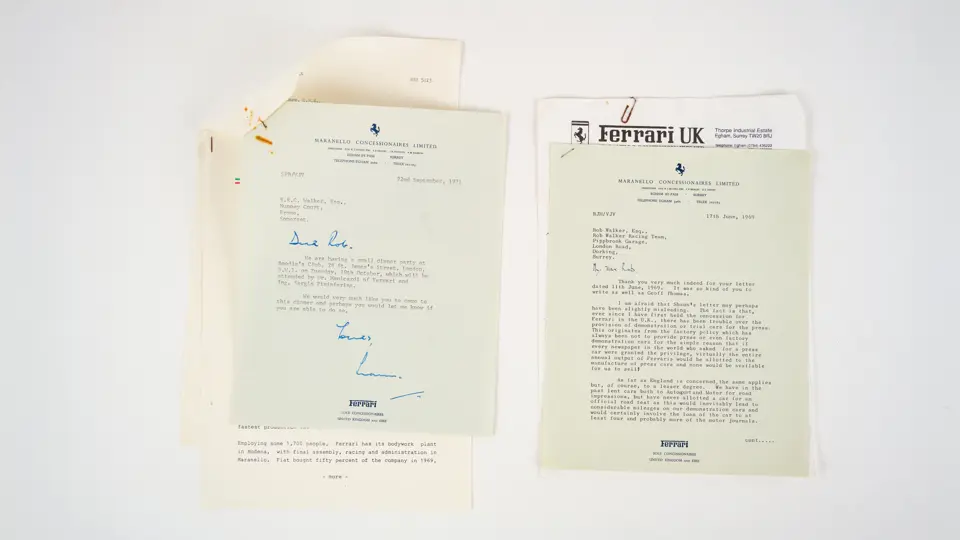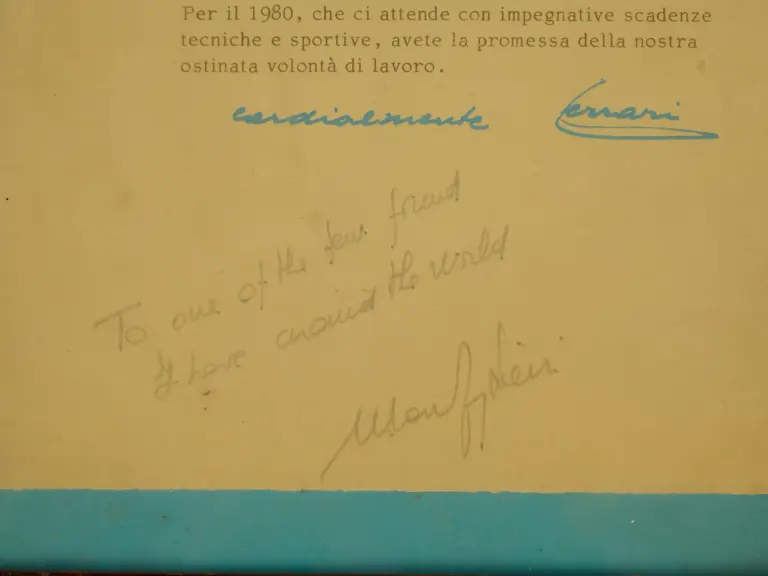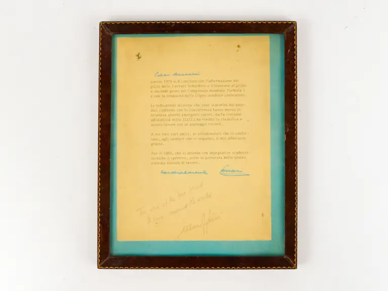 This letter from 1979 is signed by Enzo Ferrari to celebrate the 1979 Formula 1 World Championship. It is also signed by Mauro Forghieri from Maranello Concessionaires.