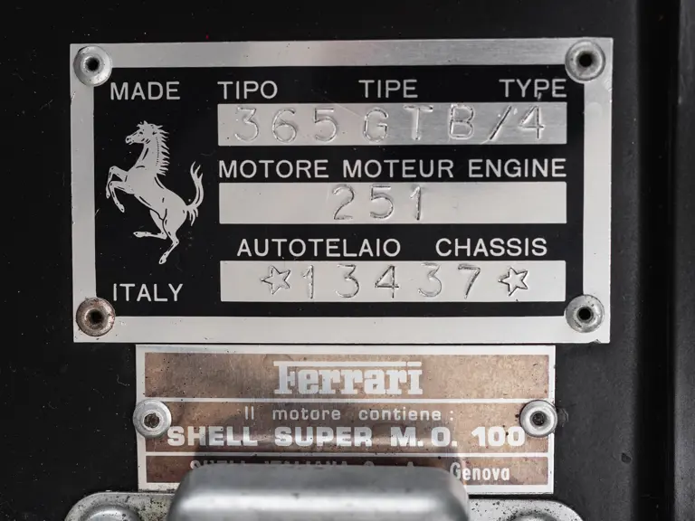 Originally delivered to Ferrari’s native Italy and built to European specifications, chassis number 13437 is one of just twelve 365 GTB/4 Daytonas that were originally finished in the highly attractive and very period-correct Verde Pino (106-G-30) paintwork. Trimmed in Beige Connolly (VM 102) leather and fitted with air conditioning, it was delivered to its first owner Giuseppe Pennacchi in Rome in May 1970.