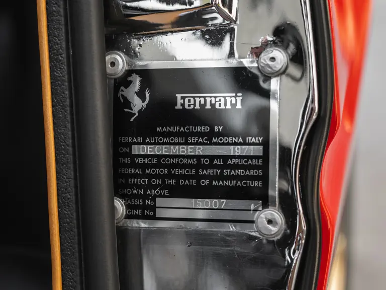 Completed by the factory in late 1971, chassis number 15007 falls approximately midway through Ferrari’s production run of the vaunted 365 GTB/4 Spider. A model originally envisioned and designed for the American market, this is where this particular car would be destined, finished in Rosso Chiaro (20-R-190) over a Nero (VM 8500) Connolly interior with red seat inserts. The car was earmarked for delivery to William F. Harrah’s Ferrari distributorship, Modern Classic Motors of Reno, Nevada, and arrived there sporting Italian EE (Escursionisti Esteri) tourist delivery plates in April 1972 according to a report compiled by Ferrari historian Marcel Massini.