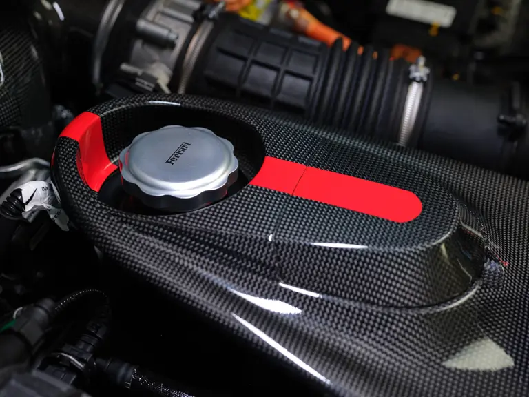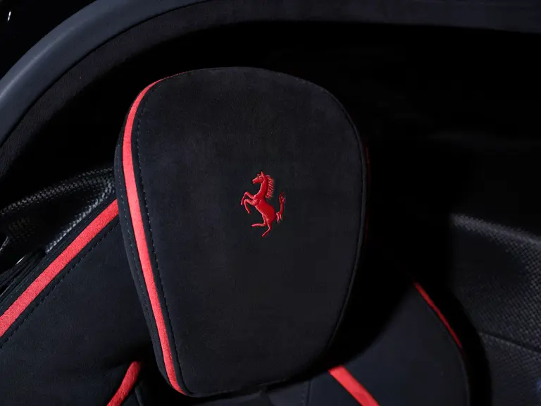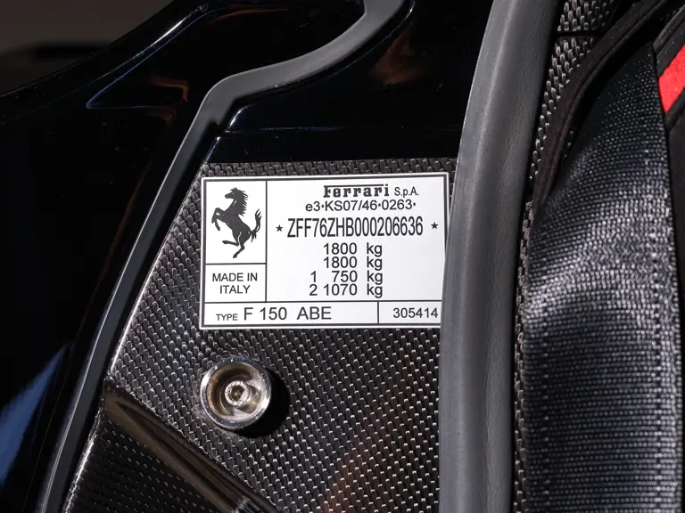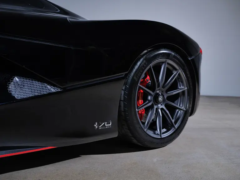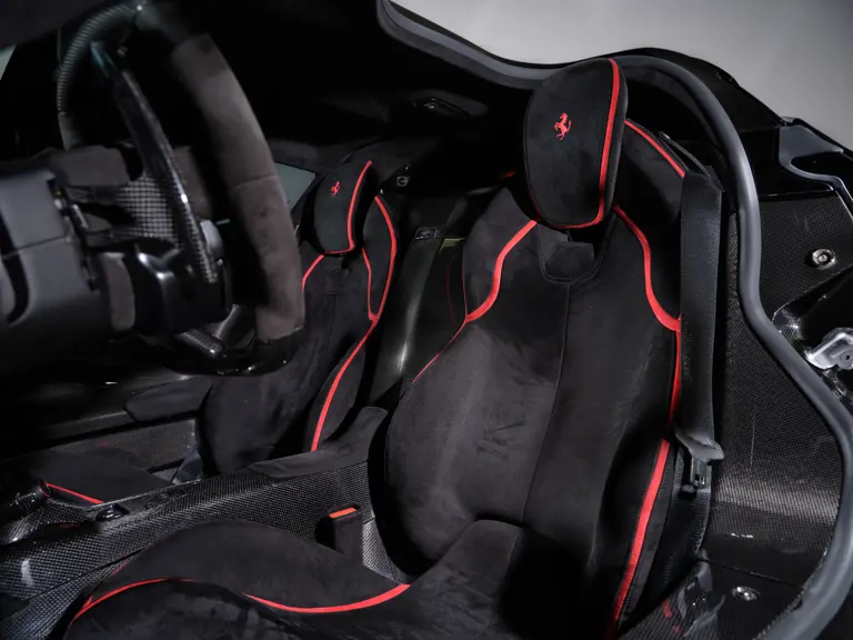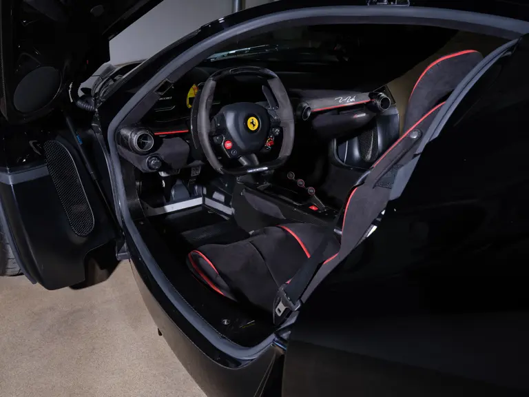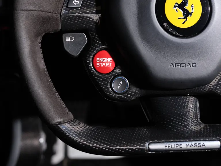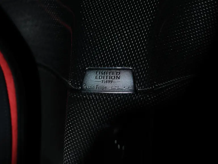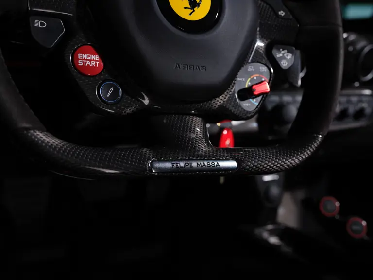 Inside, the black and red theme continues, with Rosso Corsa cavallinos stitched in the headrests of the medium-sized seats with Rosso Corsa piping, alongside a Rosso Corsa painted stripe on the carbon fibre dashboard. Further options included the suspension lifter and track camera kits. As a special touch, the car’s limited edition plaque between the seats was further embossed with the text “Grazie Felipe” and signed by then President and CEO of Ferrari, Luca di Montezemolo.