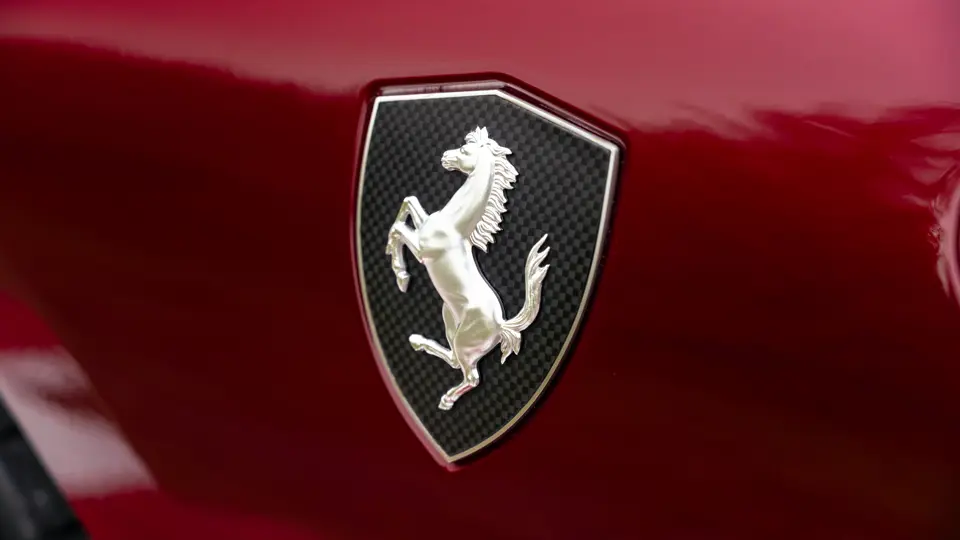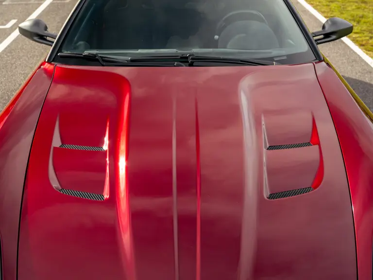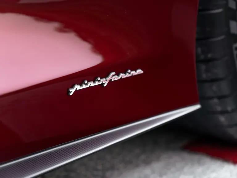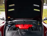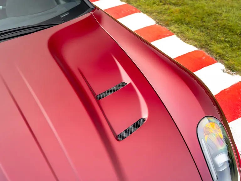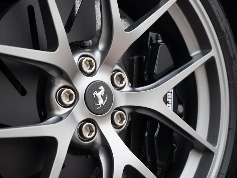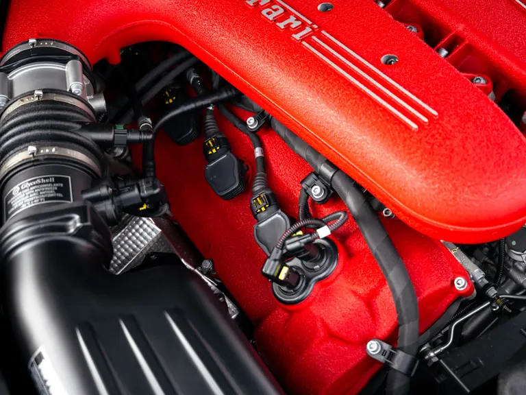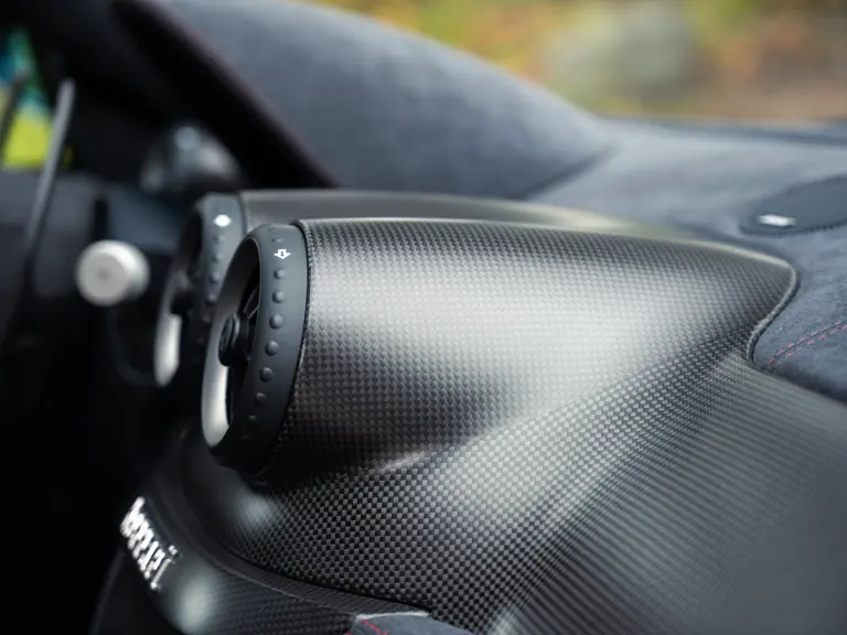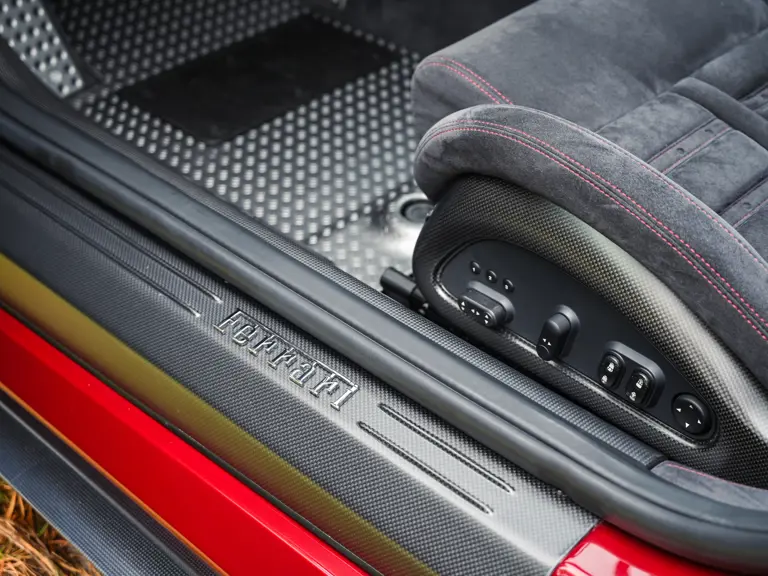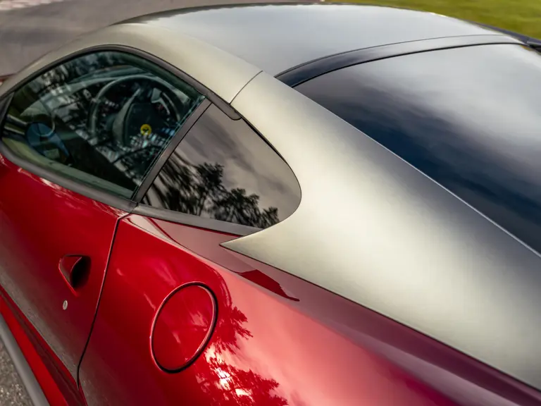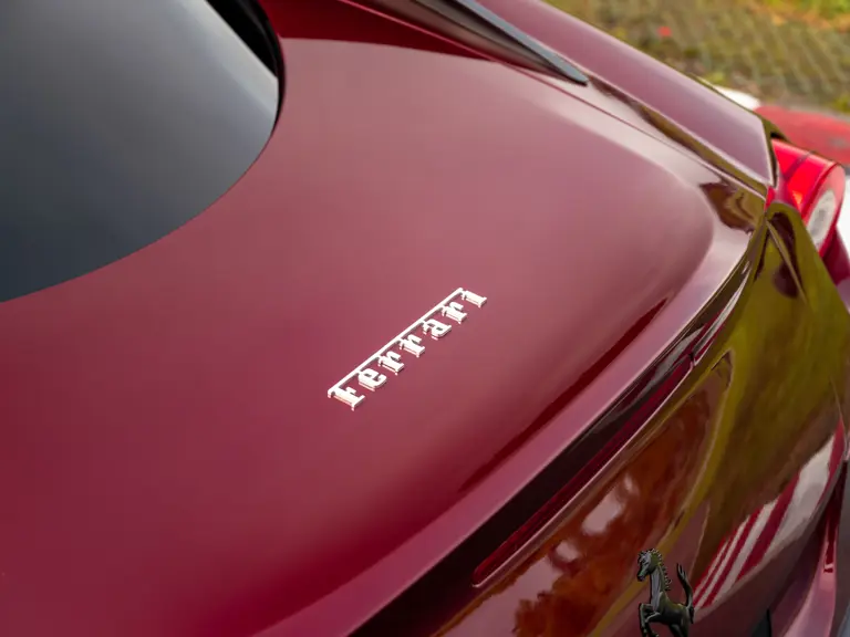 The specification announces itself at first glance. Rubino Micalizzato is classified as an “Extracampionario,” special order multilayer Ferrari paint color that rewards close viewing. In soft light it reads as deep red to burgundy. In direct sun it opens up with brighter ruby highlights and a metallic undertone that reveals a gold to bronze sparkle within the flake. The roof is finished in Grigio Silverstone Opaco. It is believed that the carbon Scuderia shields, an expensive Ferrari Genuine after-sales accessory, were installed by the delivering dealer, and sit on the front wings matching the center caps in carbon so that every exterior detail is in harmony.