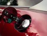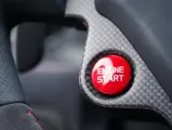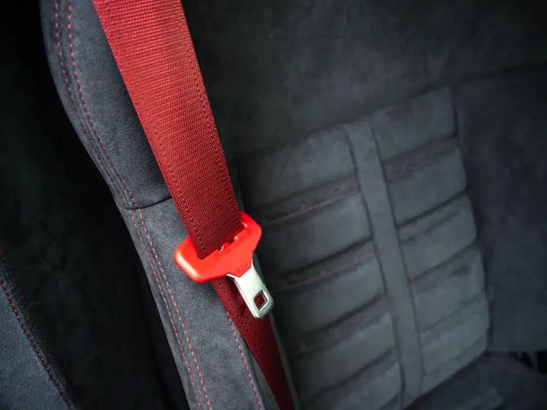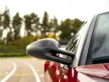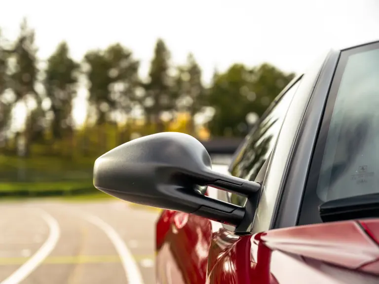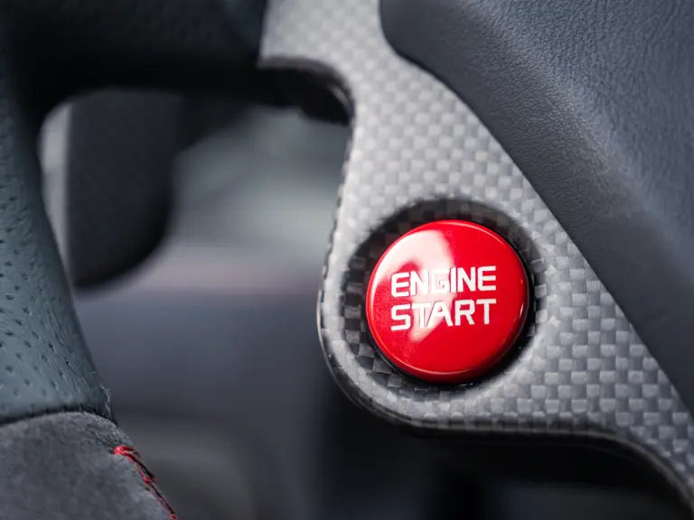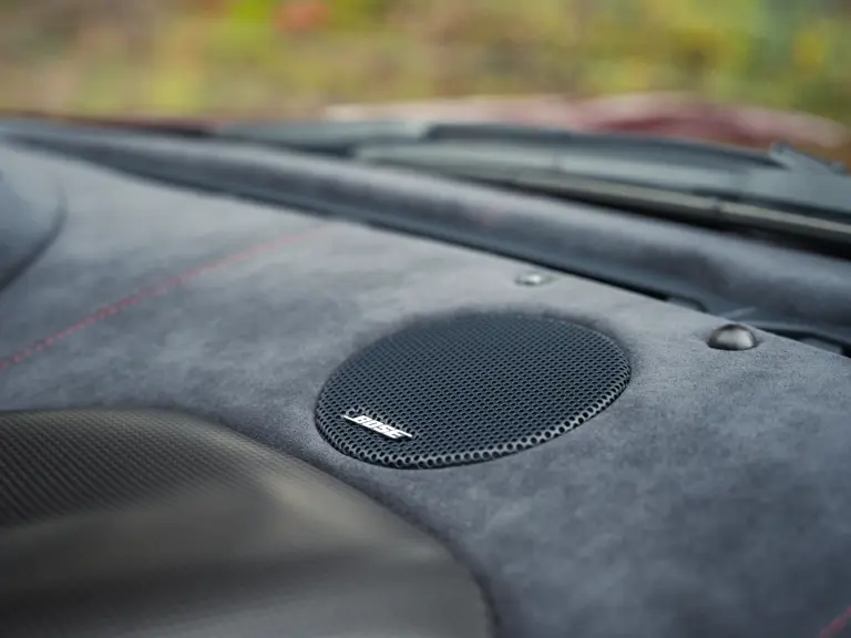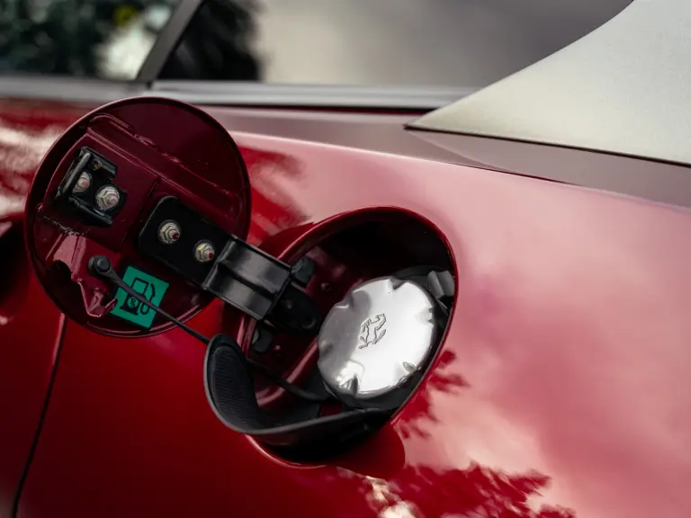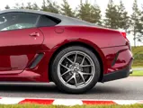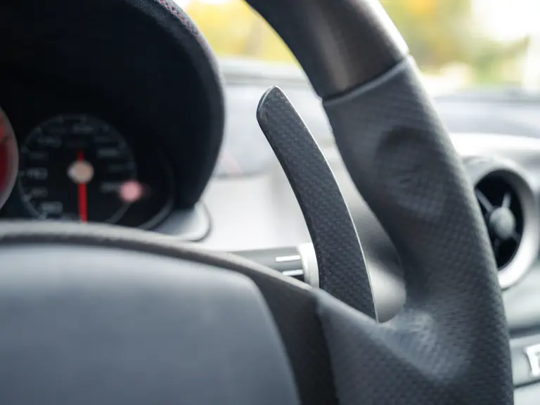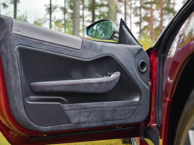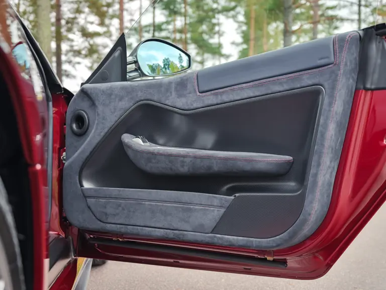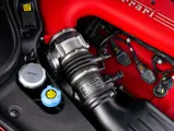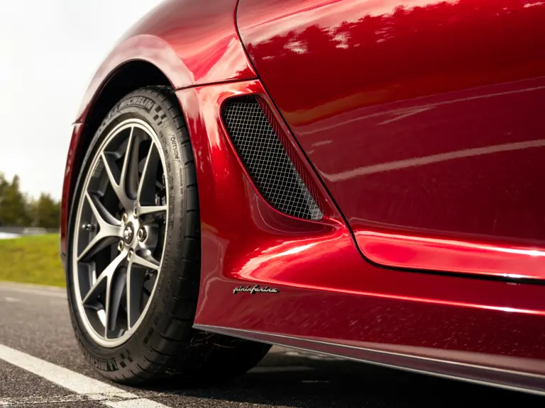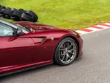 The specification announces itself at first glance. Rubino Micalizzato is classified as an “Extracampionario,” special order multilayer Ferrari paint color that rewards close viewing. In soft light it reads as deep red to burgundy. In direct sun it opens up with brighter ruby highlights and a metallic undertone that reveals a gold to bronze sparkle within the flake. The roof is finished in Grigio Silverstone Opaco. It is believed that the carbon Scuderia shields, an expensive Ferrari Genuine after-sales accessory, were installed by the delivering dealer, and sit on the front wings matching the center caps in carbon so that every exterior detail is in harmony.