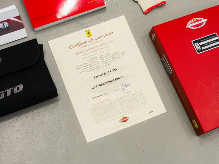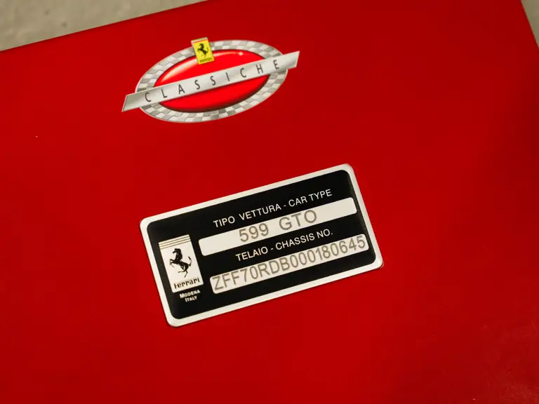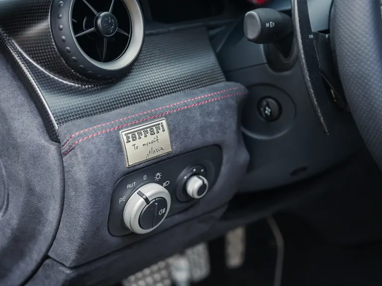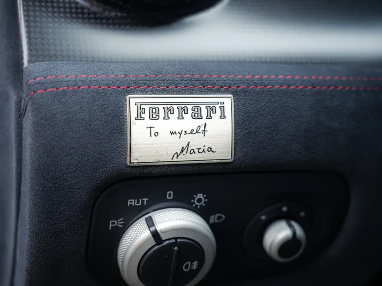 Commissioned by a female client in Greece as recorded by the original service book, this 599 GTO began life as a fully bespoke Atelier order. The consultation, approval, and build cycle for an Atelier commission was more involved and time-consuming than a standard order at the time. The dedication plate itself is a wonderful detail. It is hand-engraved in the original client’s own handwriting with the words “To myself Maria,” and it is positioned on the lower dashboard to the left of the steering wheel. The car was delivered new via Genesis S.A., the official Ferrari dealer just north of Athens in July 2011. In a recent conversation with Genesis S.A., they confirmed that Maria decided to leave the car in storage at the showroom, and it was never driven by her.
