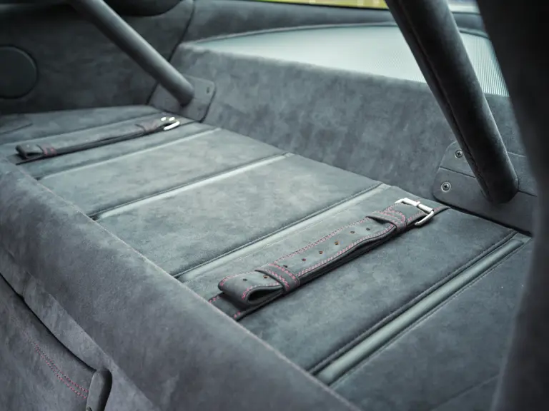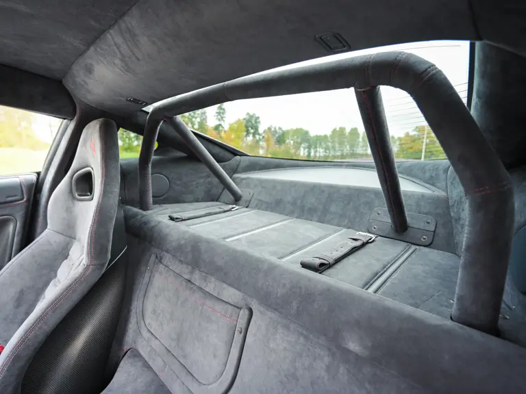 Inside, the car goes well beyond the standard palette. Blue Scuro Alcantara covers the entire cabin, including seats, steering wheel, dashboard, doors, and lower/upper trim, specified as an Extracampionario selection. The seat belts are Bordeaux rather than bright red, a great choice that ties the interior to the depth of the exterior. The rev counter is red. A factory-fitted roll bar speaks to the GTO’s intent. The result is truly spectacular to behold and boasts a level of specification that few, if any other examples, duplicate.