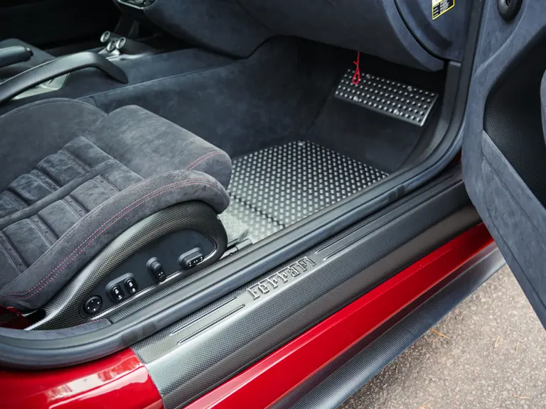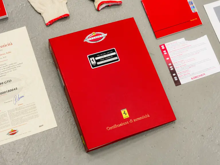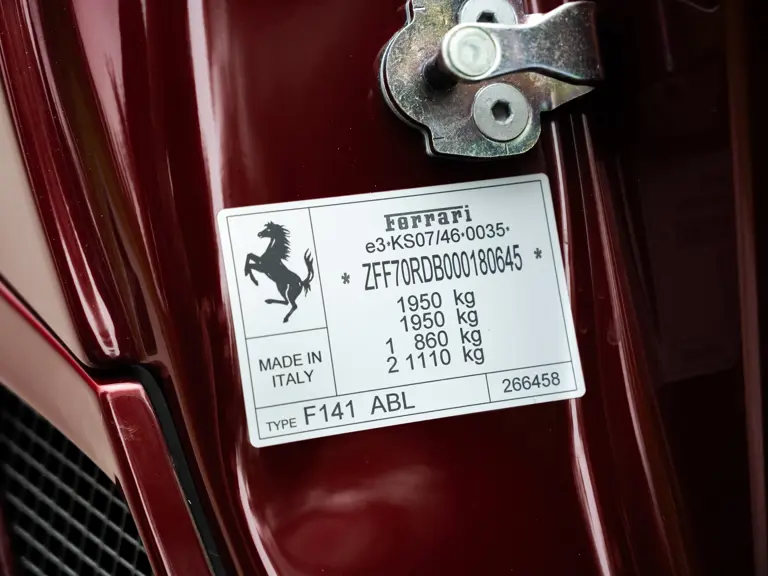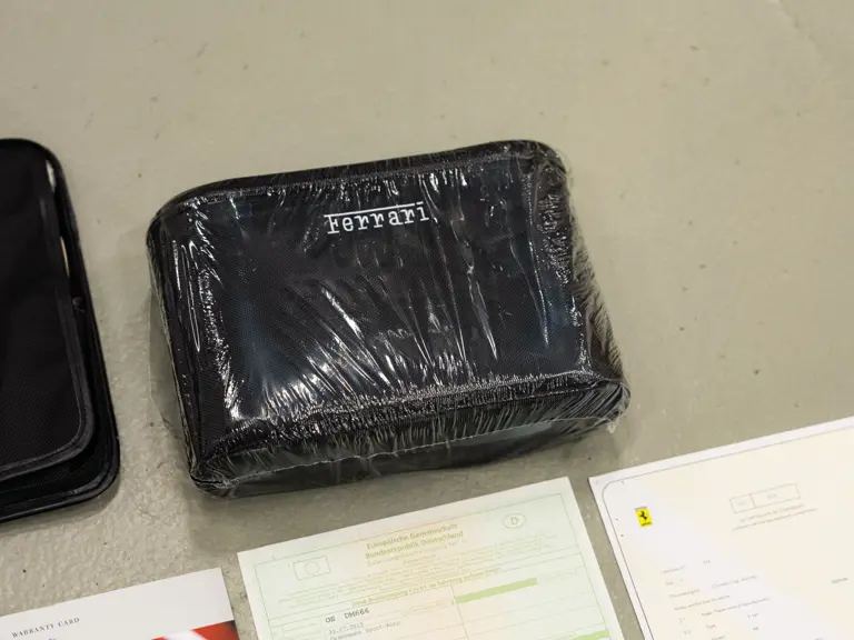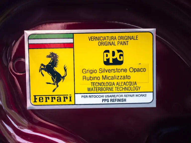 It is important to note that the car is accompanied by two keys, its original owner’s manuals with pouch, tool kit, tire inflator kit, radio code card, white maintenance gloves, and its Classiche certification binder confirming its sensational specification (which was delivered with the car when new). Further accompanying the car are two service tags from Maranello Service, the official Ferrari service center in Madrid, showing services in 2020 and 2023 at 1,348 km and 1,447 km respectively.