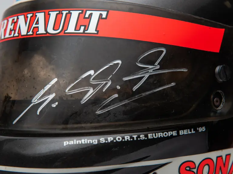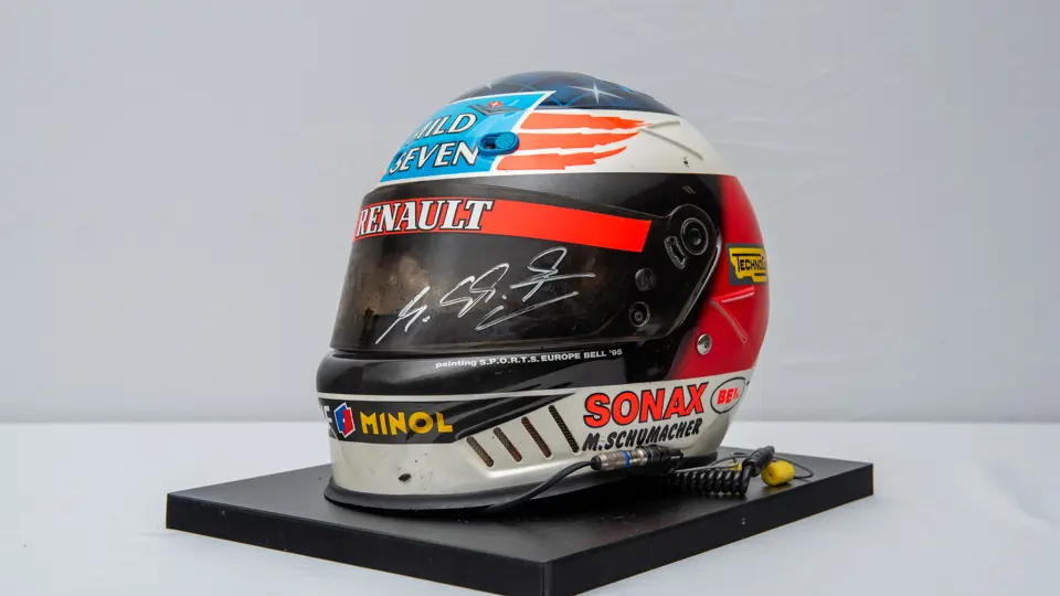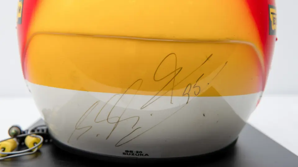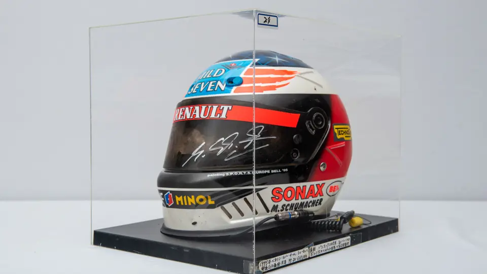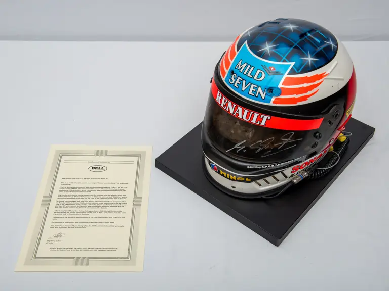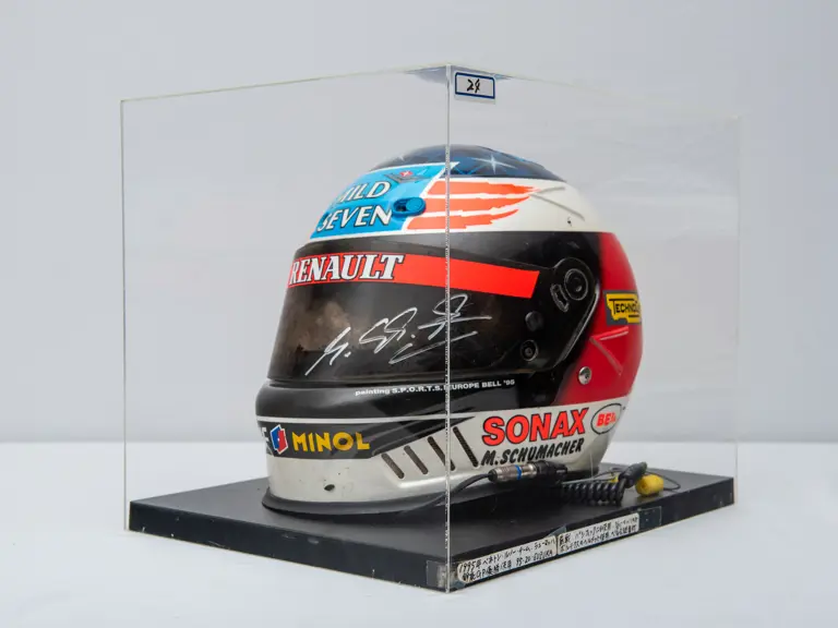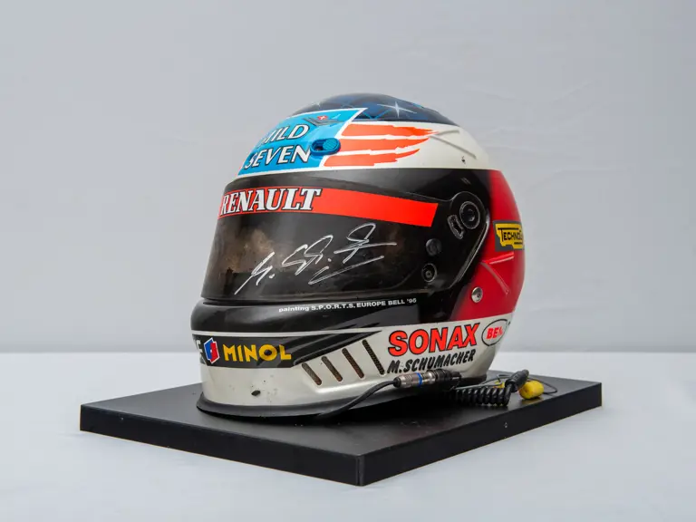 Confirmed by a Bell Certificate of Authenticity, this helmet was worn by Michael Schumacher when he raced for Benetton in the 1995 Japanese Grand Prix weekend. It is signed by Michael Schumacher. Qualifying in pole position, Schumacher set the fastest lap and finished first. As a result of Schumacher's victory, Benetton claimed the Constructors Championship Title for 1995. Schumacher was also Formula 1 World Champion that year.
